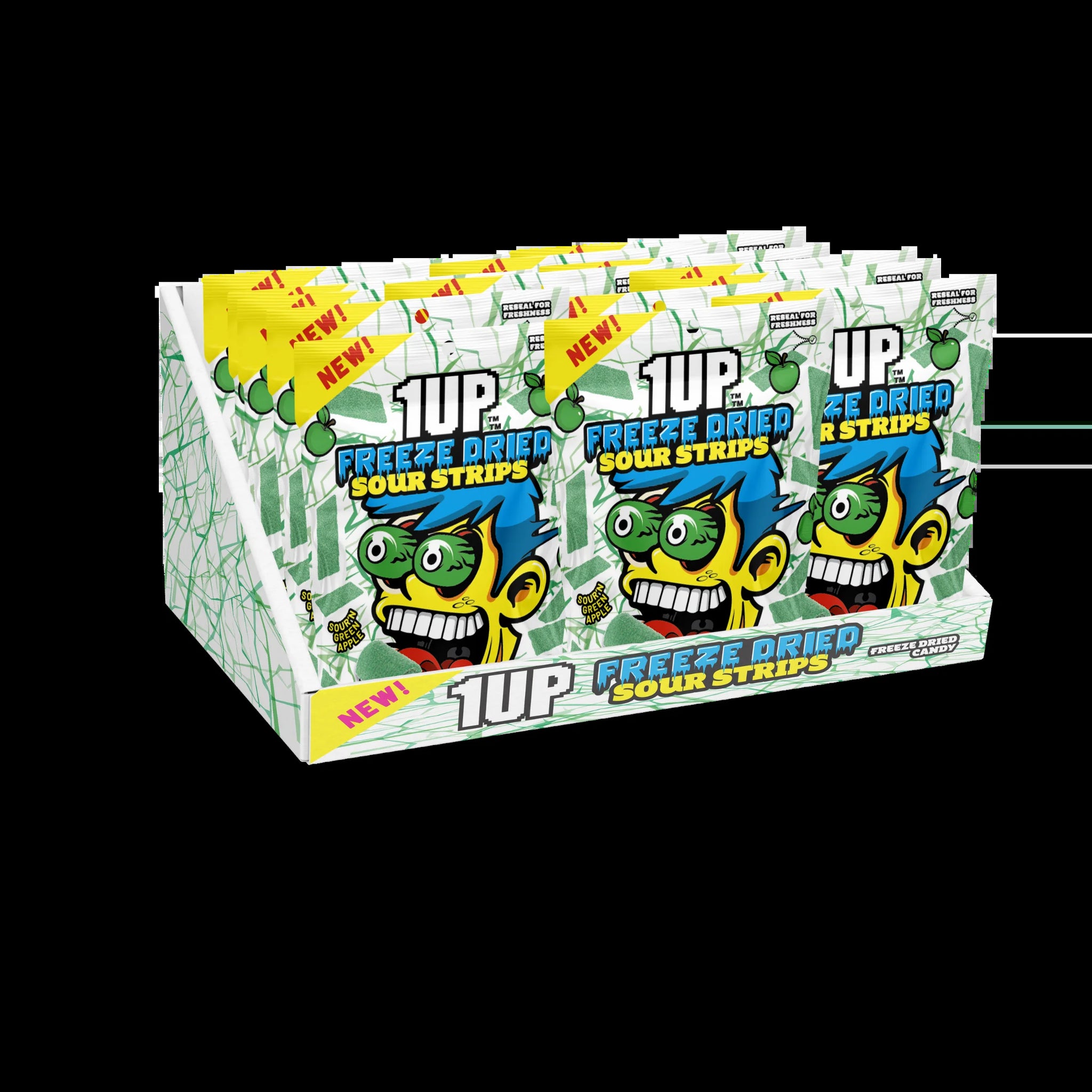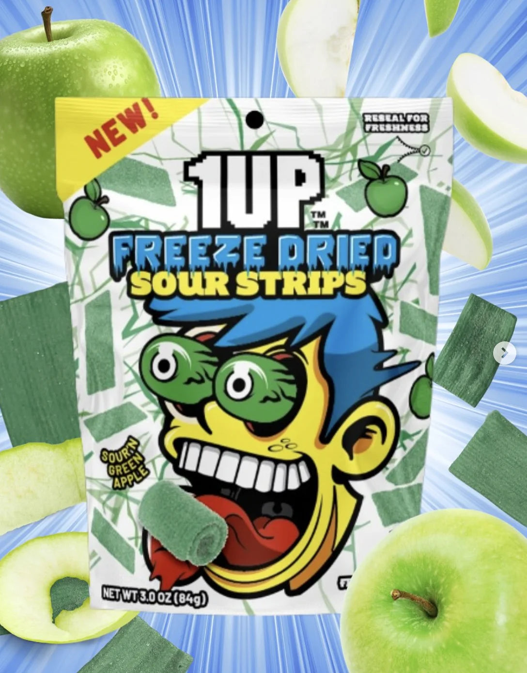 Get ready to level up your candy game with 1UP Candy Freeze Dried Green Apple Sour Strips — a bold, electrifying treat that delivers a satisfying crunchy twist on a classic favorite! We’ve taken iconic Green Apple sour strips and transformed them through our unique freeze-drying process, turning each piece into a light, ultra-crunchy, and irresistibly addictive snack. With every bite, you’ll experience an intense explosion of tangy, fruity flavors that dance across your taste buds, followed by an airy, crisp crunch that makes it impossible to stop at just one. Our resealable bag makes it easy to snack on the go, share with friends, or keep all to yourself (we won’t judge). Perfect for candy lovers seeking a new texture adventure, 1UP Candy Freeze Dried Green Apple Sour Strips are not only a fun treat but also a conversation starter. Get ready to experience sour strips like never before — light, crunchy, and seriously fun!