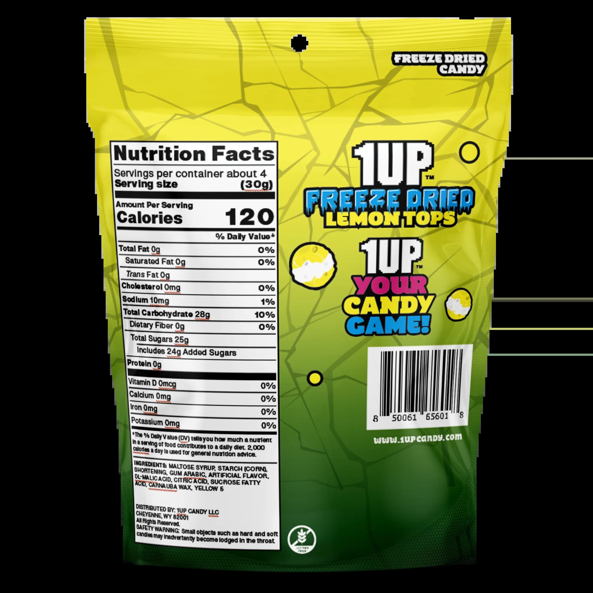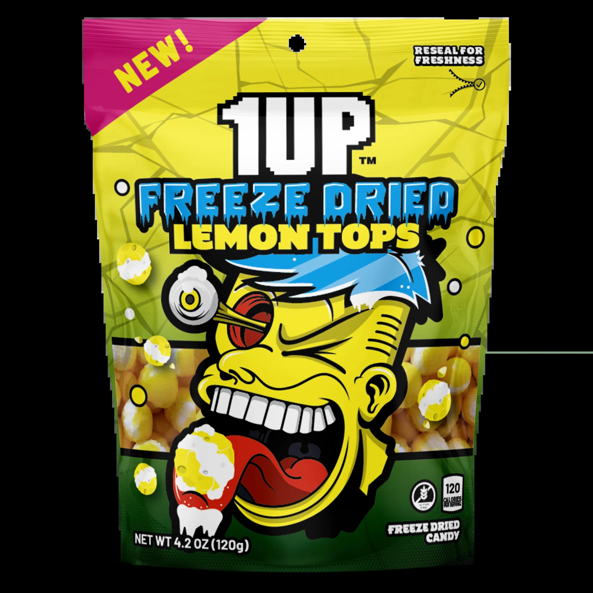 Discover the tangy thrill of 1UP Candy's Freeze Dried Lemon Tops, now energizing Department 82 at . These aren't your ordinary candies; each Lemon Top has undergone a transformation, turning the classic gummy interior and hard candy shell into a light, airy treat with an addictively crunchy texture. The explosion of lemon flavor from the gummy core through the shattered shell creates a taste sensation that's both refreshing and exhilarating.