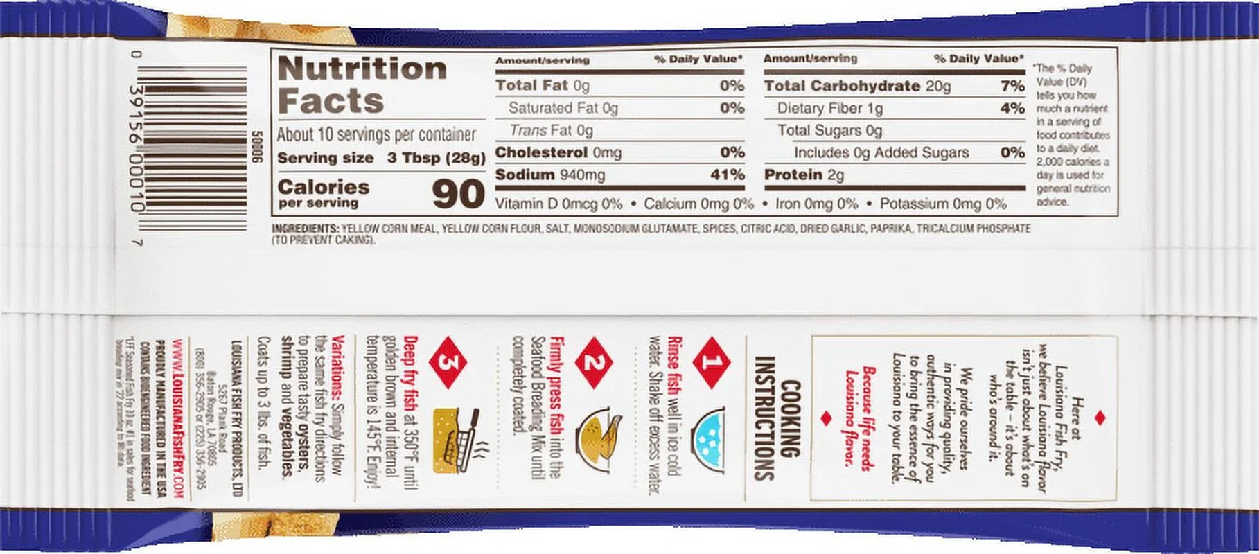 Bring the taste of Louisiana home with Louisiana Fish Fry Crispy Seasoned Fish Fry Breading Mix, the blend that started it all! This flavorful mix of cornmeal, garlic, salt, and traditional spices is the perfect seasoning for crispy fish, oysters, shrimp, meat, or vegetables. Simply moisten your seafood in ice cold water, firmly press in the Seafood Breading Mix and deep fry until it's fully cooked. With this seasoned breading mix, you can easily fry up your favorite meals in a deep fryer or skillet using your preferred cooking oil. Each 10-ounce bag contains about 10 servings and can coat up to 3 Lbs. of seafood, making it ideal for weeknight dinners or weekend fish fries. Each serving of Seasoned Fish Fry Breading Mix contains 90 calories, zero trans fat and zero cholesterol. Born and raised in Baton Rouge, Louisiana, Louisiana Fish Fry started as a roadside vegetable and seafood stand. For over 40 years, we have been committed to selling authentic Louisiana-style dishes made from only the finest, high-quality, and affordable ingredients for every table. Because life needs Louisiana flavor.