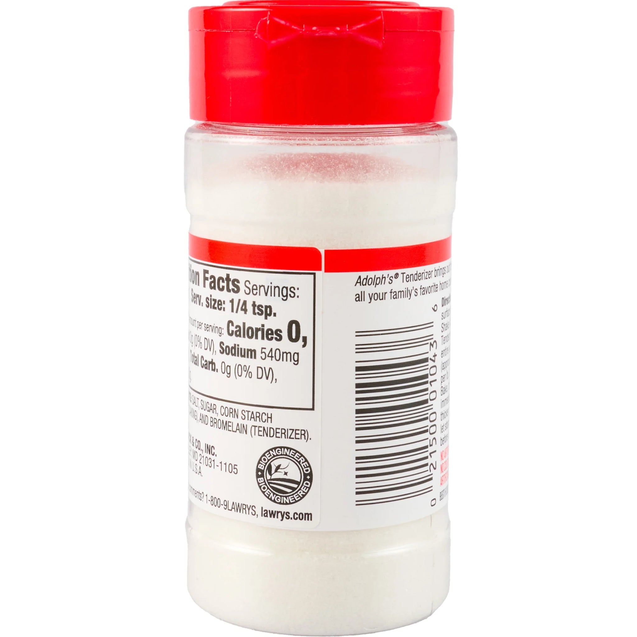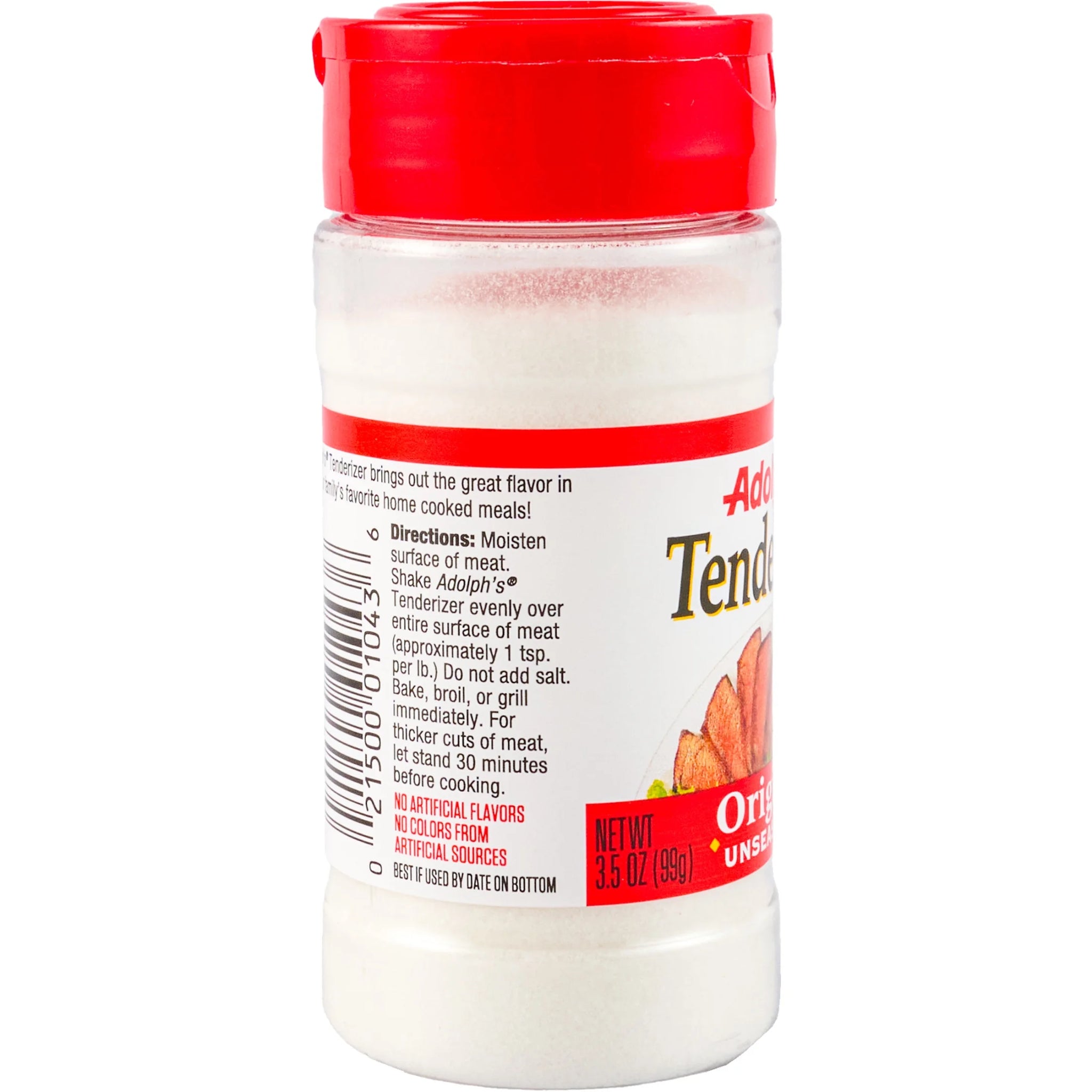 Adolph's Unseasoned Tenderizer, 3.5 oz Bottle. Adolph's Original Unseasoned Tenderizer, 3.5 oz is the perfect match for tough cuts of beef, pork and poultry. It tenderizes and brings out great flavor in your family’s home-cooked meals without any added MSG, artificial flavor, and colors from artificial sources. Take dinnertime to the next level with easy-to-use Adolph's Original Unseasoned Tenderizer, in a convenient shaker. Meats are gently tenderized with bromelain, an enzyme naturally found in pineapple. Simply moisten the surface of your choice of meat, shake on tenderizer (about 1 teaspoon per 1 pound of meat), and immediately bake, broil or grill to perfection. No need for salt or marinating time. Your beef, pork and poultry dinners will be tender and savory with our tenderizer- it’s the secret to mouthwatering meals infused with flavor. This Adolph's Unseasoned Tenderizer is in a Plastic bottle that is 3.5 ounces. Store this shelf-stable item at an ambient temperature.