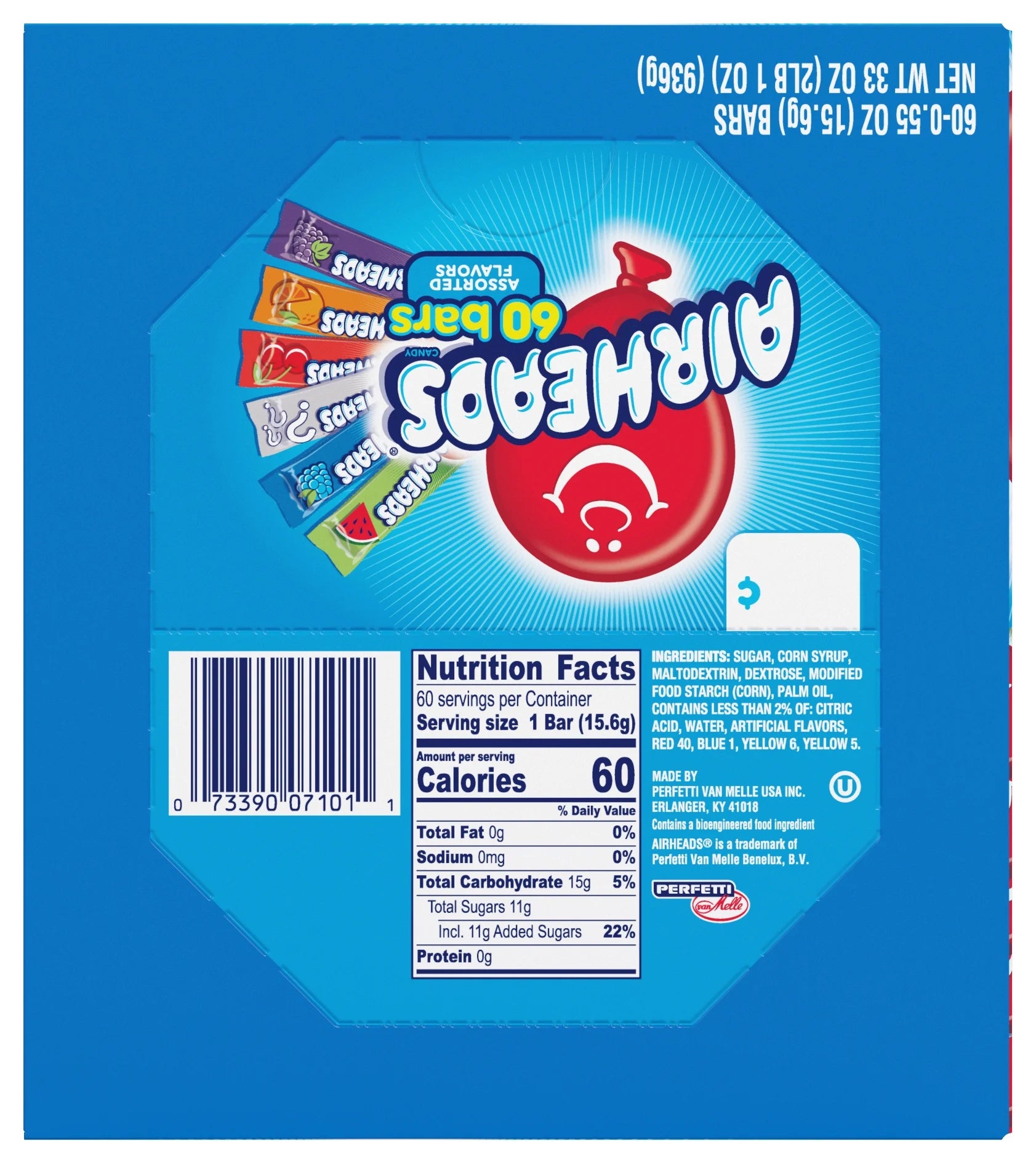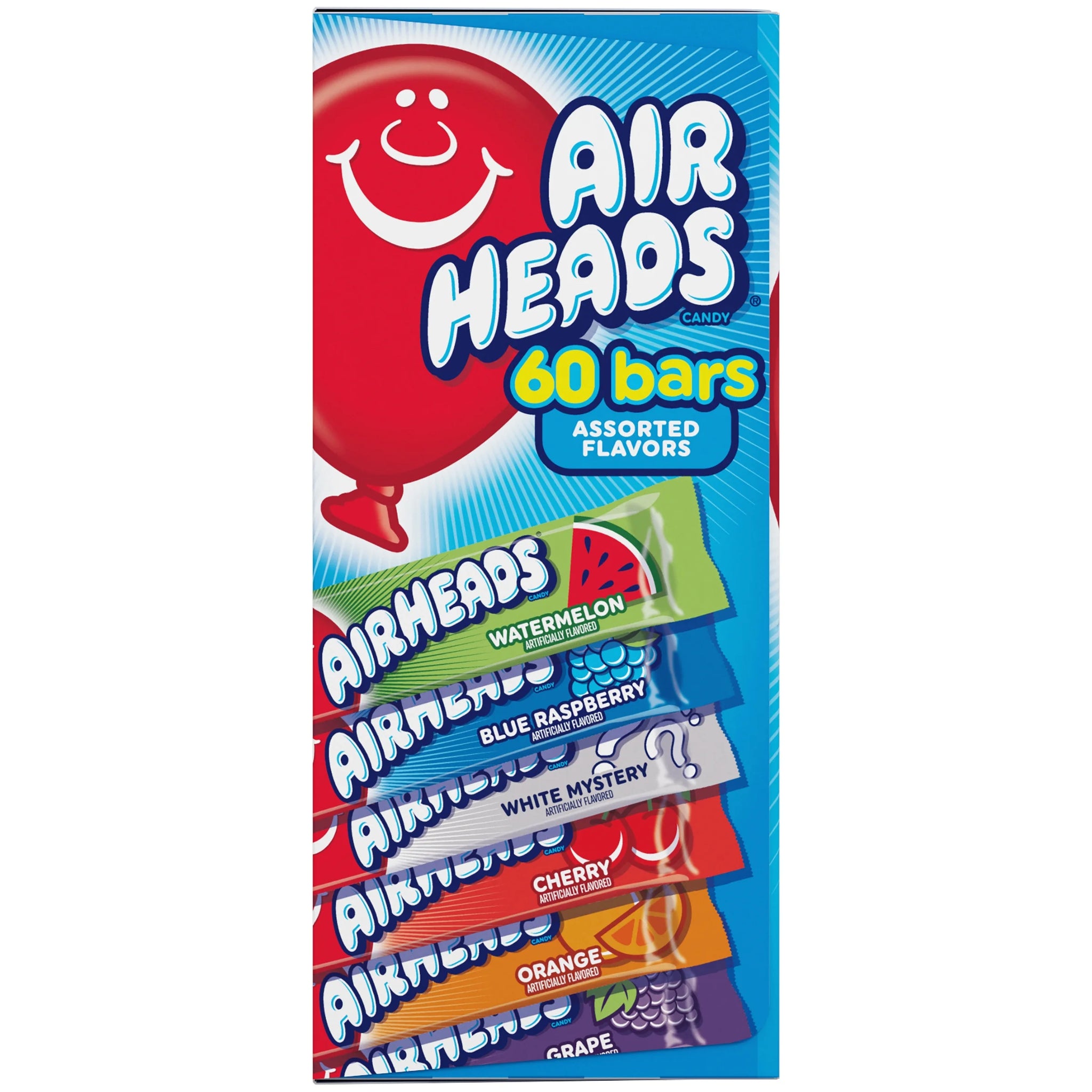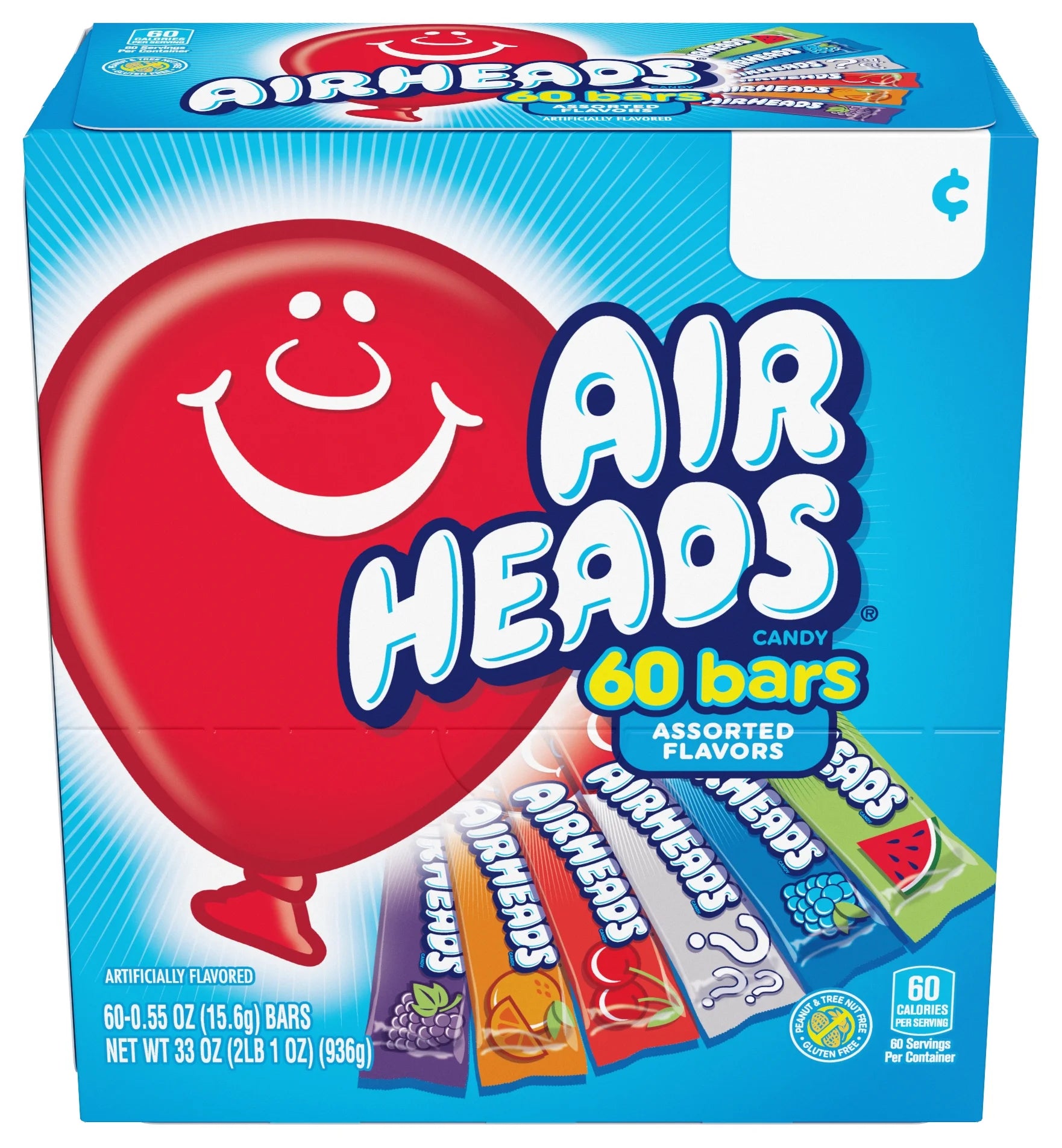 Nothing beats the tremendously tangy, playfully chewy chew of regular size Airheads candy. Each 33oz, 60 count box includes a variety of fruit flavored individually wrapped Airheads bars (.55 oz each). Flavors include Blue Raspberry, Cherry, Watermelon, Grape, Orange and White Mystery. This box is the answer to your sweet tooth's dream and your bulk candy needs. These are Gluten-free, nut free and kosher. These are the perfect candy for fundraising, holidays, events, party favors, concession stands, office treats, movie sweets and more.