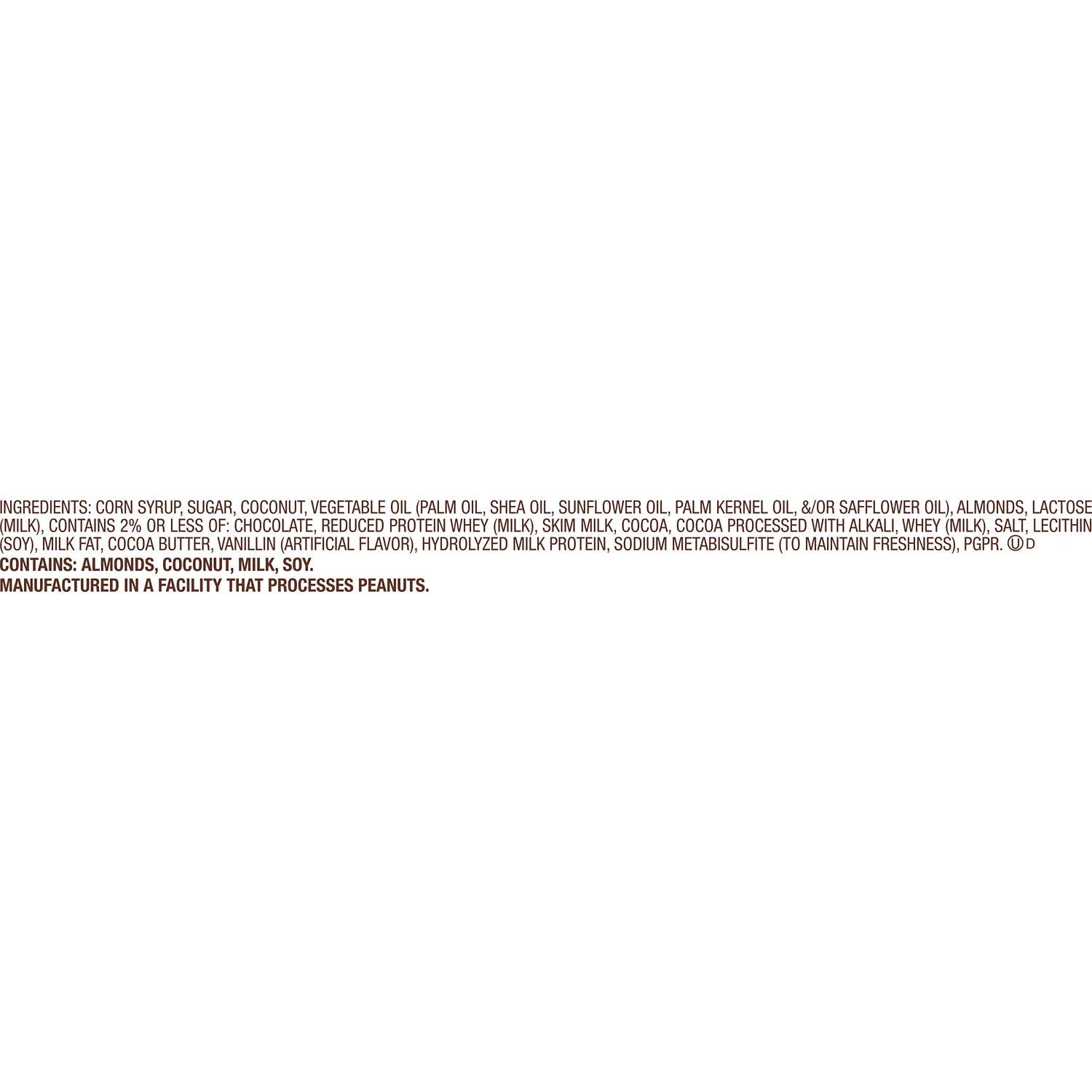 CORN SYRUP, SUGAR, COCONUT, VEGETABLE OIL (PALM OIL, SHEA OIL, SUNFLOWER OIL, PALM KERNEL OIL, &/OR SAFFLOWER OIL), ALMONDS, LACTOSE (MILK), CONTAINS 2% OR LESS OF: CHOCOLATE, REDUCED PROTEIN WHEY (MILK), SKIM MILK, COCOA, COCOA PROCESSED WITH ALKALI, WHEY (MILK), SALT, LECITHIN (SOY), MILK FAT, COCOA BUTTER, VANILLIN (ARTIFICIAL FLAVOR), HYDROLYZED MILK PROTEIN, SODIUM METABISULFITE (TO MAINTAIN FRESHNESS), PGPR./div>