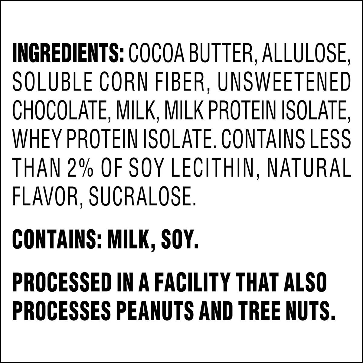 Cocoa Butter, Allulose, Soluble Corn Fiber, Unsweetened Chocolate, Milk, Milk Protein Isolate, Whey Protein Isolate. Contains less than 2% of Soy Lecithin, Natural Flavors, Sucralose. Contains: Milk, Soy./div>