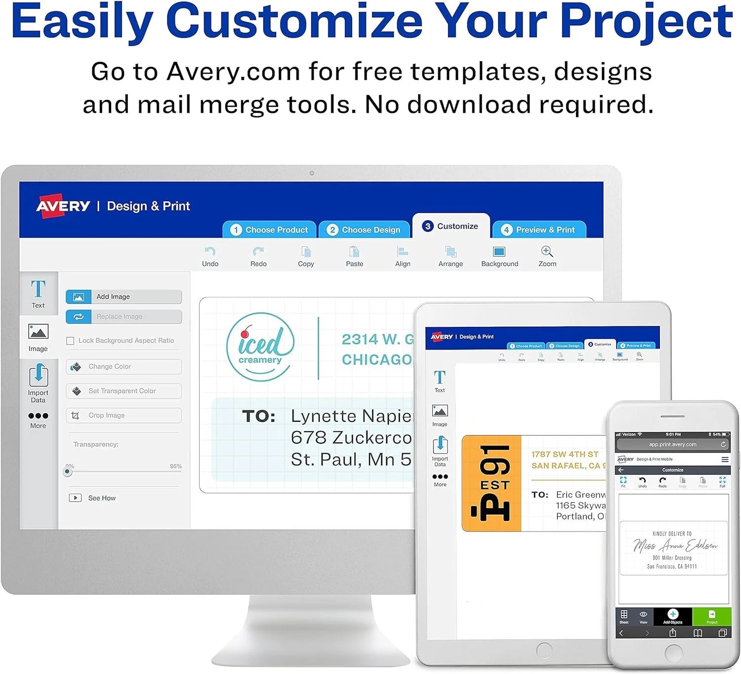 Take charge of all your mailing, shipping, identification and organization jobs with Avery address labels. Avery bright white labels blend better than basic labels on white envelopes. Avery labels provide better adhesion than basic labels with its Ultra hold permanent adhesive that sticks and stays, guaranteed. Printers aren't perfect, so we did something about it: These mailing labels are optimized for laser & inkjet printers and use Sure Feed technology to deliver a more reliable feed through your printer and prevent misalignments and jams. Never waste another label! These address labels have an Easy Peel design for fast application. They're great for organization labels, classroom labels, personalized gift tags for your wrapping paper, party favors or holiday cards.