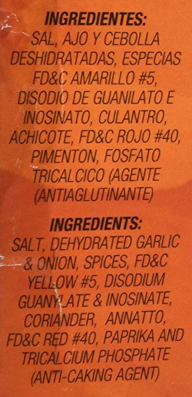 Salt, Dehydrated Garlic & Onion, Spices, FD&C Yellow #5, Disodium Guanylate & Inosinate, Coriander, Annatto, FD&C Red #40, Paprika, Tricalcium Phosphate (anti-caking agent)/div>