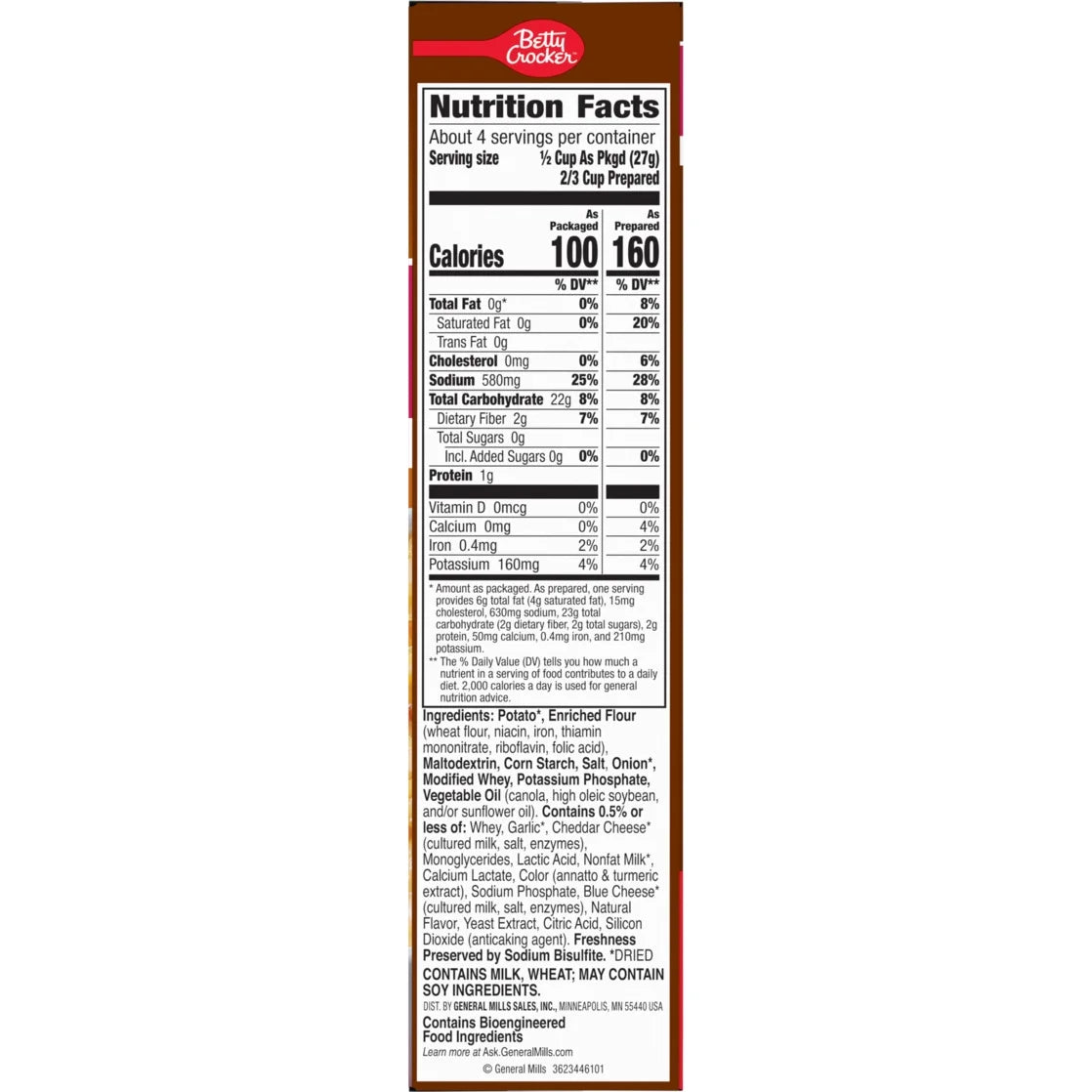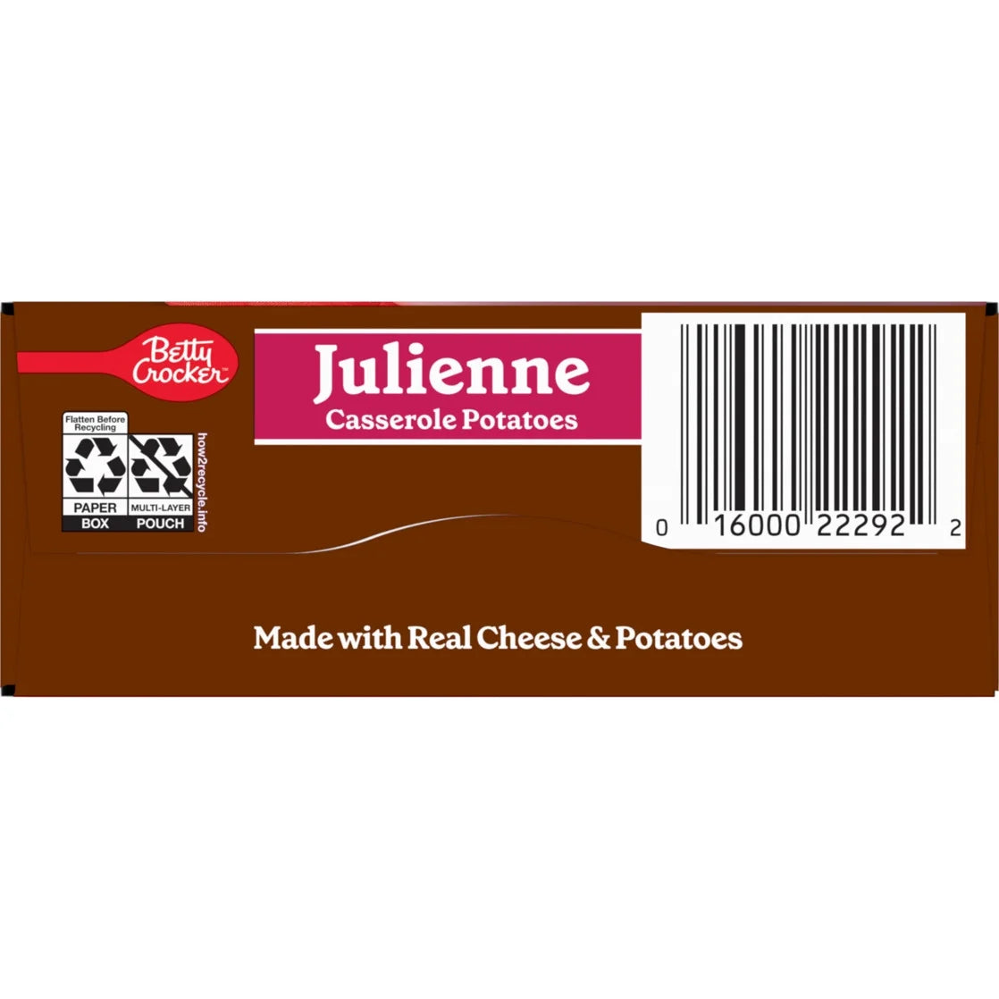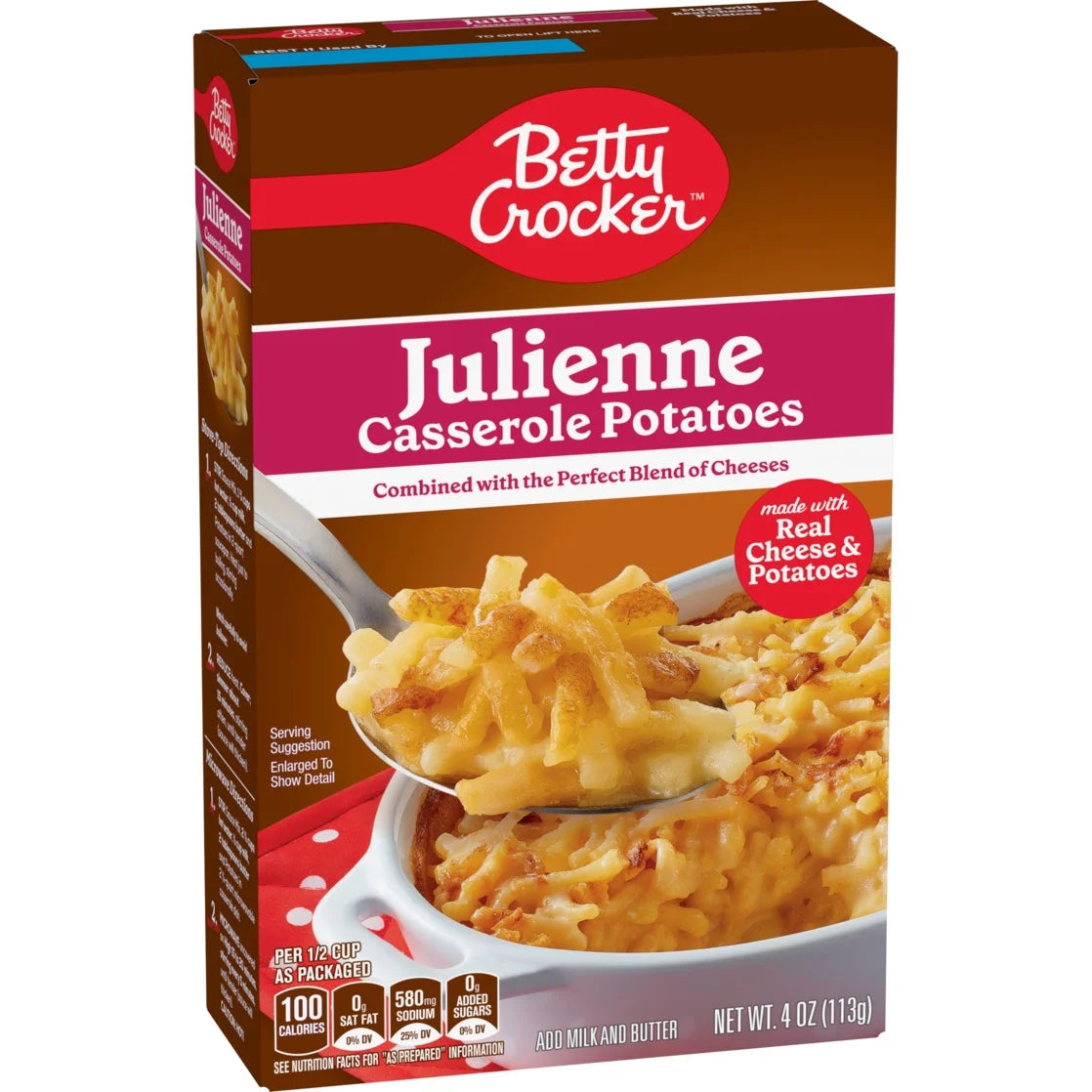 - CONTAINS: One cardboard carton of Betty Crocker Julienne Casserole Potatoes, Made with Real Cheese, 4 oz Box