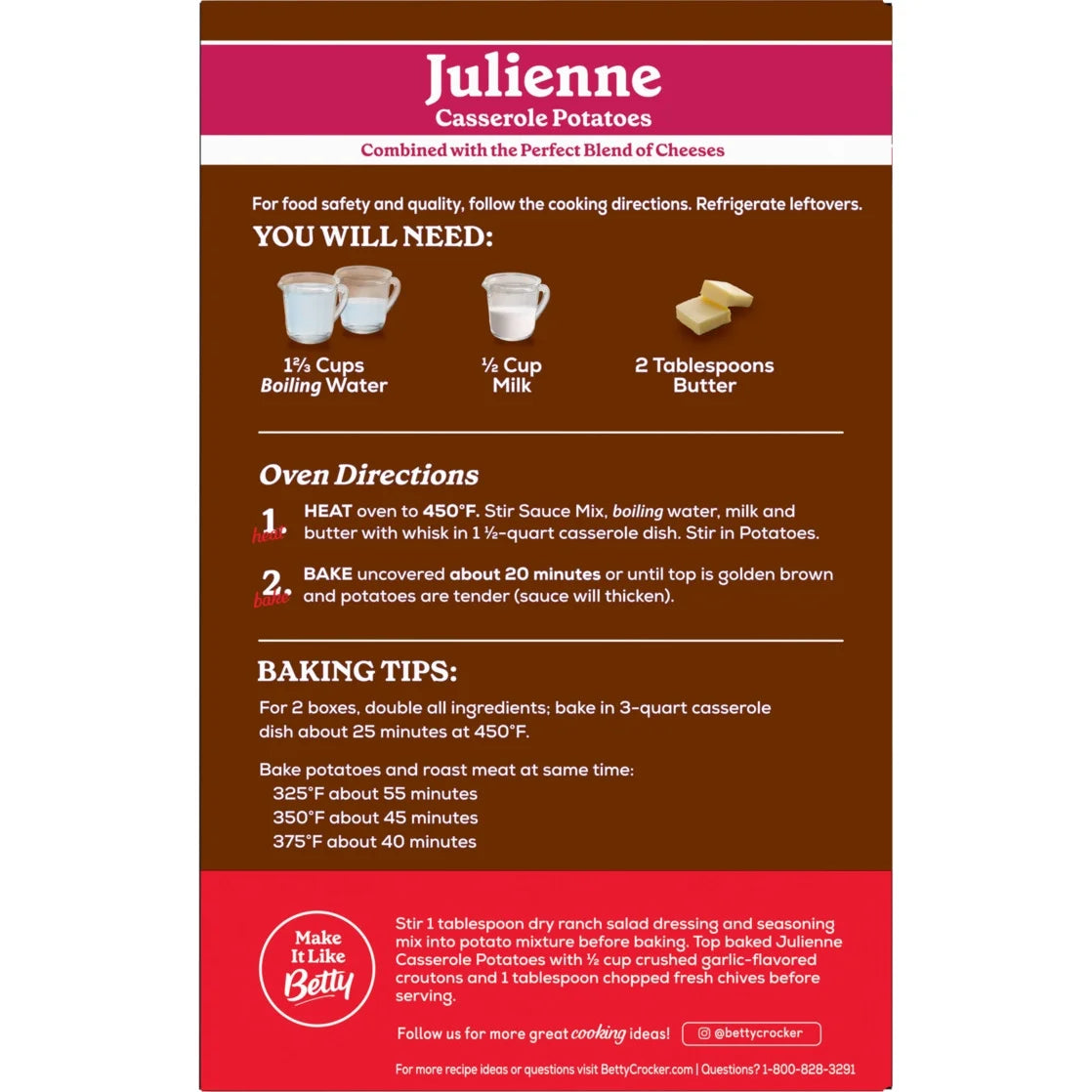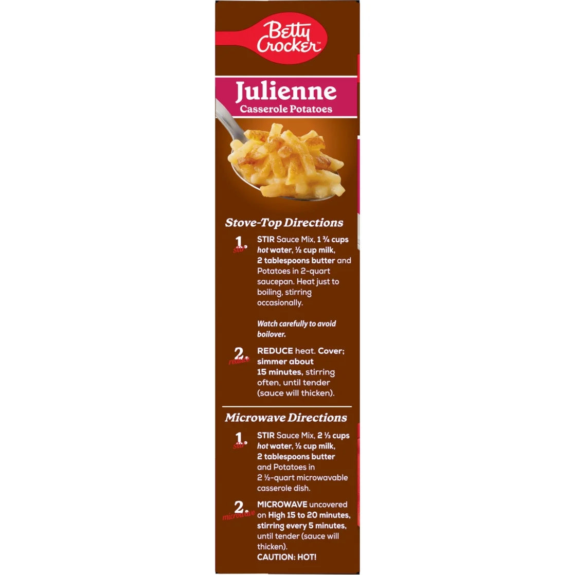 - JULIENNE POTATOES: Enjoy Betty Crocker's thinly sliced potatoes combined with the perfect blend of cheeses; A family favorite food and pantry staple for generations