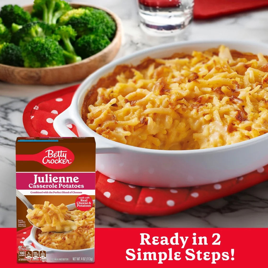 A favorite for generations, Betty Crocker makes it easy to bring this classic combination of real cheese and sliced potatoes to your family table. These perfectly seasoned potatoes combined with an ideal blend of cheeses create an ideal side dish for family meals. They're easy to prepare by adding boiling water, milk, and butter and following the simple steps on the package. With about four servings in this 4-ounce box, keep Betty Crocker Julienne Casserole Potatoes on hand as a convenient part of a weeknight dinner or your Sunday brunch spread. Or stock up and serve Betty Crocker potatoes at your next party or event. Hungry for more ways to do meal prep using our potatoes? Look to Betty Crocker recipes for tasty inspiration. For more than a century, Betty Crocker has been bringing families easy, delicious recipes. The Betty Crocker kitchen is still providing convenient, tasty dessert mixes, frostings, and convenient meal options and side dishes. Contains one cardboard carton of Betty Crocker Julienne Casserole Potatoes, Made with Real Cheese, 4 oz Box.