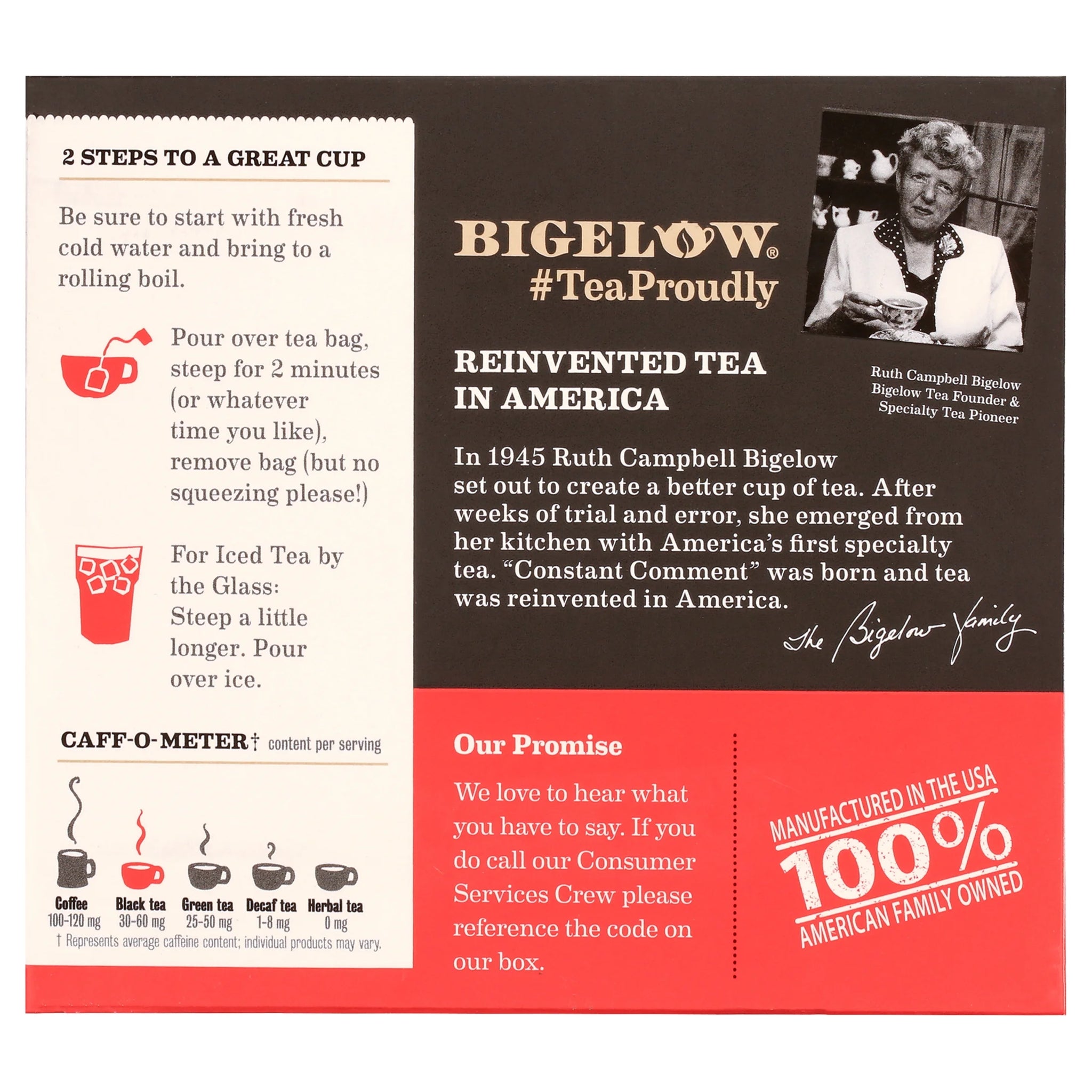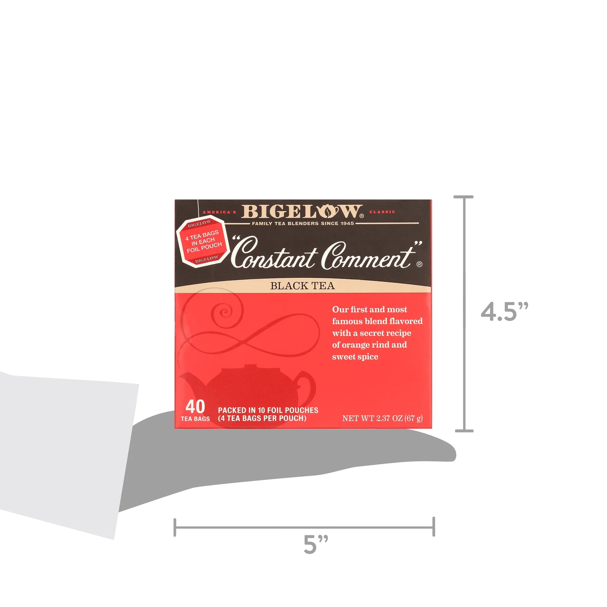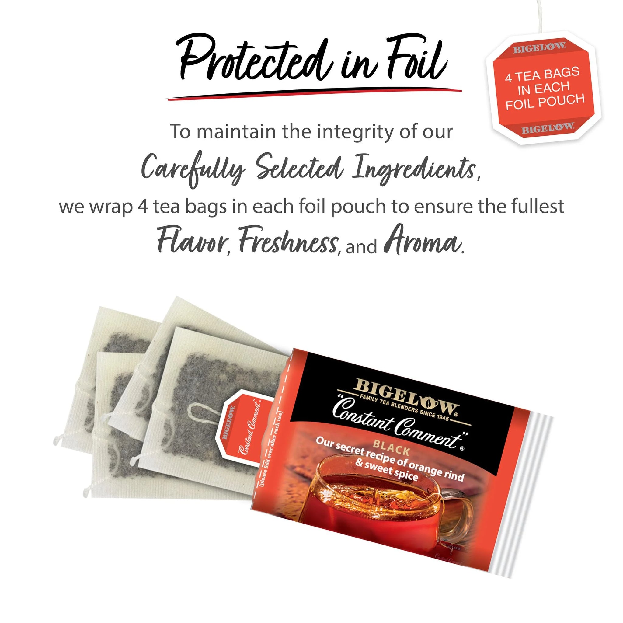 The Bigelow original. No recipe makes us prouder. To this day members of the Bigelow family are still the only ones who blend this secret recipe of black tea, rind of oranges and sweet spice. One sip & you will know there is still no tea like it. Take a whiff then enjoy the one and only Constant Comment. Our ingredients are carefully selected by the Bigelow family to deliver you an uncompromised quality tea experience. Our recipe combines hand-picked tea leaves, harvested at their peak using only the top two tea leaves and the bud, blended with sweet spice and orange rind. Each box of this caffeinated black tea contains 40 tea bags packed in 10 foil pouches (4 tea bags per pouch). To maintain the integrity of our exceptional ingredients, we wrap each tea bag in a foil pouch to ensure the fullest flavor, freshness, and aroma. It also makes it convenient to take Bigelow Tea everywhere you go. Bigelow Tea is proud to be 100% family owned and operated since 1945. We are honored to be a Certified B Corporation. This achievement recognizes our commitment to the highest standards of social and environmental impact. Because it’s all about doing the right thing.