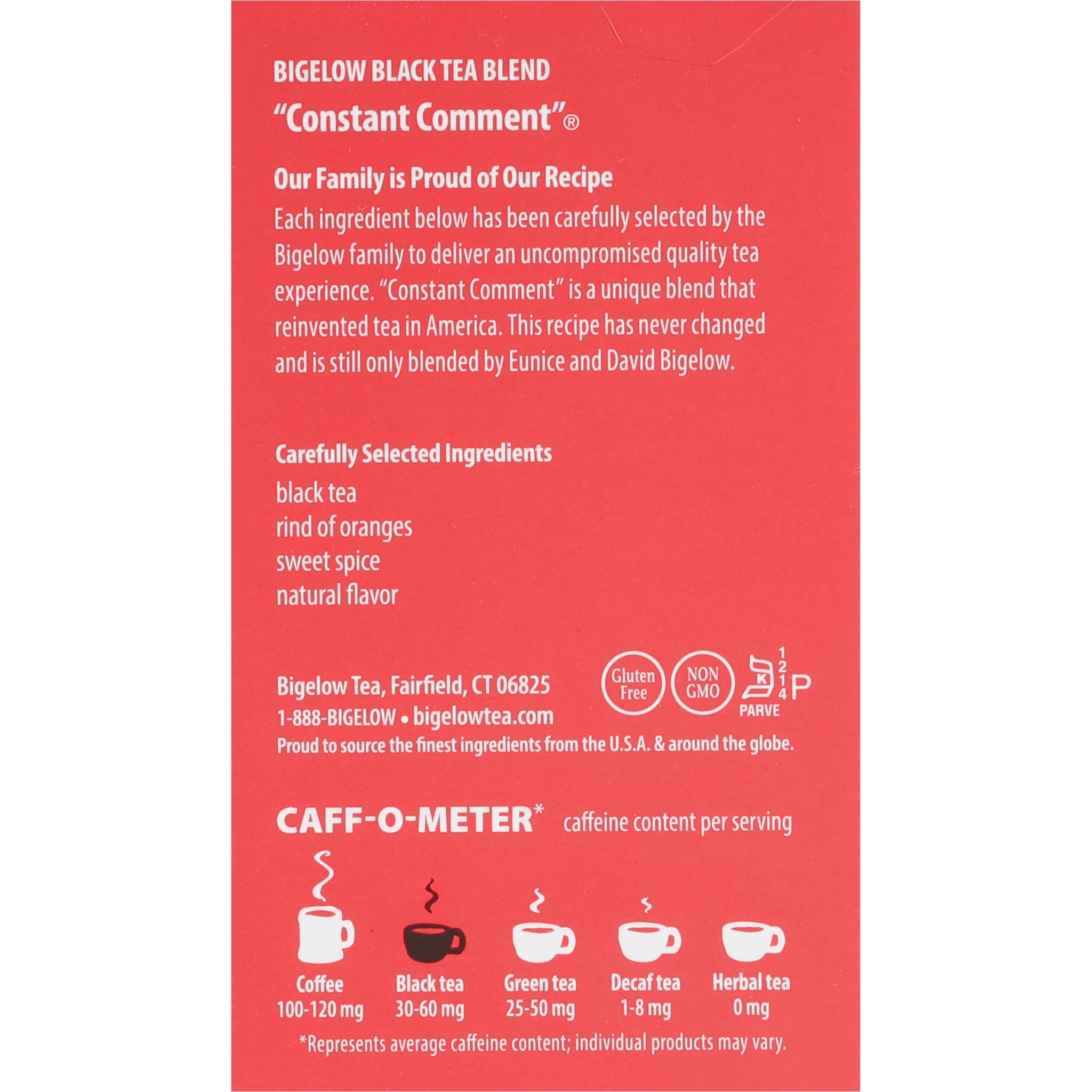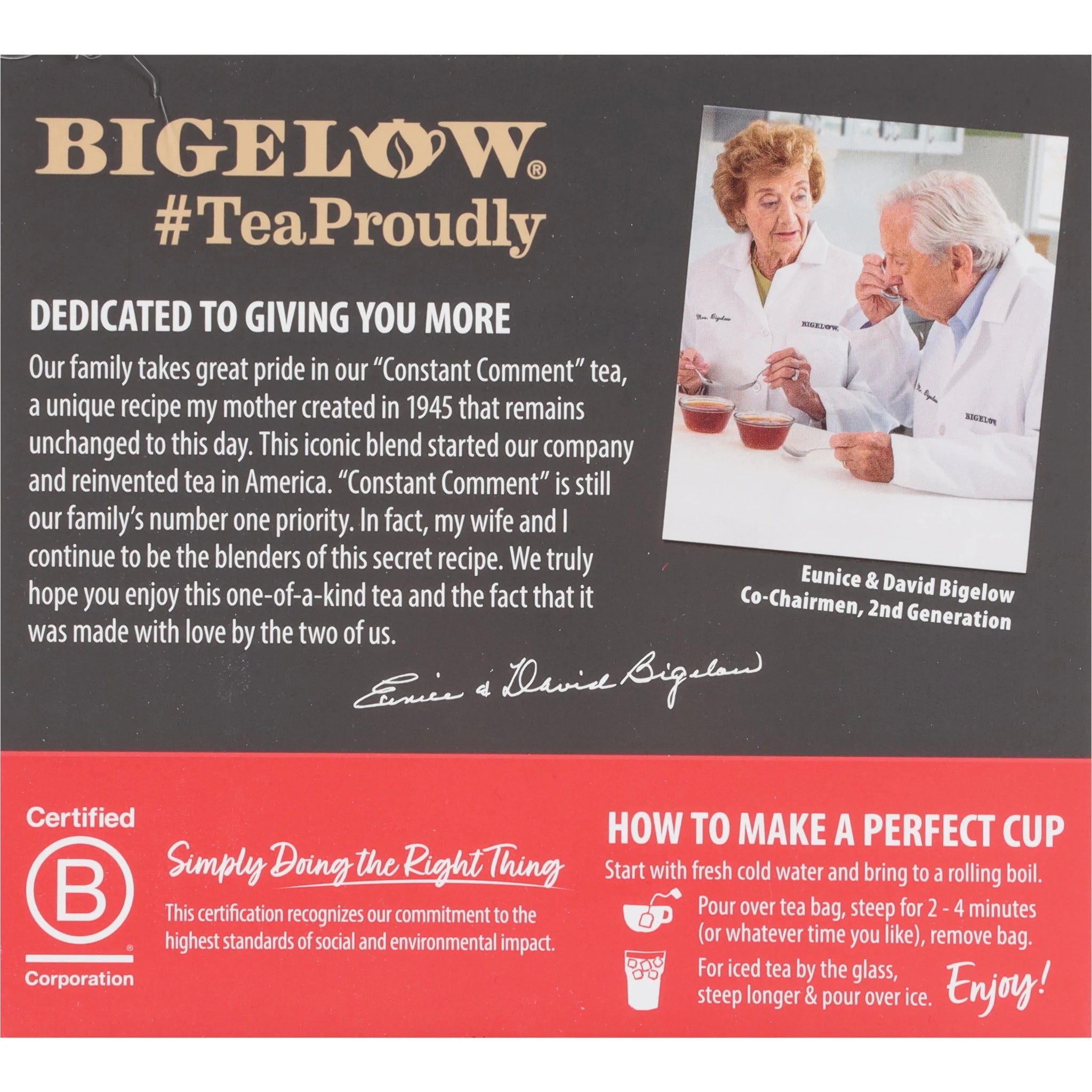 The Bigelow original. No recipe makes us prouder. To this day members of the Bigelow family are still the only ones who blend this secret recipe of black tea, rind of oranges and sweet spice. One sip & you will know there is still no tea like it. Take a whiff then enjoy the one and only Constant Comment. Our ingredients are carefully selected by the Bigelow family to deliver you an uncompromised quality tea experience. Our recipe combines hand-picked tea leaves, harvested at their peak using only the top two tea leaves and the bud, blended with sweet spice and orange rind. Each box of this caffeinated black tea contains 40 tea bags packed in 10 foil pouches (4 tea bags per pouch). To maintain the integrity of our exceptional ingredients, we wrap each tea bag in a foil pouch to ensure the fullest flavor, freshness, and aroma. It also makes it convenient to take Bigelow Tea everywhere you go. Bigelow Tea is proud to be 100% family owned and operated since 1945. We are honored to be a Certified B Corporation. This achievement recognizes our commitment to the highest standards of social and environmental impact. Because it’s all about doing the right thing.