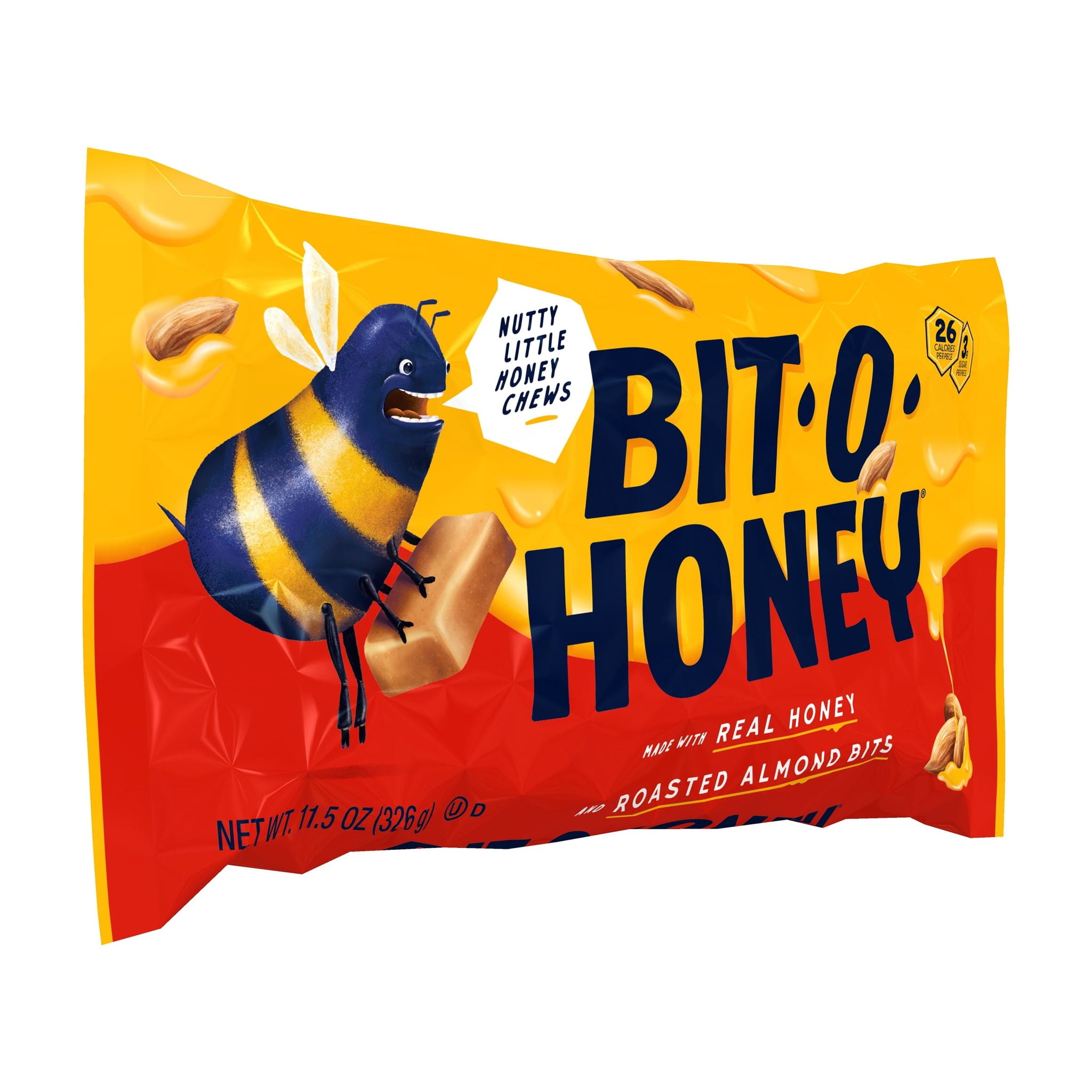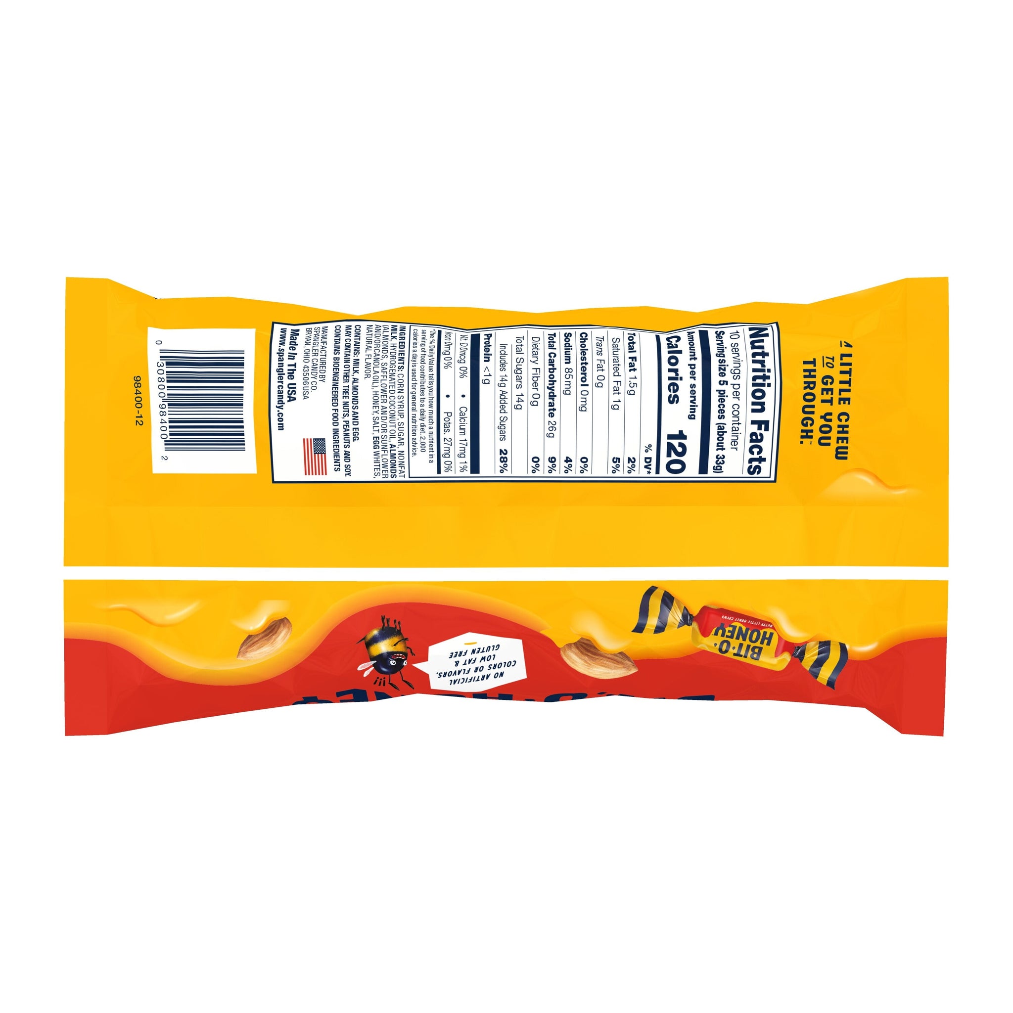 Made with real honey and real almond bits, these naturally sweet taffy treats are destined to become your favorite candy! if they aren't already! Bit-O-Honey is made using no artificial flavors, just a delicious blend of real ingredients. Easy to stash in your pocket or bag, you can always keep Bit-O-Honey handy as a little treat or reward for little ones (or yourself!) You'll be ready for any candy craving emergency! Bit-O-Honey fans describe it as delicious, fun to eat and one of their must-have treats. Created in 1924, this timeless candy has a great history of being shared amongst family and friends no matter the occasion. Bit-O-Honey is brought to you by Spangler, a family company making family treats since 1906. Contains: milk, almonds, egg and soy