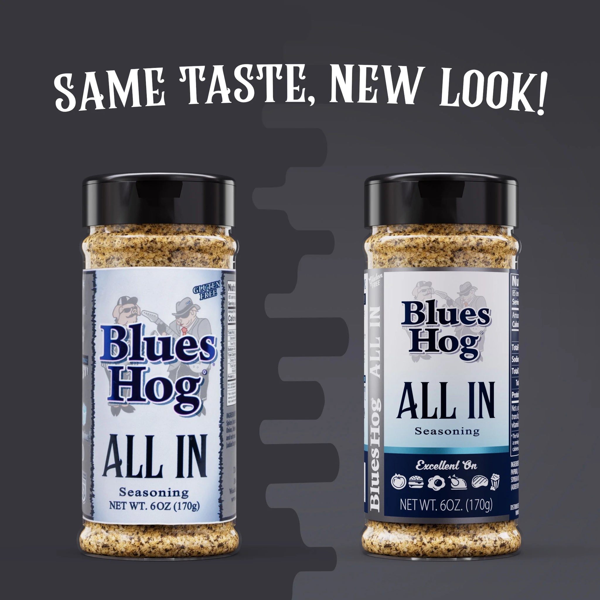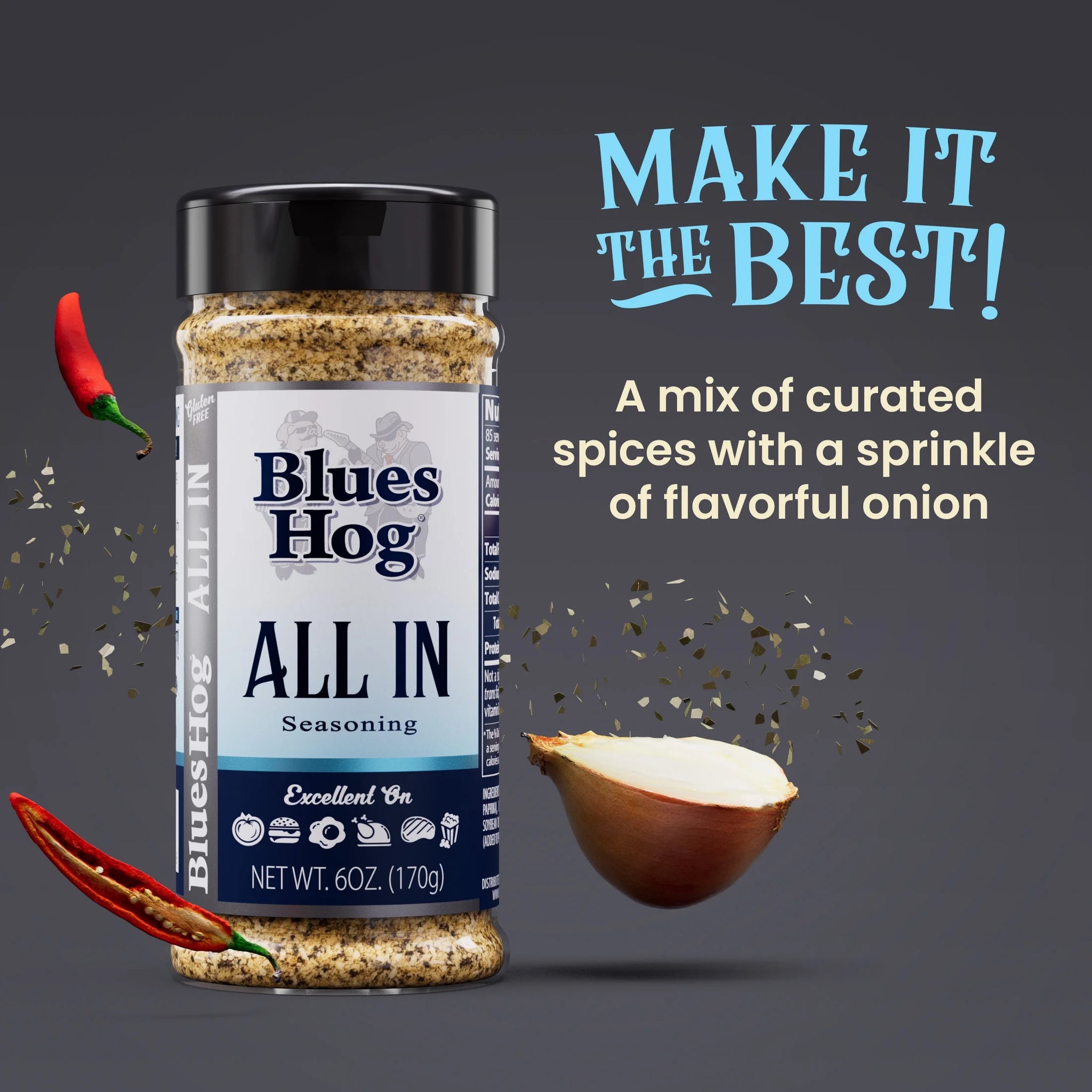 Blues Hog All In Dry Rub Seasoning 6 Oz Blues Hog All In Seasoning will quickly become your "Go-To" rub. Enhance it all with this well-balanced flavor. Whatever you choose to eat, this seasoning will take it to the next level. Use it anywhere anytime and on anything and it will kick it up a notch. This seasoning is best on vegetables, burgers, eggs, poultry steak, and popcorn. All Blues Hog gourmet dry rub seasonings are made of all-natural, high-quality ingredients. Please see below for more features and specifications.