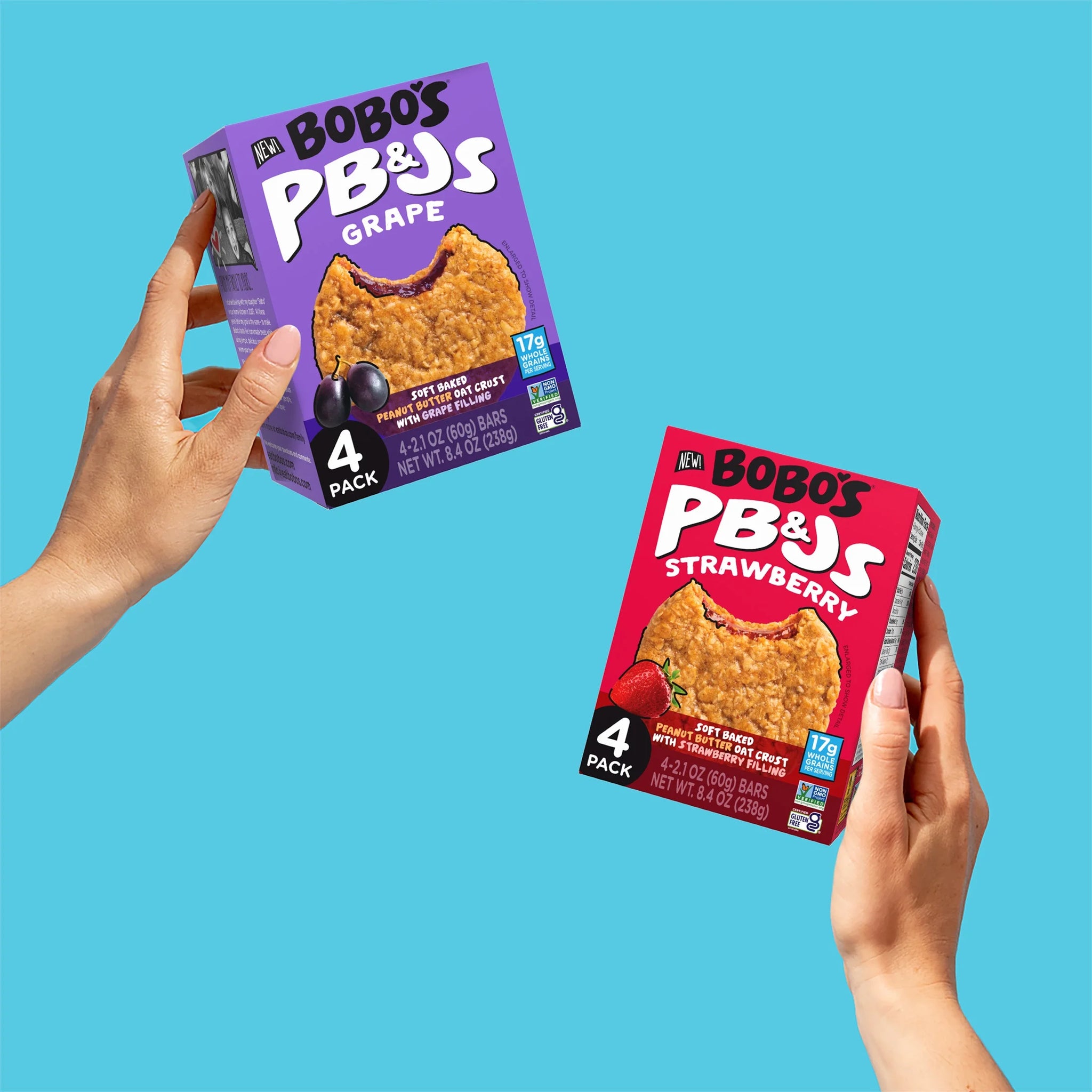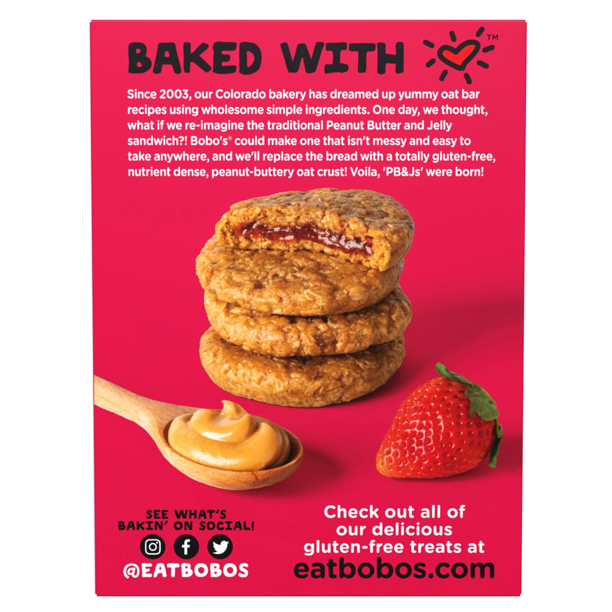 Each Bobo's PB&J starts with wholesome whole grain oats mixed with a perfect fruit filling. Each one is gluten-free, shelf-stable, Certified Non-GMO, vegan and dairy free! All without boring the daylights out of your taste buds. Every ready-to-eat snack is packed full of whole grain oats and tons of flavor to keep your body going and your taste buds begging for more!