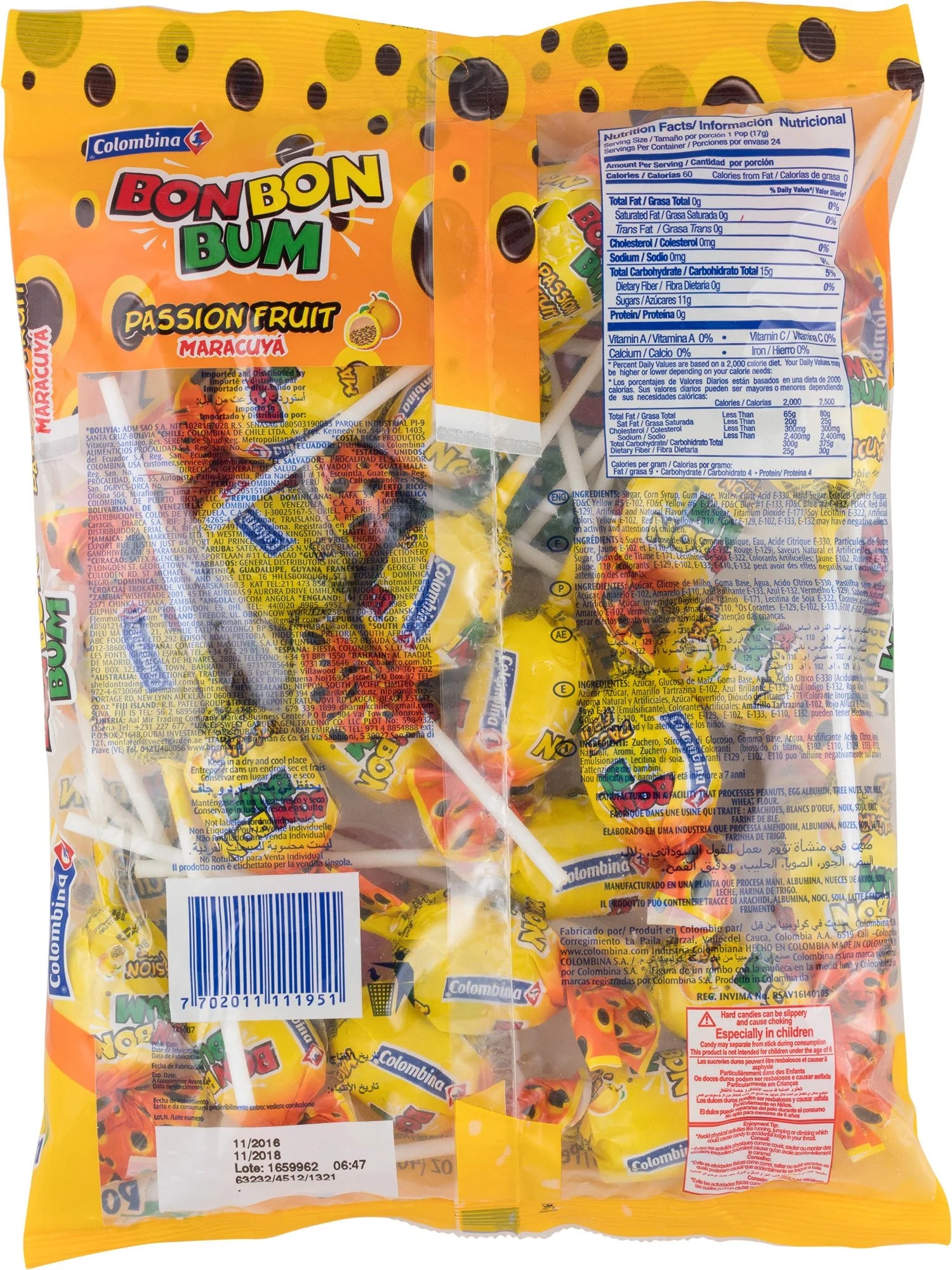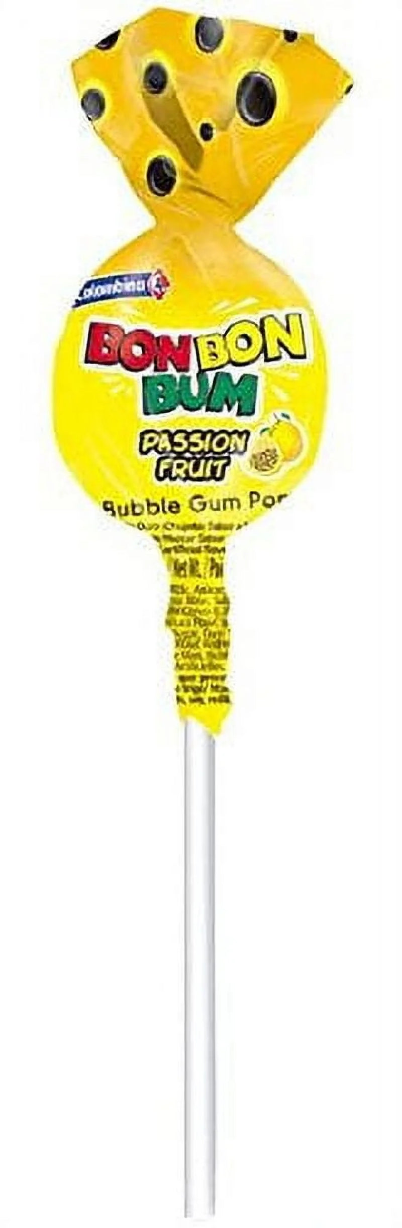 Bubble Gum Pops, Passion Fruit, Bag 24 CT Passion fruit bubble gum lollipops. Artificial and natural flavor. Not labeled for individual sales. Keep in a dry and cool place. Manufactured in a facility that processes peanuts, egg albumin, tree nuts, soy, milk, wheat flour. Hard candies can be slippery and cause choking. Especially in children. Candy may separate from stick during consumption. This product is not intended for children under the age of 6. Enjoyment Tip: Avoid physical activities like running, jumping or climbing which could case candy to accidental lodge in your throat. 24 pops 14.4 oz (408 g)