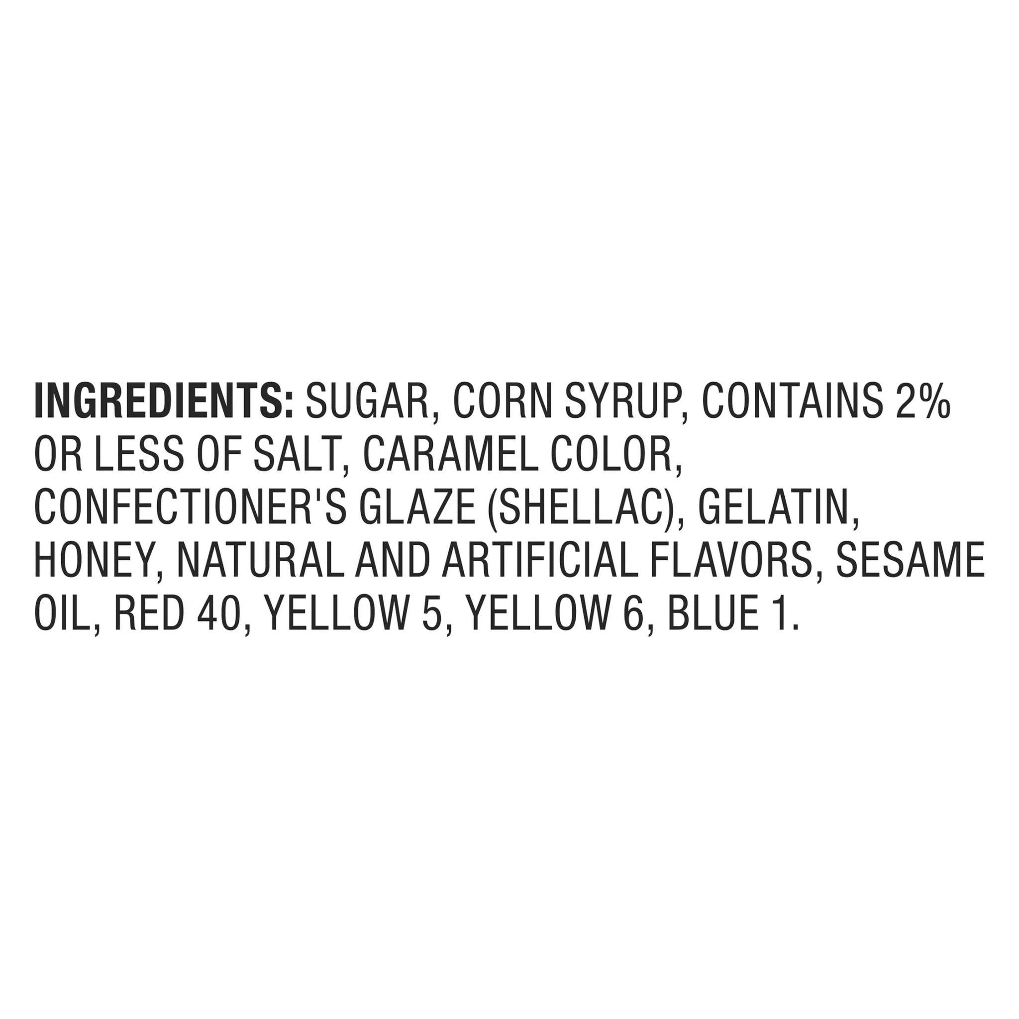 SUGAR, CORN SYRUP, CONTAINS 2% OR LESS OF SALT, CARAMEL COLOR, CONFECTIONER'S GLAZE (SHELLAC), GELATIN, HONEY, NATURAL AND ARTIFICIAL FLAVORS, SESAME OIL, RED 40, YELLOW 5, YELLOW 6, BLUE 1./div>