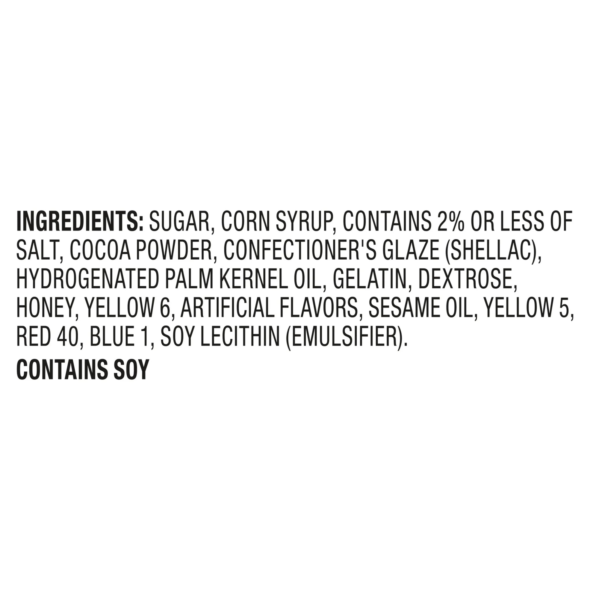 SUGAR, CORN SYRUP, CONTAINS 2% OR LESS OF SALT, COCOA POWDER, CONFECTIONER'S GLAZE (SHELLAC), HYDROGENATED PALM KERNEL OIL, GELATIN, DEXTROSE, HONEY, YELLOW 6, ARTIFICIAL FLAVORS, SESAME OIL, YELLOW 5, RED 40, BLUE 1, SOY LECITHIN (EMULSIFIER). CONTAINS SOY/div>