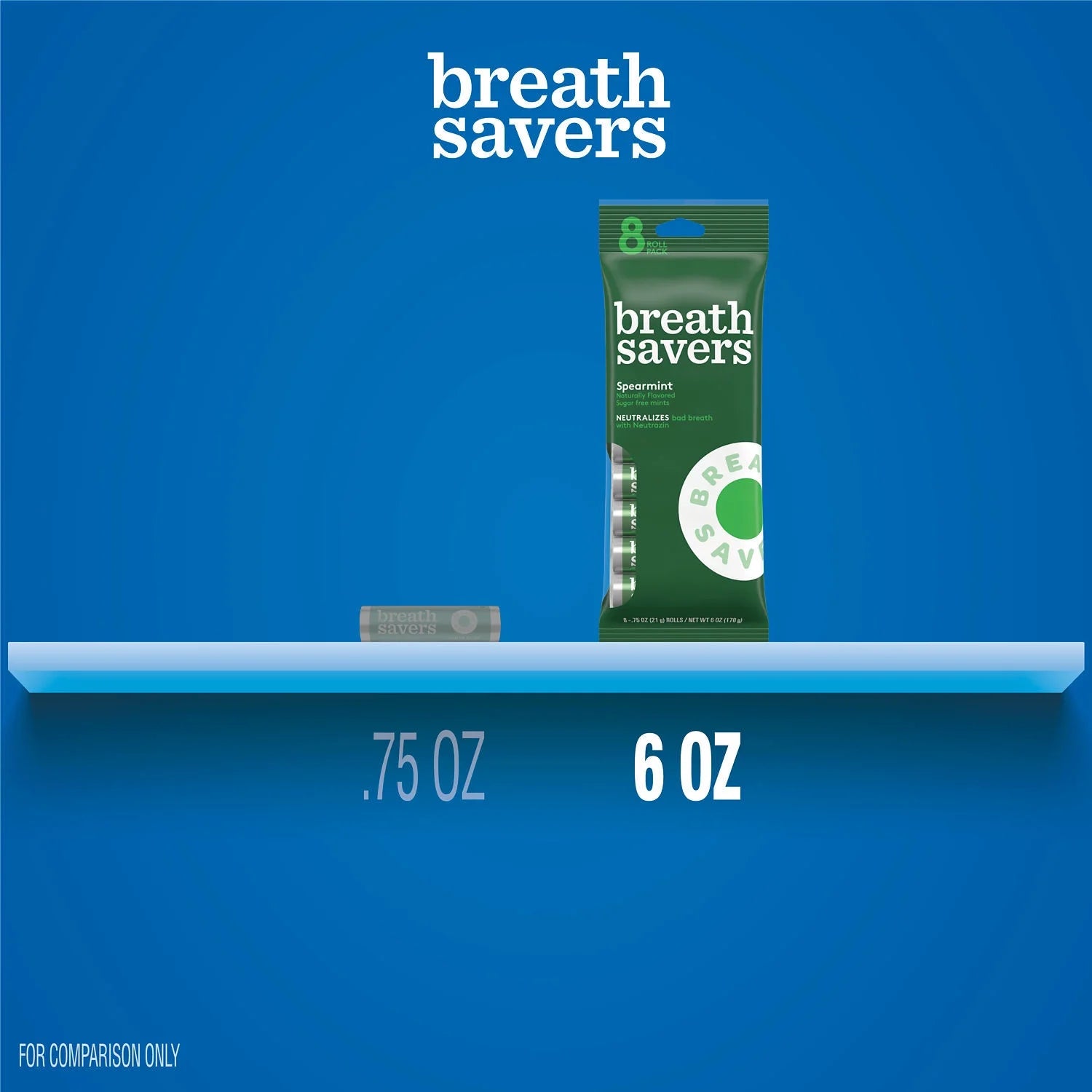 - Contains eight (8) 0.75-ounce rolls of BREATH SAVERS Spearmint Flavored Sugar Free Breath Mints