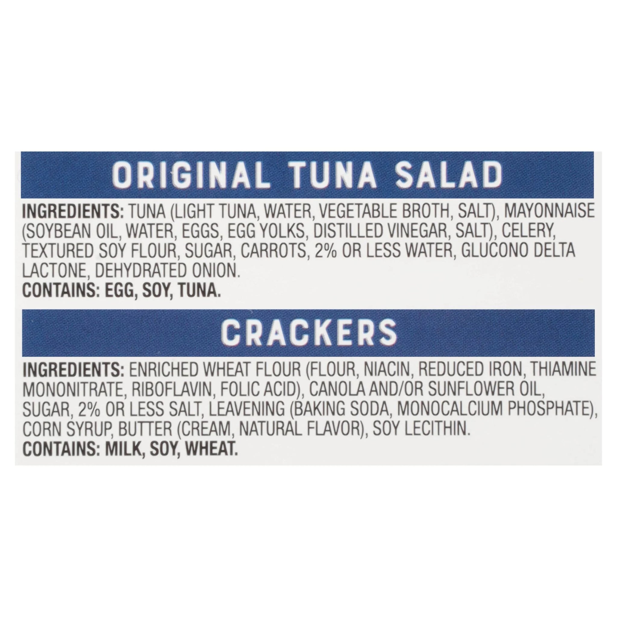 Tuna Salad Ingredients: Tuna (Light Tuna, Water, Vegetable Broth, Salt), Mayonnaise (Soybean Oil, Water, Eggs, Egg Yolks, Distilled Vinegar, Salt), Celery, Textured Soy Flour, Sugar, Carrots, Contains 2% Or Less Water Chestnuts, Water, Glucono Lactone, Onion.Contains: Egg, Tuna, SoyCrackers Ingredients: Enriched Flour (Wheat Flour, Niacin, Reduced Iron, Thiamine Mononitrate (B1), Riboflavin (B2), Folic Acid), Butter (Cream, Natural Flavor), Canola Oil , Sugar, Contains 2% Or Less Salt, Corn Syrup, Baking Soda, Soy Lecithin, Monocalcium Phosphate.Contains: Milk, Soy, Wheat/div>