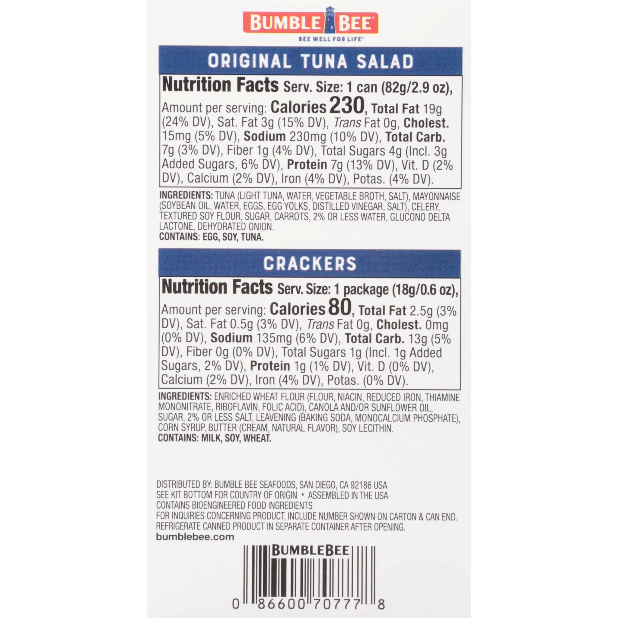 - PROTEIN SNACKS: This delicious Bumble Bee tuna salad and crackers kit is a good source of protein (See product packaging for nutrition information)