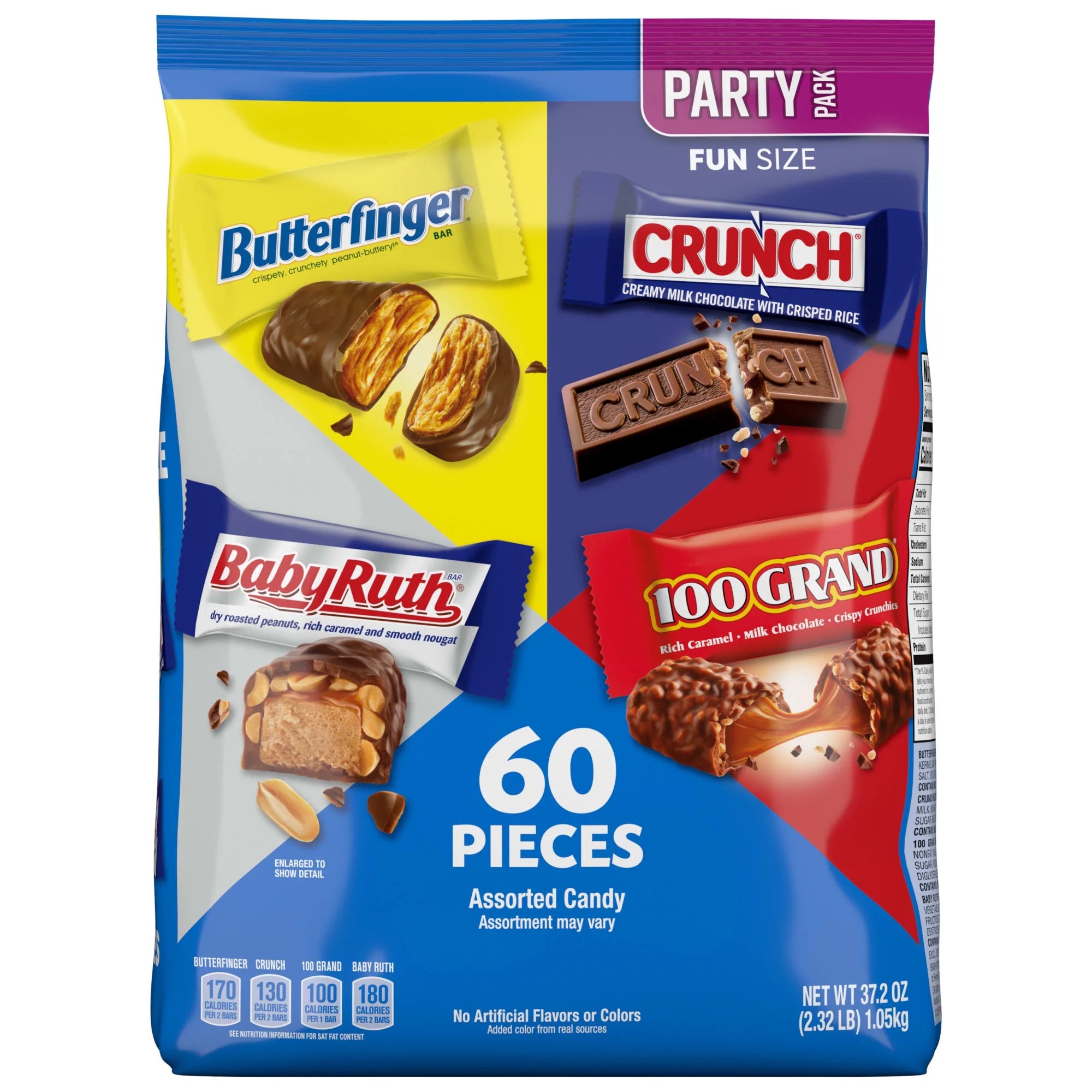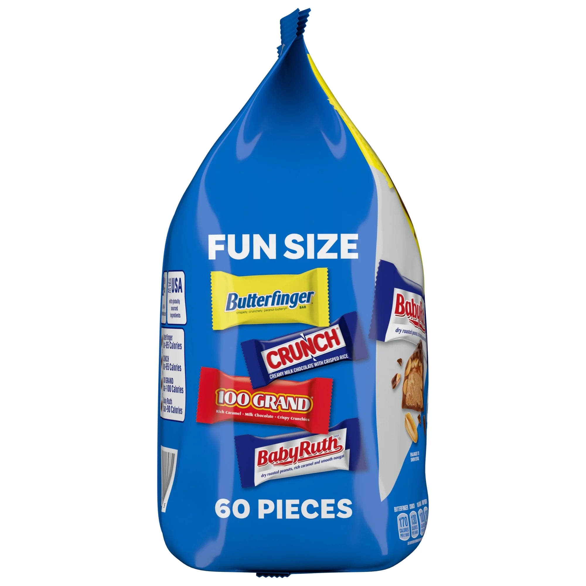 Enjoy the tasty variety of fan favorites like Butterfinger, CRUNCH, Baby Ruth and 100 Grand in this 60-count bag of assorted Fun Size candy bars. Discover a variety of chocolatey candy bars that are perfectly classic and delicious. From peanut-buttery Butterfinger to the chewy, crunchy goodness of Baby Ruth and 100 Grand, to the crunchy texture of CRUNCH you know and love, these classic candy bars are individually wrapped. Great for savoring as a treat, reward or during an office break getaway, these irresistible Fun Size bars also make the perfect candy to share with friends, family and coworkers. Grab a bag of assorted favorites today and add a variety of chocolatey treats to your every day.