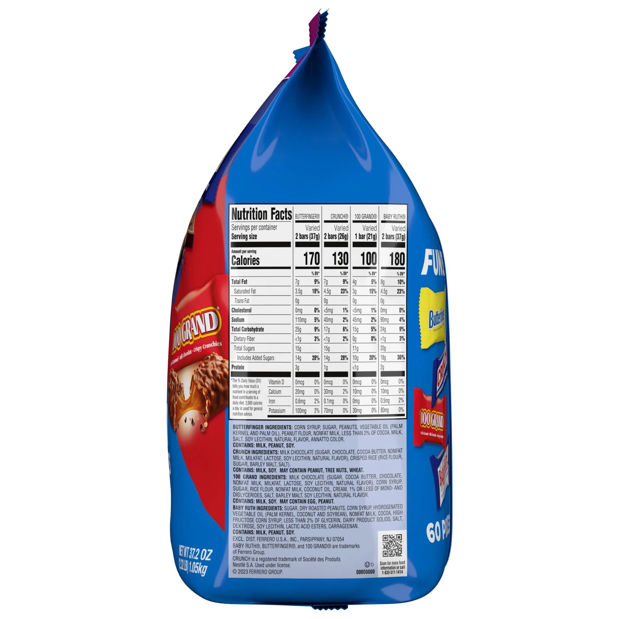 BABY RUTH INGREDIENTS: SUGAR, DRY ROASTED PEANUTS, CORN SYRUP, HYDROGENATED VEGETABLE OIL (PALM KERNEL, COCONUT AND SOYBEAN), NONFAT MILK, COCOA, HIGH FRUCTOSE CORN SYRUP, LESS THAN 2% OF GLYCERIN, DAIRY PRODUCT SOLIDS, SALT, DEXTROSE, SOY LECITHIN, LACTIC ACID ESTERS, CARRAGEENAN. ---- BUTTERFINGER INGREDIENTS: CORN SYRUP, SUGAR, PEANUTS, VEGETABLE OIL (PALM KERNEL AND PALM OIL), PEANUT FLOUR, NONFAT MILK, LESS THAN 2% OF COCOA, MILK, SALT, SOY LECITHIN, NATURAL FLAVOR, ANNATTO COLOR. ---- CRUNCH INGREDIENTS: MILK CHOCOLATE (SUGAR, CHOCOLATE, COCOA BUTTER, NONFAT MILK, MILKFAT, LACTOSE, SOY LECITHIN, NATURAL FLAVOR), CRISPED RICE (RICE FLOUR, SUGAR, BARLEY MALT, SALT). ---- 100 GRAND INGREDIENTS: MILK CHOCOLATE (SUGAR, COCOA BUTTER, CHOCOLATE, NONFAT MILK, MILKFAT, LACTOSE, SOY LECITHIN, NATURAL FLAVOR), CORN SYRUP, SUGAR, RICE FLOUR, NONFAT MILK, COCONUT OIL, CREAM, 1% OR LESS OF MONO- AND DIGLYCERIDES, SALT, BARLEY MALT, SOY LECITHIN, NATURAL FLAVOR./div>