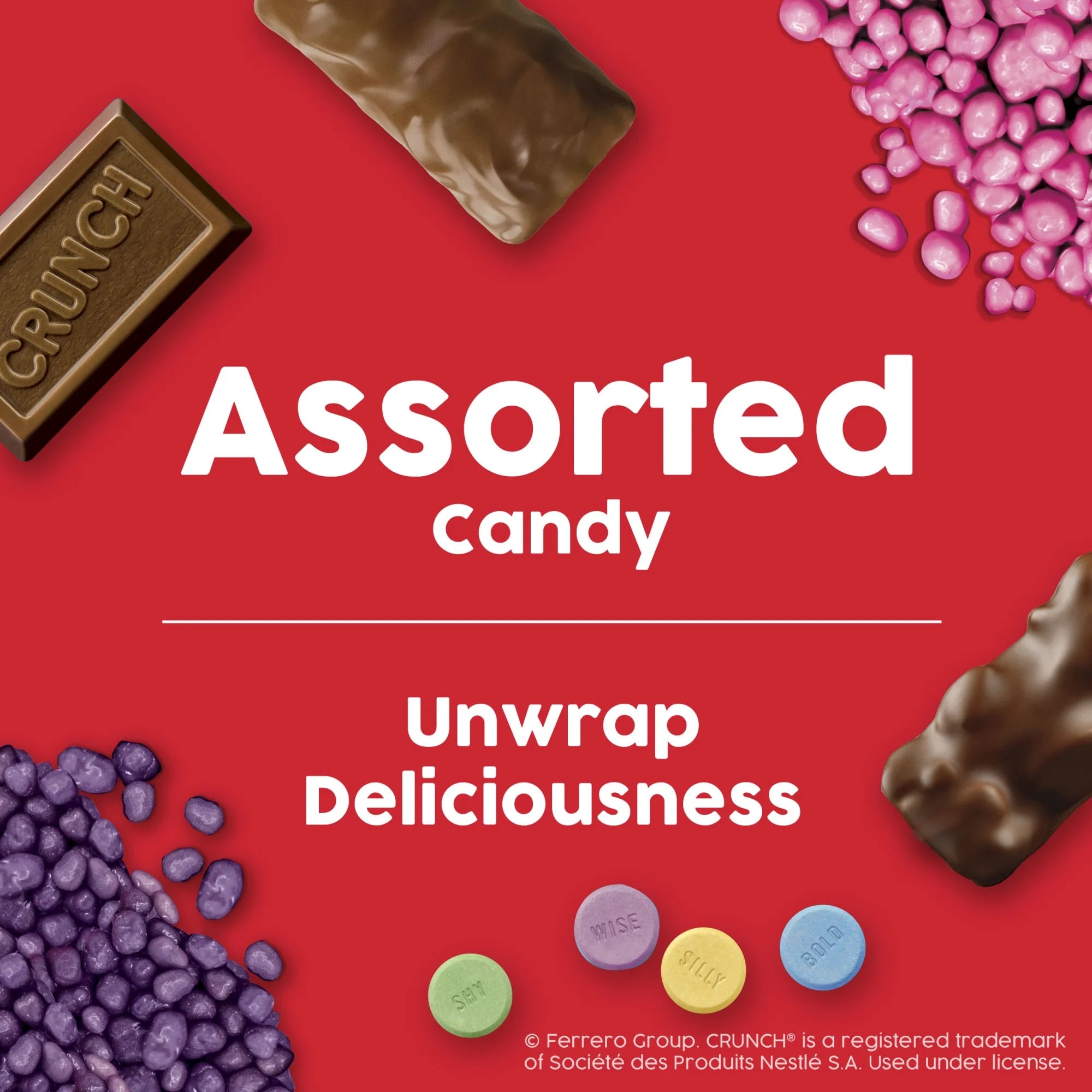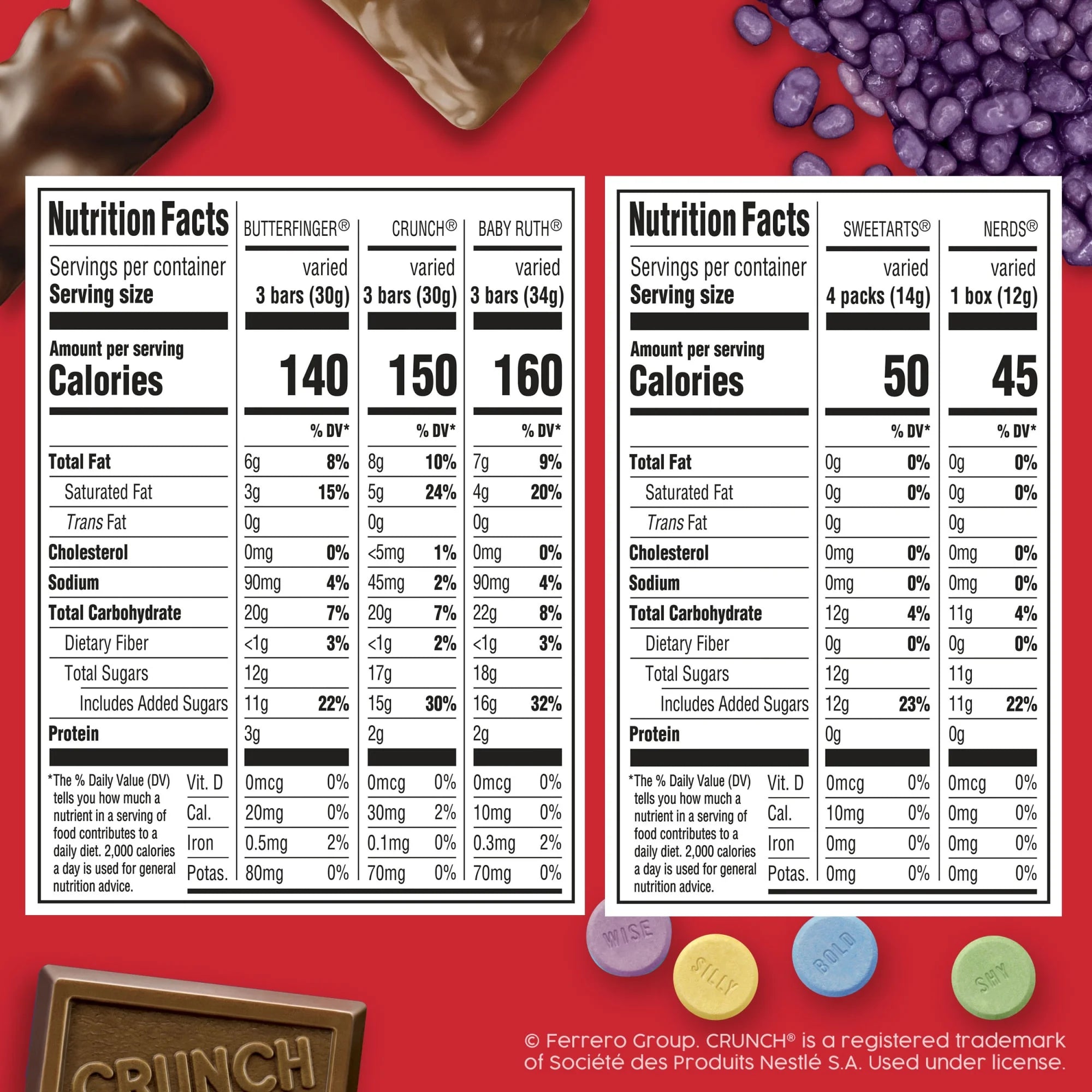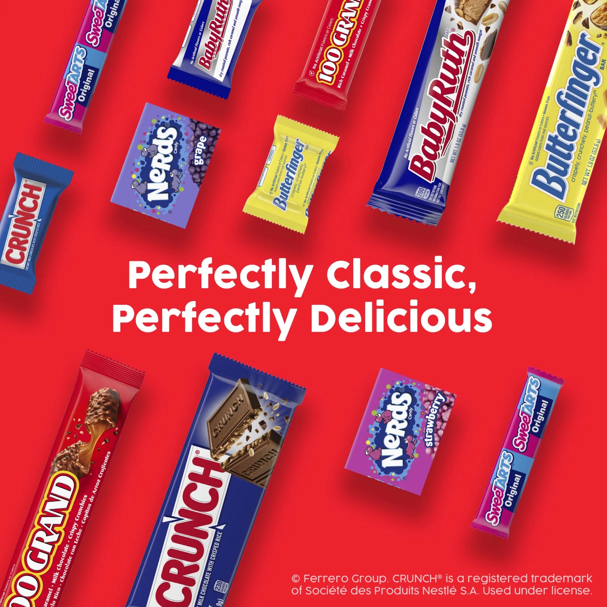 Are you in the mood for something sweet, crunchy, chewy, chocolatey or peanut-buttery? Why not have it all? There’s no need to choose just one flavor with this assortment of Butterfinger, CRUNCH, Baby Ruth, Nerds and SweetTarts. Enjoy a variety pack of six fan favorites in this 140-count monster bag of mini size assorted candy all dressed up for Halloween. Discover a blend of Halloween treats that’s perfectly classic and delicious—from the peanut-buttery kick of Butterfinger to the crunchy bite of crisped rice in a CRUNCH bar and the irresistible blend of dry roasted peanut and nougat in each Baby Ruth bar. Plus, enjoy the sweet colorful fun of SweetTarts and grape-strawberry Nerds. These candy treats are individually wrapped and make the perfect on-the-go snack to share with friends, family and coworkers any time of the year. Add these candies to your Halloween candy bowl and put a big smile on the face of every trick-or-treater who comes knocking on your door. Grab a bag of assorted favorites today to bring your Halloween snacks game to the next level.
