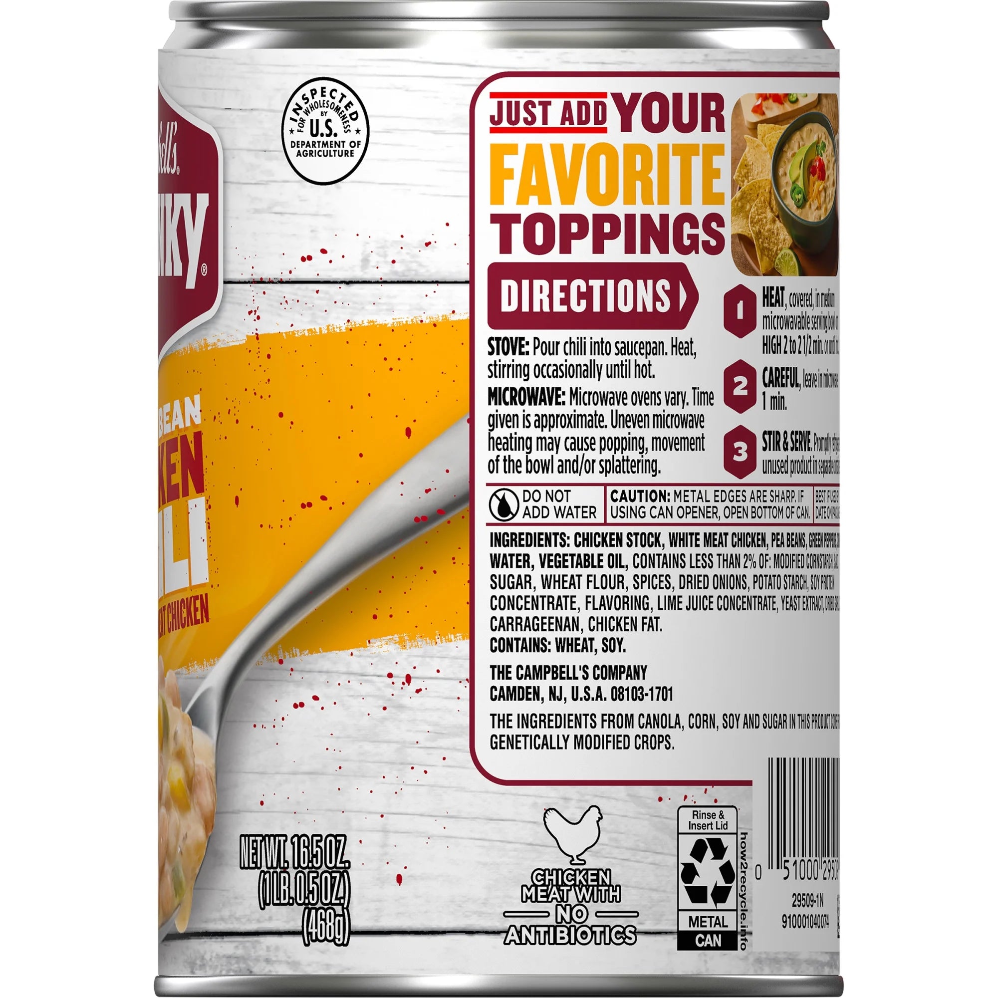 Ingredients: Chicken Stock, White Meat Chicken, Pea Beans, Green Peppers, Corn, Water, Vegetable Oil, Contains Less Than 2% Of: Modified Cornstarch, Salt, Sugar, Wheat Flour, Spices, Dried Onions, Potato Starch, Soy Protein Concentrate, Flavoring, Lime Juice Concentrate, Yeast Extract, Dried Garlic, Carrageenan, Chicken Fat. Contains: Wheat, Soy/div>