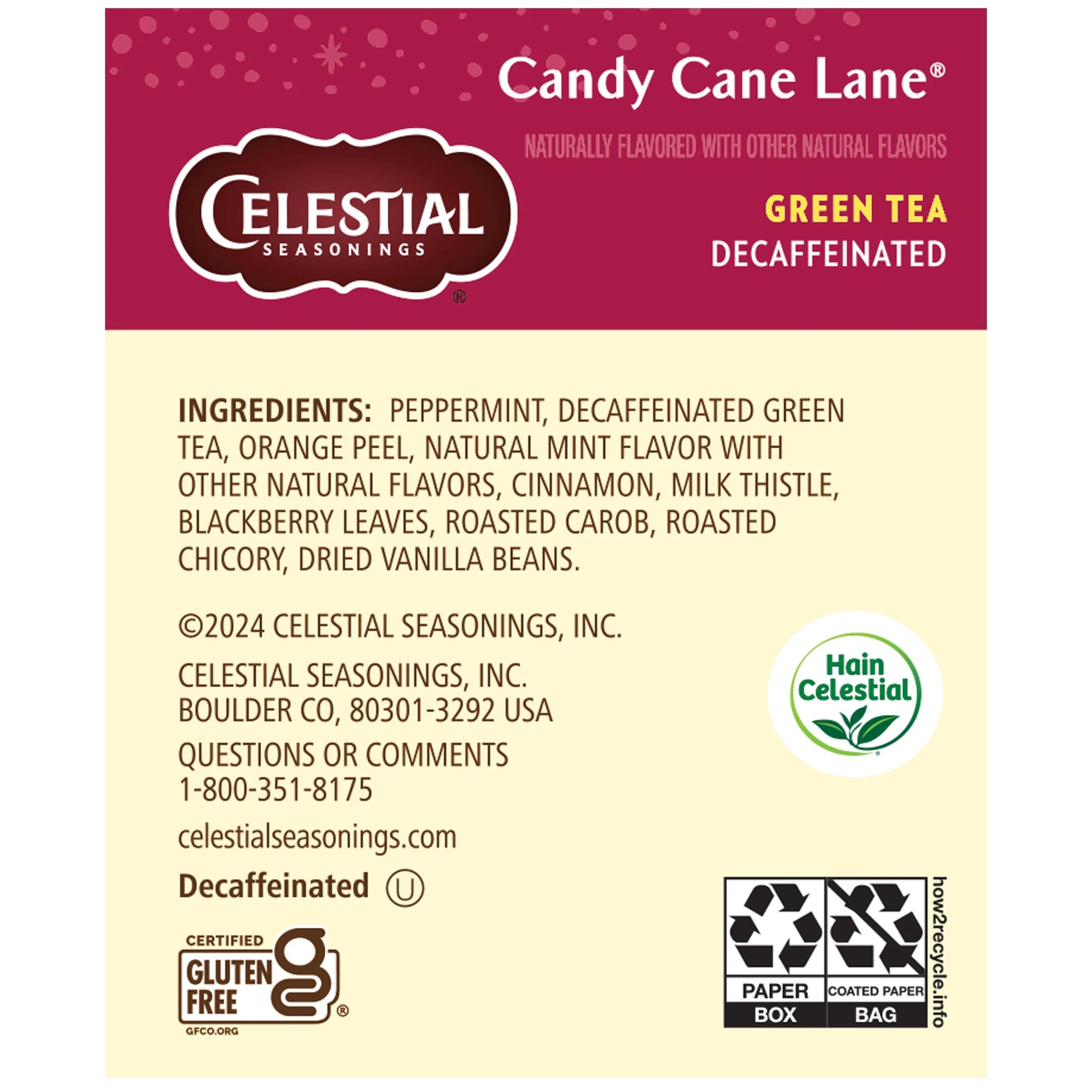 Celestial Seasonings Holiday Decaffeinated Candy Cane Lane Green Tea Bags, 18 Count