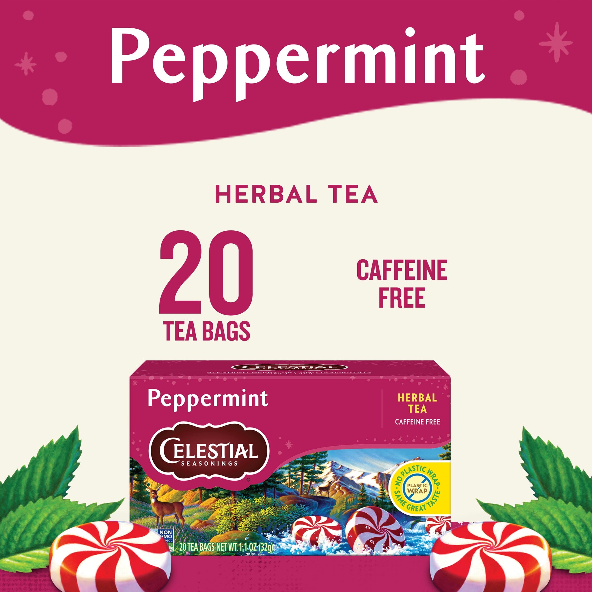 Nothing is more soothing than a cup of your favorite tea. Celestial Seasonings Peppermint Herbal Tea is the perfect caffeine-free addition to your daily routine, offering a cool, refreshing taste with pure peppermint leaves from the Pacific Northwest. Not only does it refresh, but it also soothes the belly, making it a comforting choice any time of day. Put some magic in your mug and enjoy the goodness found in every cup of Celestial Seasonings Teas! When we started Celestial Seasonings in 1969, we were inspired by the awesome power of nature right outside our door in the Rocky Mountains. We foraged the fields and forests for herbs and botanicals, creating unique and delicious blends as America’s first herbal tea company. Today we’re still crafting tea in Boulder, Colorado under the watchful eye of our blend master, creating teas that are bursting with benefits, flavor, and our passion for inspiring a happier and healthier life.