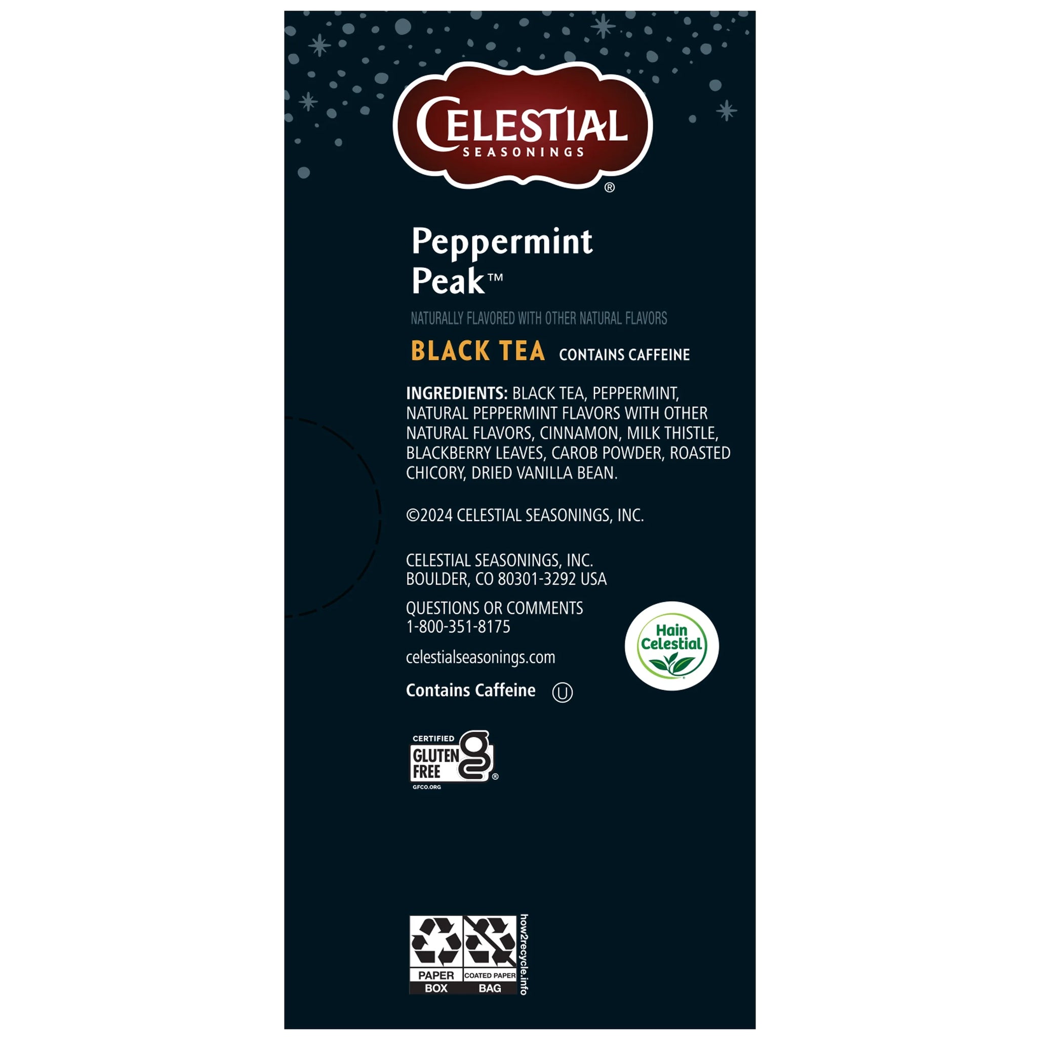 BLACK TEA, PEPPERMINT, NATURAL PEPPERMINT FLAVORS WITH OTHER NATURAL FLAVORS, CINNAMON, MILK THISTLE, BLACKBERRY LEAVES, ROASTED CAROB, ROASTED CHICORY AND VANILLA BEAN./div>