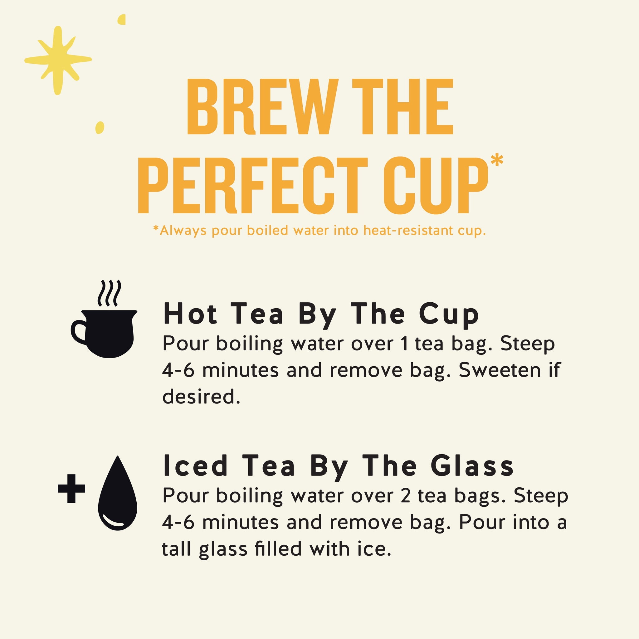 - HOT TEA BY THE CUP Pour freshly boiled water over one tea bag. Steep 3 to 5 minutes and remove tea bag. Sweeten if desired. ICED TEA BY THE GLASS Pour boiled water over two tea bags. Steep 3 to 5 minutes and remove tea bags. Pour into a tall glass filled with ice.