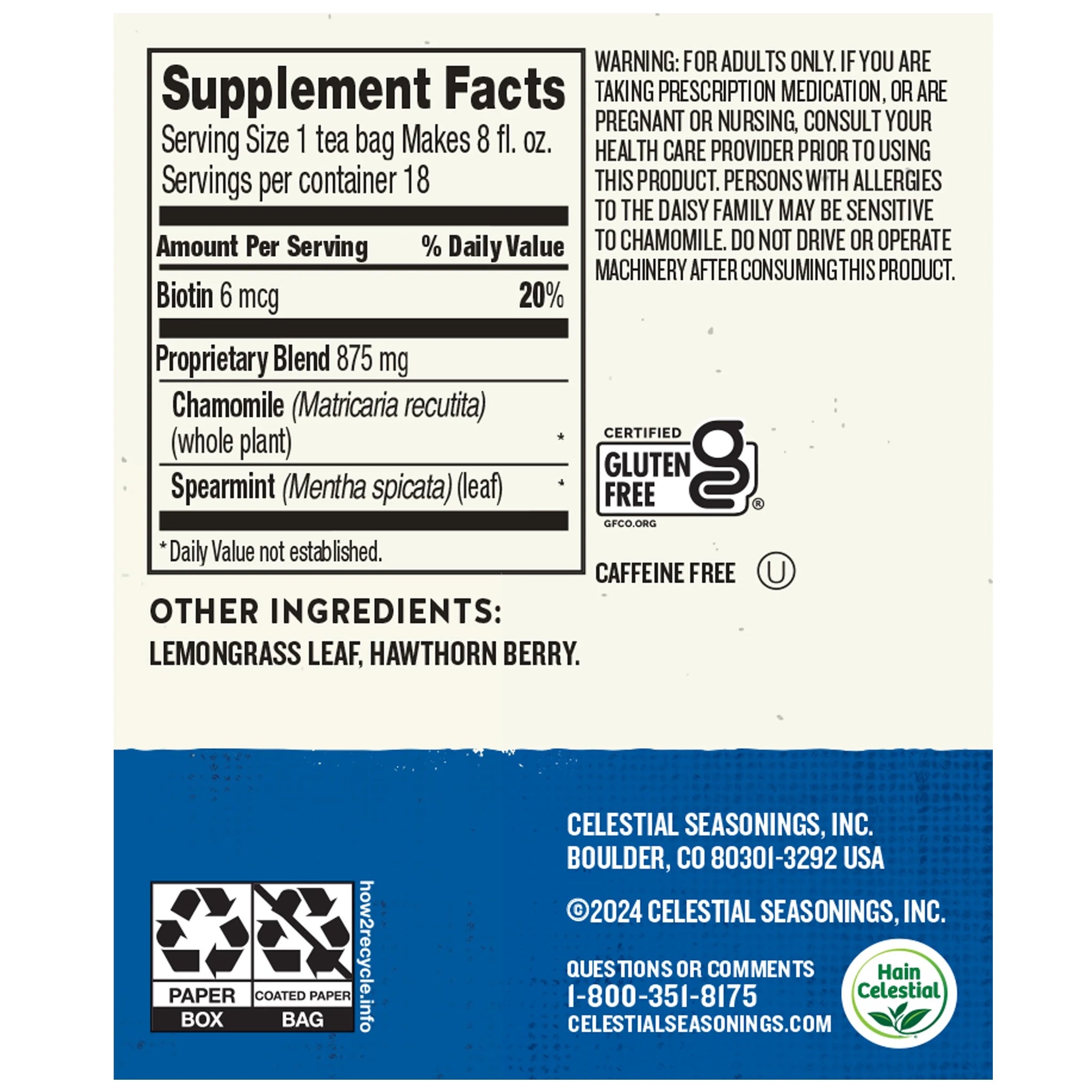 This relaxing caffeine-free tea starts with the beloved Sleepytime blend of soothing chamomile and spearmint. We then add biotin (vitamin B7) to help complement your self-care routine. More than 50 years ago, we created a truly soothing herbal tea to help folks wind down the day. We named it Sleepytime tea and it quickly became everyone’s favorite bedtime tea. Today our calming Sleepytime blend of botanicals is in herbal, decaf green and wellness teas, so you can always find the perfect cup for your bedtime routine. When we started Celestial Seasonings in 1969, we were inspired by the awesome power of nature right outside our door in the Rocky Mountains. We foraged the fields and forests for herbs and botanicals, creating unique & delicious blends as America’s first herbal tea company. Today we’re still crafting tea in Boulder, Colorado under the watchful eye of our Blendmaster, creating teas that are bursting with benefits, flavor, and our passion for inspiring a happier and healthier life.