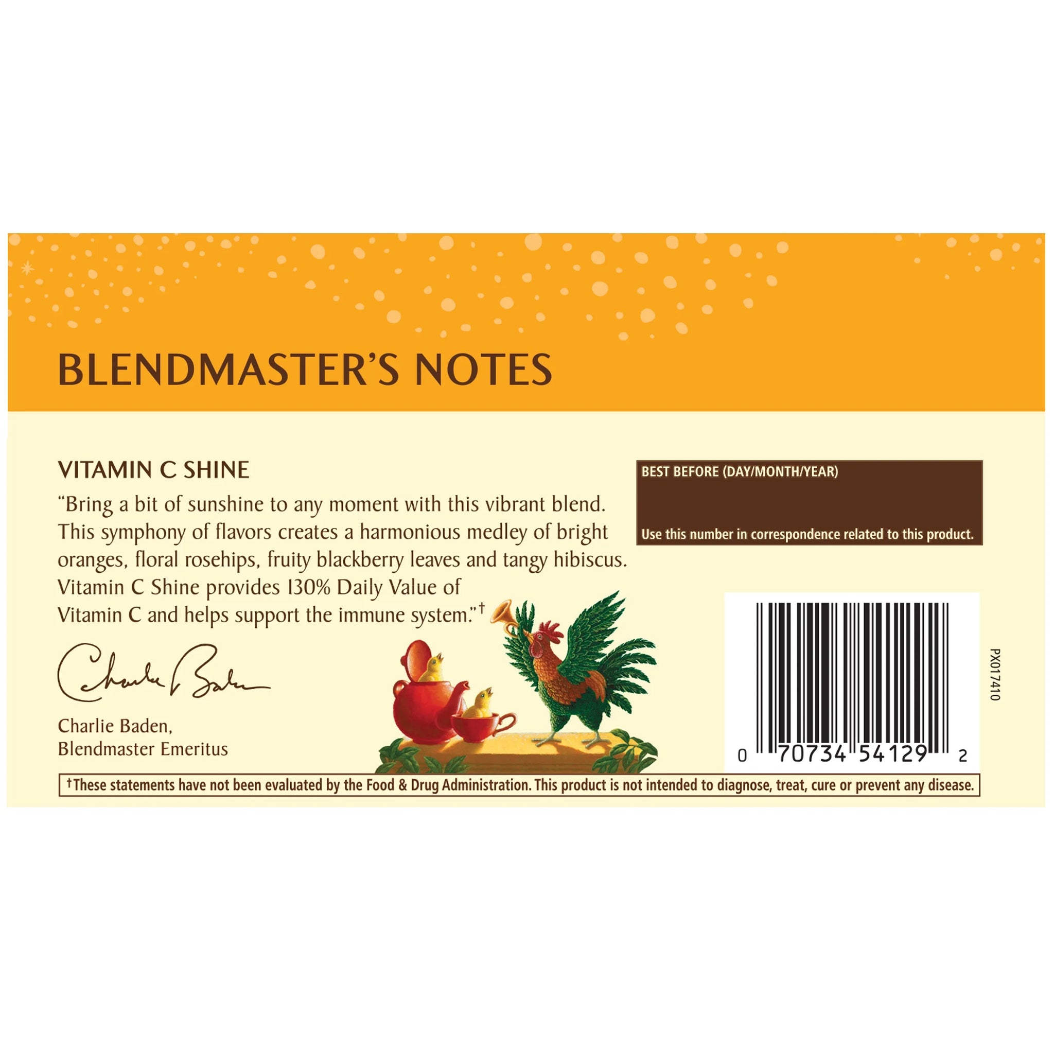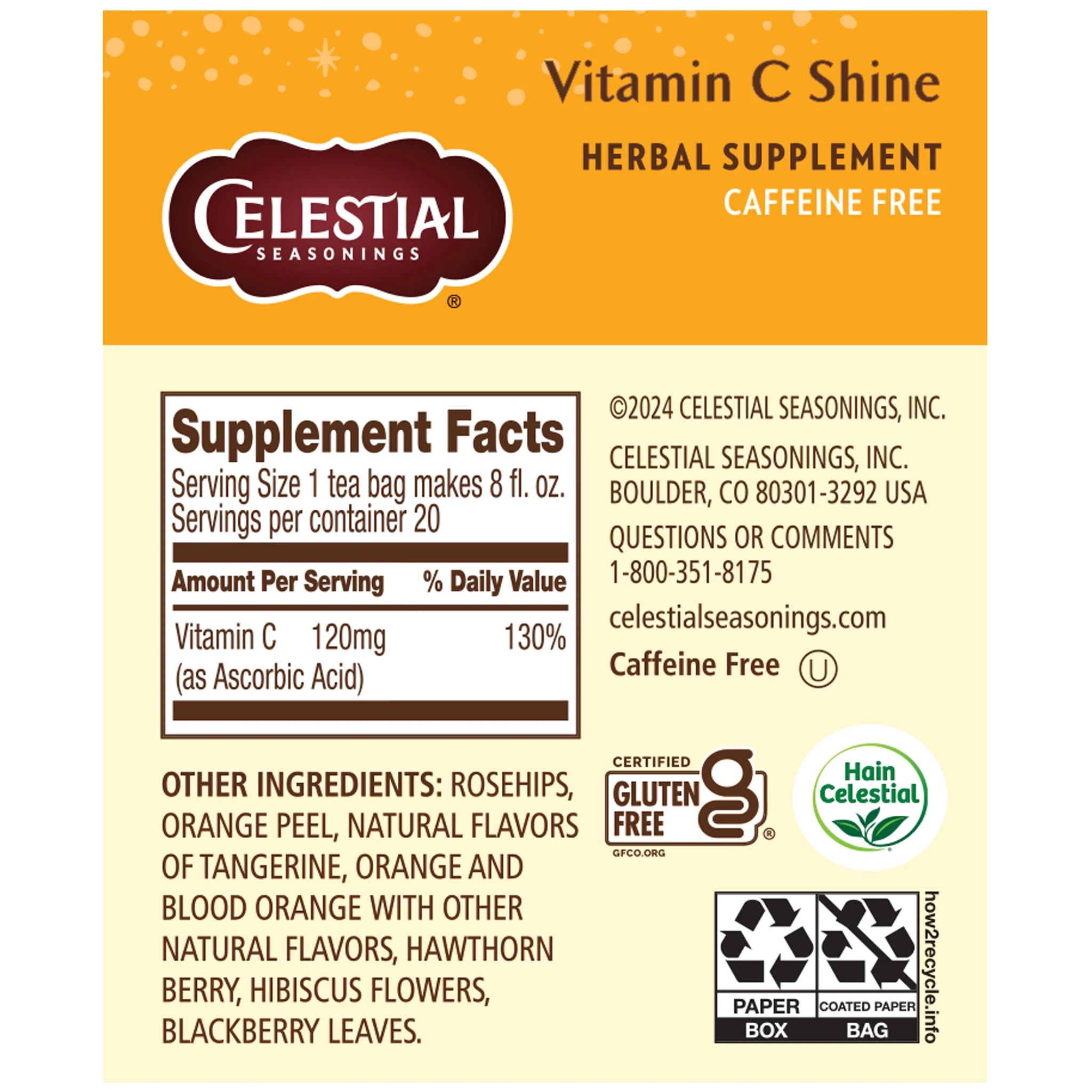 Nothing is more soothing than a cup of your favorite tea. Celestial Seasonings Vitamin C Shine Herbal Tea is the perfect caffeine free addition to your daily routine. This citrusy blend of orange, tangerine, blackberry leaves, and hibiscus provides 130% daily value of vitamin C and is just as delicious hot as cold. Put some magic in your mug and enjoy the goodness found in every cup of Celestial Seasonings Teas.Celestial Seasonings teas are an invitation to put some magic in your mug! When we started Celestial Seasonings in 1969, we were inspired by the awesome power of nature right outside our door in the Rocky Mountains. We foraged the fields and forests for herbs and botanicals, creating unique and delicious blends as America’s first herbal tea company. Today we’re still crafting tea in Boulder, Colorado under the watchful eye of our blend master, creating teas that are bursting with benefits, flavor, and our passion for inspiring a happier and healthier life.
