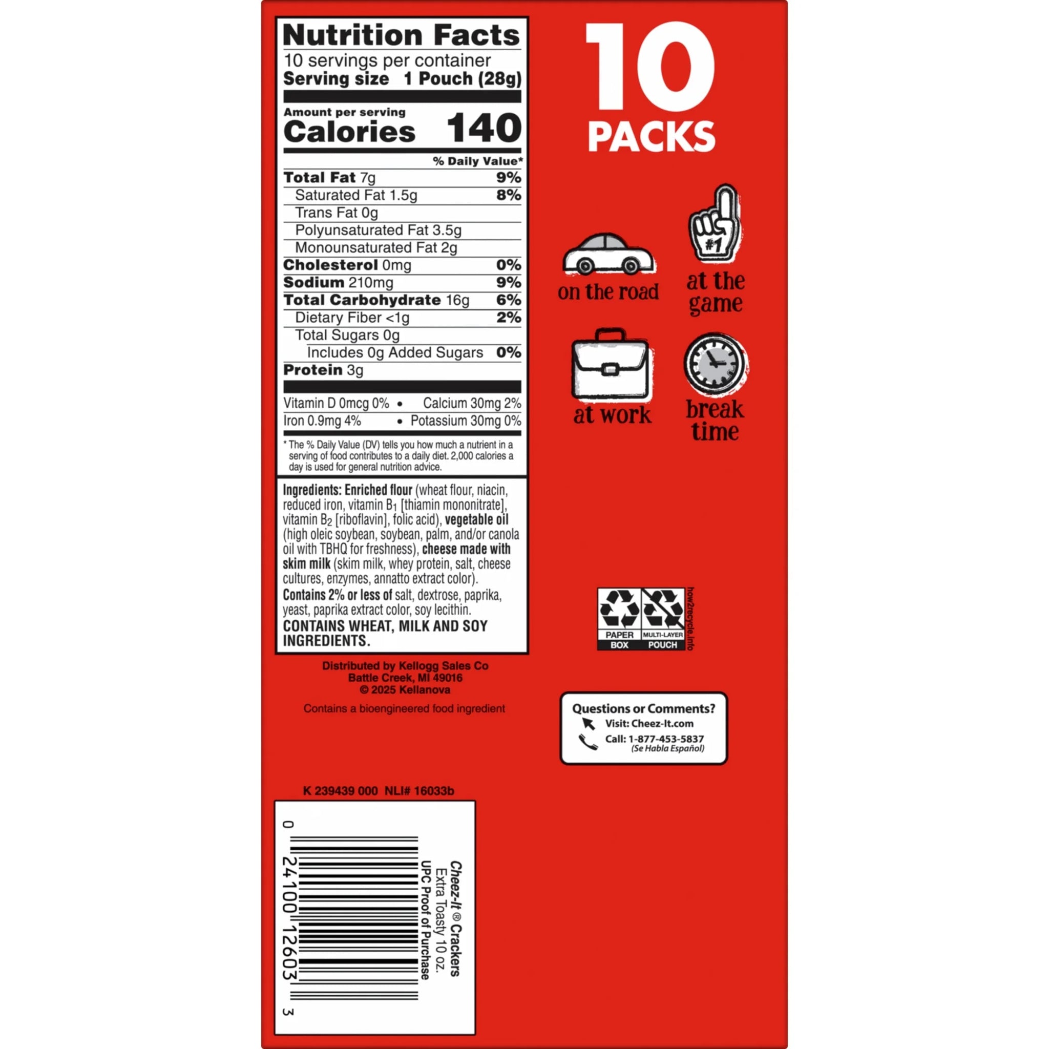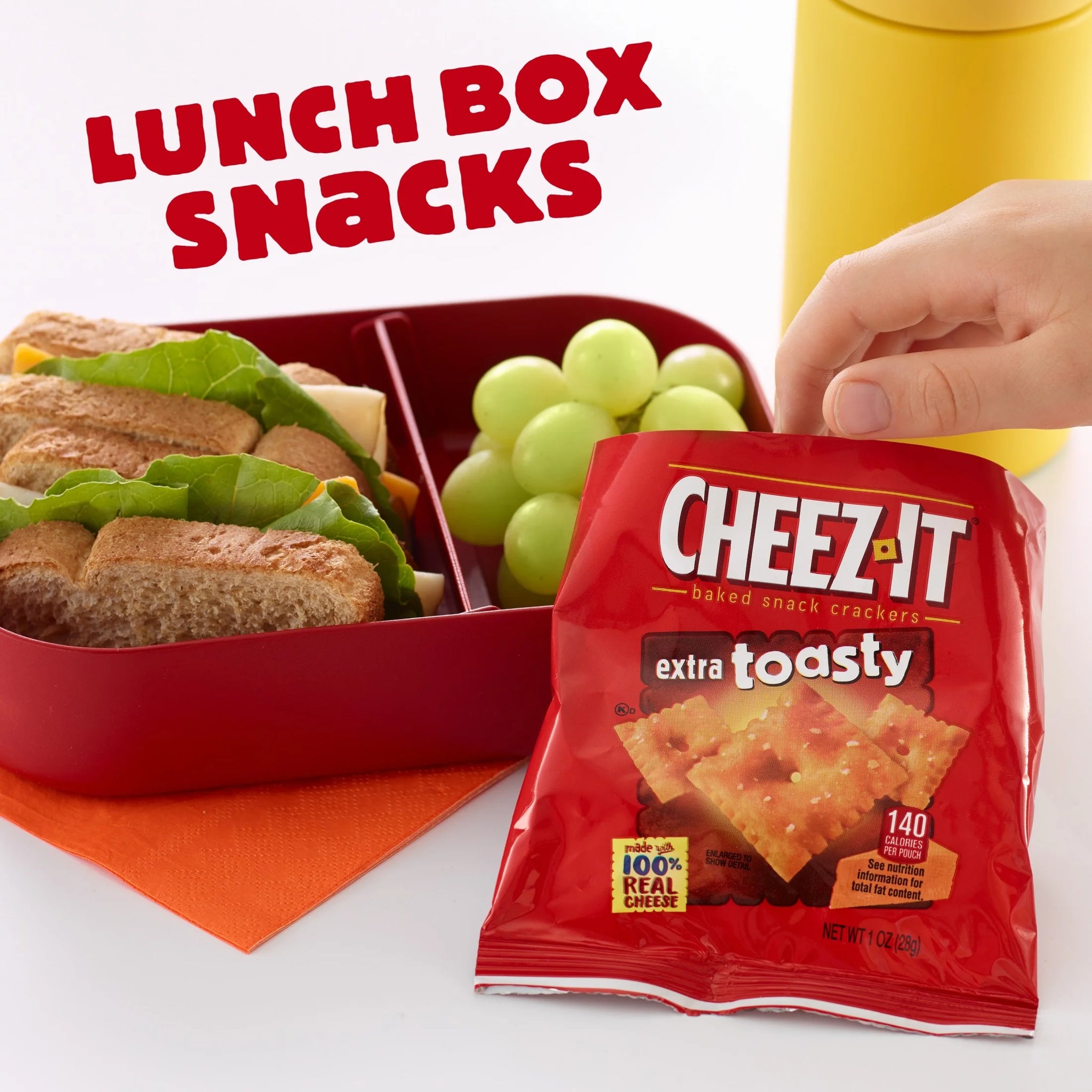 Outrageously cheesy and perfectly portable, these pouches of Cheez-It Extra Toasty baked snack crackers contain deliciously crunchy little crackers that have captured cheese-lovers for decades. Discover a crowd-favorite extra toasty snack made with 100% real cheese baked to crispy perfection for an irresistible taste in every crunchy bite. Each lightly salted cracker is loaded with a burst of cheesy flavor and baked for extra toastiness; Cheez-It baked snack crackers are an on-the-go fan-favorite for game night, school snacks, family movie nights, late-night snacking, and so much more, the cheesy options are endless. Delicious for all ages, grab a pouch of Cheez-It Extra Toasty crackers for every family snacking moment. Whether you're packing them in school lunches, grabbing some for the office, or taking along on a road trip, you'll find a delicious, crisp snack that is filled with big cheese flavor. It’s no wonder that these bite-sized crackers have become a crowd-favorite. CONTAINS WHEAT, MILK AND SOY INGREDIENTS. Shelf-Stable.