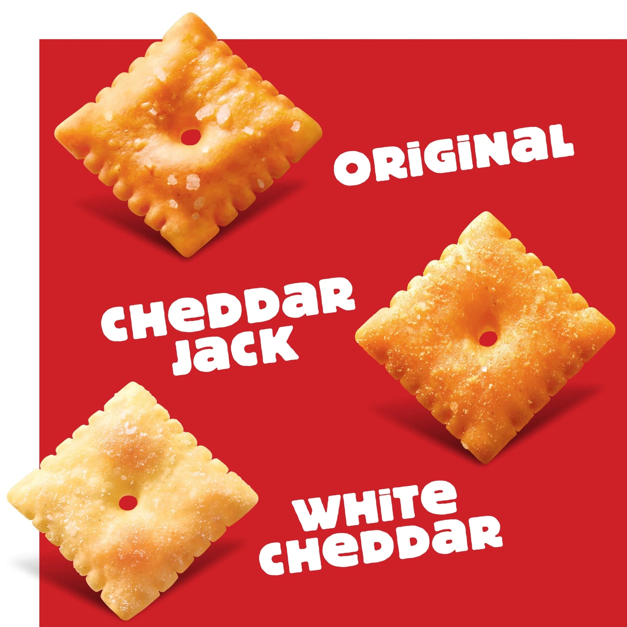 • Variety pack of Cheez-It Original, White Cheddar, and Cheddar Jack flavors; Deliciously cheesy, light and crispy baked snack crackers