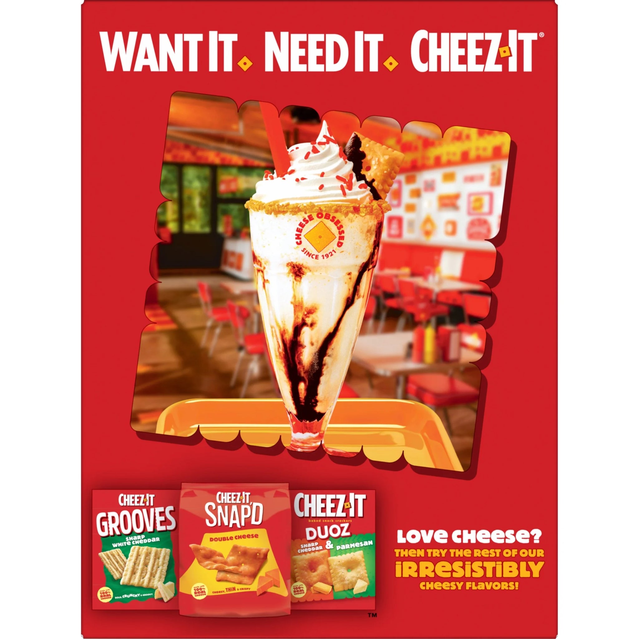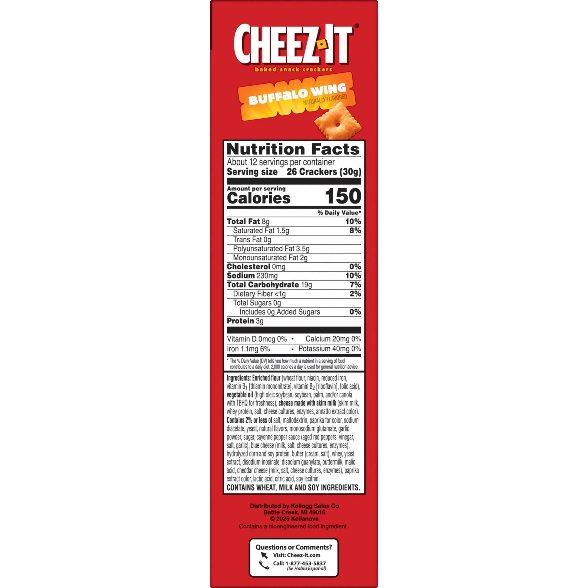 Make snack time more fun with Cheez-It baked snack crackers, featuring the deliciously craveable flavor of buffalo wing. Cheez-It baked snack crackers are made with 100% real cheese that's been carefully aged for a one-of-a-kind taste in every crunchy bite. A delectable baked snack, Cheez-It crackers are perfect for game time, party spreads, school lunches, late-night snacking and more - the irresistible cheese options are endless. You'll love the bold flavor of real cheese in every perfectly toasted handful of Cheez-It Buffalo Wing Baked Snack Crackers. CONTAINS WHEAT, MILK AND SOY INGREDIENTS. Shelf-Stable.