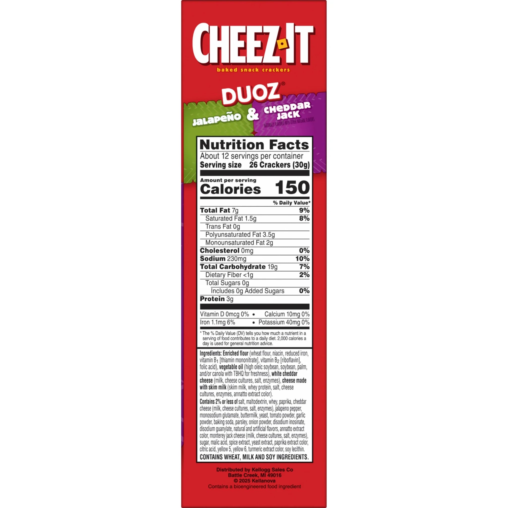 Two bold flavors combined in 1 Cheez-It Duoz box? It’s an outrageously craveable combo cheese lovers can’t resist. Cheez-It Duoz Jalapeño and Cheddar Jack baked snack crackers are made with 100% real cheese, carefully aged for a one-of-a-kind taste. Spicy jalapeño and bold cheddar jack flavors pack a crunch of cheesy goodness; Cheez-It Duoz baked snack crackers are a fan-favorite for game night, school snacks, party spreads, video gaming, and so much more. The cheesy options are endless! Go ahead and pick up a box of your favorite combo of cheesy snacks that’ll keep you coming back for more. Whether you're packing them in school lunches, taking some to the office, or enjoying them on a road trip, you'll find a delicious, crisp snack that's filled with big cheese flavor. You’ll love that one-of-a-kind cheesy taste in every bite of Cheez-It Duoz. Grab a handful of Cheez-It baked snack crackers and start munchin'. CONTAINS WHEAT, MILK AND SOY INGREDIENTS. Shelf-Stable.