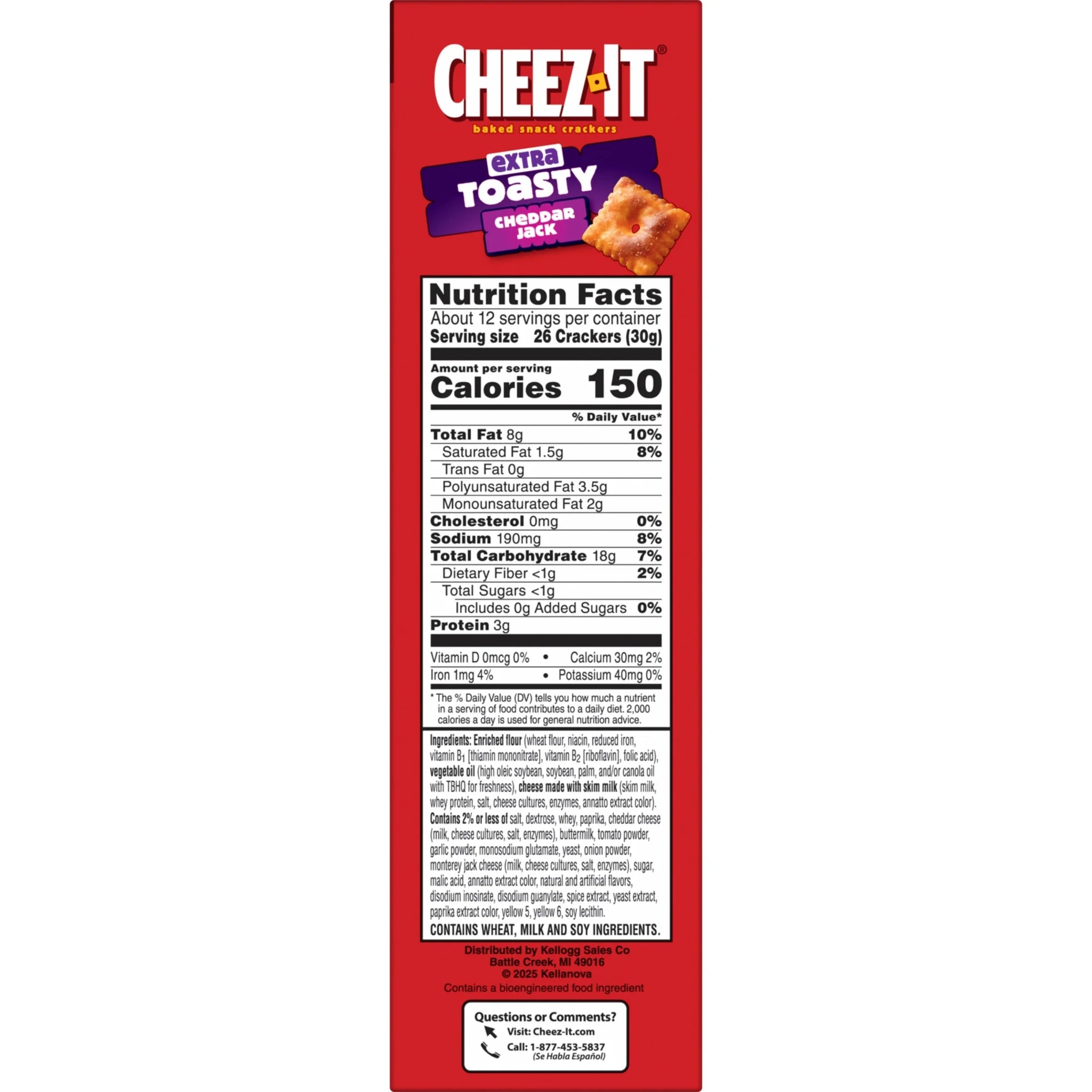 Make snack time more fun with Cheez-It Extra Toasty Cheddar Jack Baked Snack Crackers. Includes one, 12.4-ounce Cheez-It Extra Toasty Cheddar Jack Baked Snack Crackers box made with 100% real cheese and toasted just right for an irresistible taste. Each perfect square is baked to crisp, toasty perfection for an added snap with each bite and loaded with bold, cheddar jack cheese flavor. A baked snack, these Cheez-It crackers are perfect for lunch sides, late-night bites and more; the cheesy options are endless. Bring the cheesy goodness of Cheez-It crackers along on field trips, camping, hiking, trips to the park, picnics, outdoor concerts, everyday errands, and more. The antidote to flavorless crackers, Cheez-It Extra Toasty Cheddar Jack crackers are packed with irresistible cheesy flavor and make a great addition to homemade snack mixes and party mixes. You'll love the flavor of real cheese in every toasty handful of Cheez-It Extra Toasty Cheddar Jack Baked Snack Crackers. CONTAINS WHEAT, MILK AND SOY INGREDIENTS. Shelf-Stable.