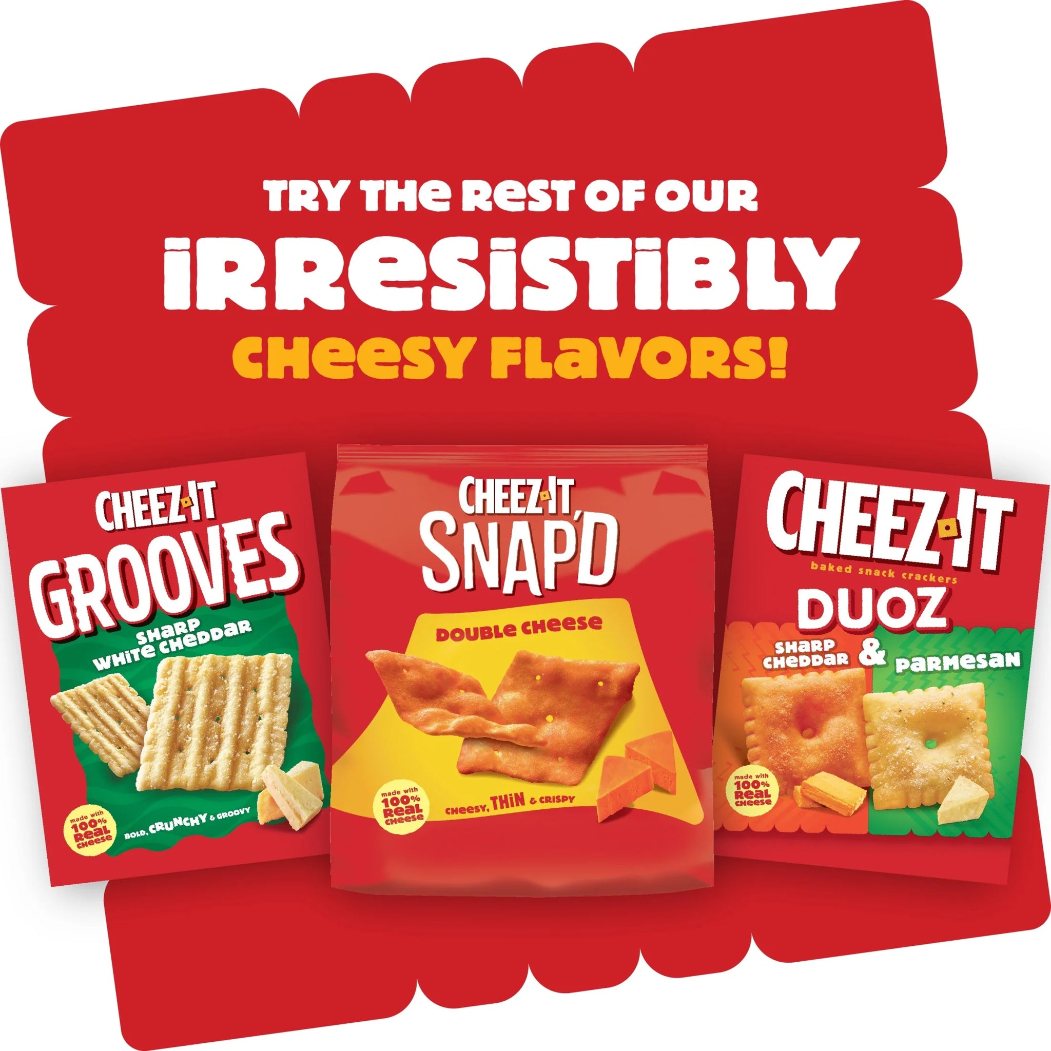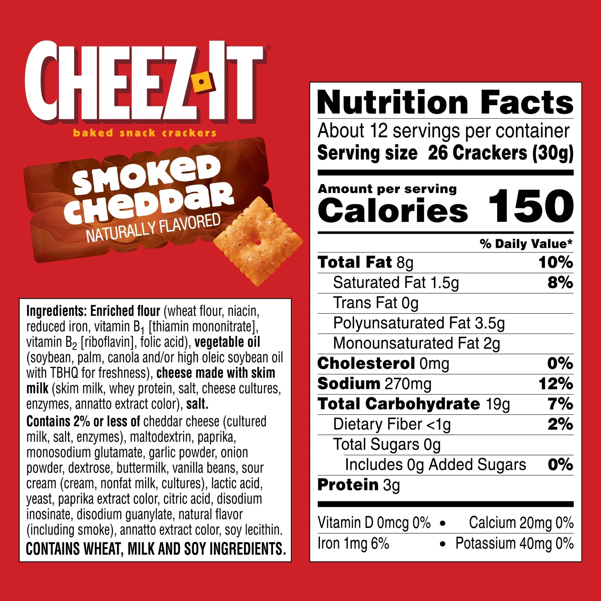 Outrageously cheesy and ridiculously craveable, Cheez-It baked snack crackers are deliciously crunchy little crackers that have captured cheese-lovers for decades. Discover a Smoked Cheddar snack made with 100% real cheese baked to crispy perfection for an irresistible taste in every crunchy bite. Each lightly salted cracker is loaded with smoky, rich sharp cheddar cheese flavor; Cheez-It baked snack crackers are a fan-favorite for game night, school snacks, family movie nights, party spreads, late-night snacking, and so much more, the cheesy options are endless. Delicious for all ages, grab a box of Cheez-It Smoked Cheddar crackers for every family snacking moment. Whether you're packing them in school lunches, grabbing some for the office, or taking along on a road trip, you'll find a delicious, crisp snack that is filled with big cheese flavor. It’s no wonder these bite-sized crackers have become a crowd-favorite, bringing smiles and that urge for just one more handful. CONTAINS WHEAT, MILK AND SOY INGREDIENTS. Shelf-Stable.