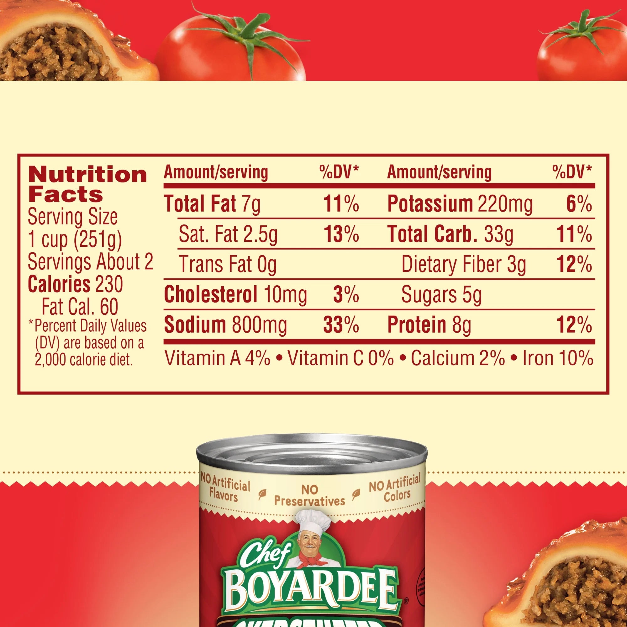 - Chef Boyardee Overstuffed Beef Ravioli contains 2 servings of beef ravioli and tomato sauce in each 15 oz, easy-open can, with 180 calories per serving