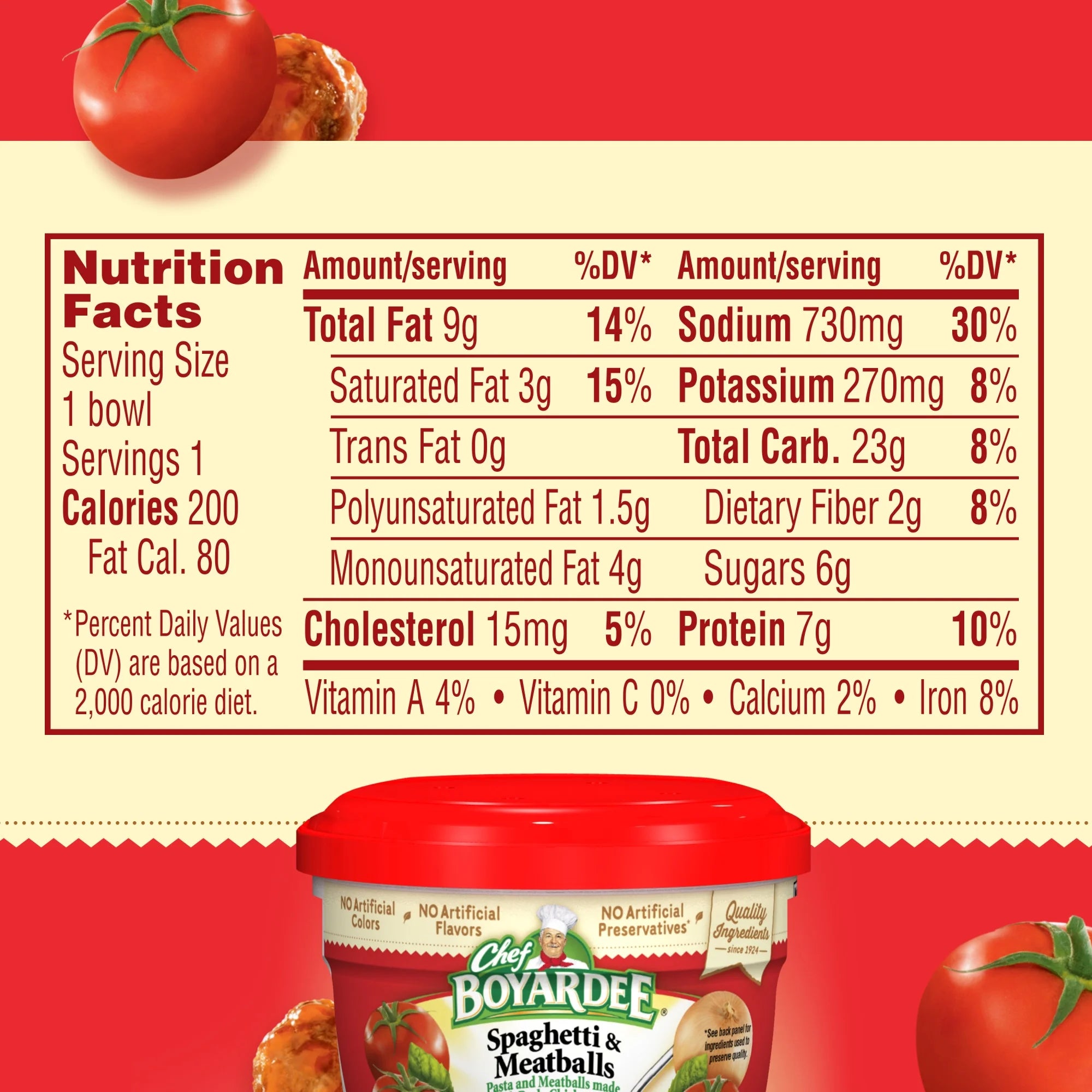 Chef Boyardee Spaghetti & Meatballs combines pasta noodles with hearty meatballs in a creamy tomato sauce. This classic Chef Boyardee crowd-pleaser contains no artificial flavors, colors, or preservatives. Chef Boyardee meatballs are made with a combination of pork, chicken, and beef. The microwavable bowl makes it easy to create a quick pasta meal in minutes. With 7 g protein and 0 g trans fat per serving, Chef Boyardee Spaghetti & Meatballs is perfect for a hearty dinner or tasty after-school snack. From pizza sauce to spaghetti, ravioli, and lasagna, there's something for everyone to enjoy from Chef Boyardee.