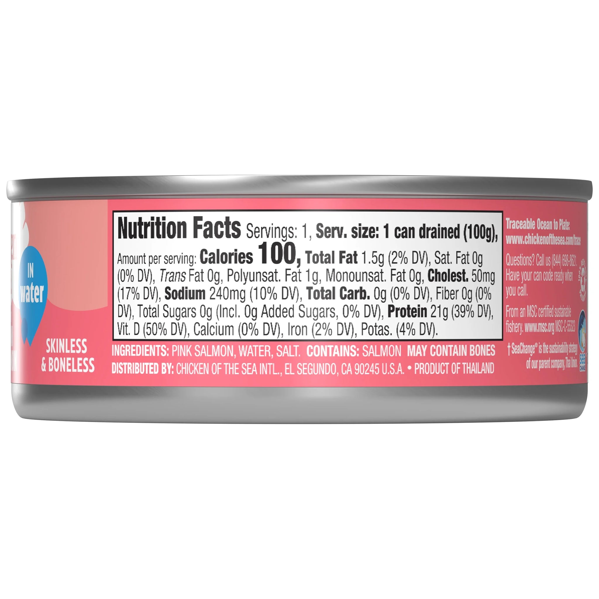 Chicken of the Sea Pink Salmon cans contain high quality cuts of boneless, skinless wild salmon that are perfectly seasoned with a hint of salt and packed in spring water for a delicious, clean flavor. It isn’t just scrumptiously tasty and loaded with essential nutrients—hellooo, omega-3s and lean protein—it’s also gluten-free and made from simple ingredients with no preservatives. Each can of Chicken of the Sea boneless and skinless pink salmon contains 22 grams of protein, 2 grams of total fat, and 0 grams of carbs—perfect for keto, paleo, and Mediterranean diets. Pair Chicken of the Sea canned salmon with simple ingredients for a satisfying snack, to enhance a beautiful salad or to use for your favorite salmon patties. This shelf stable salmon product is EBT eligible.