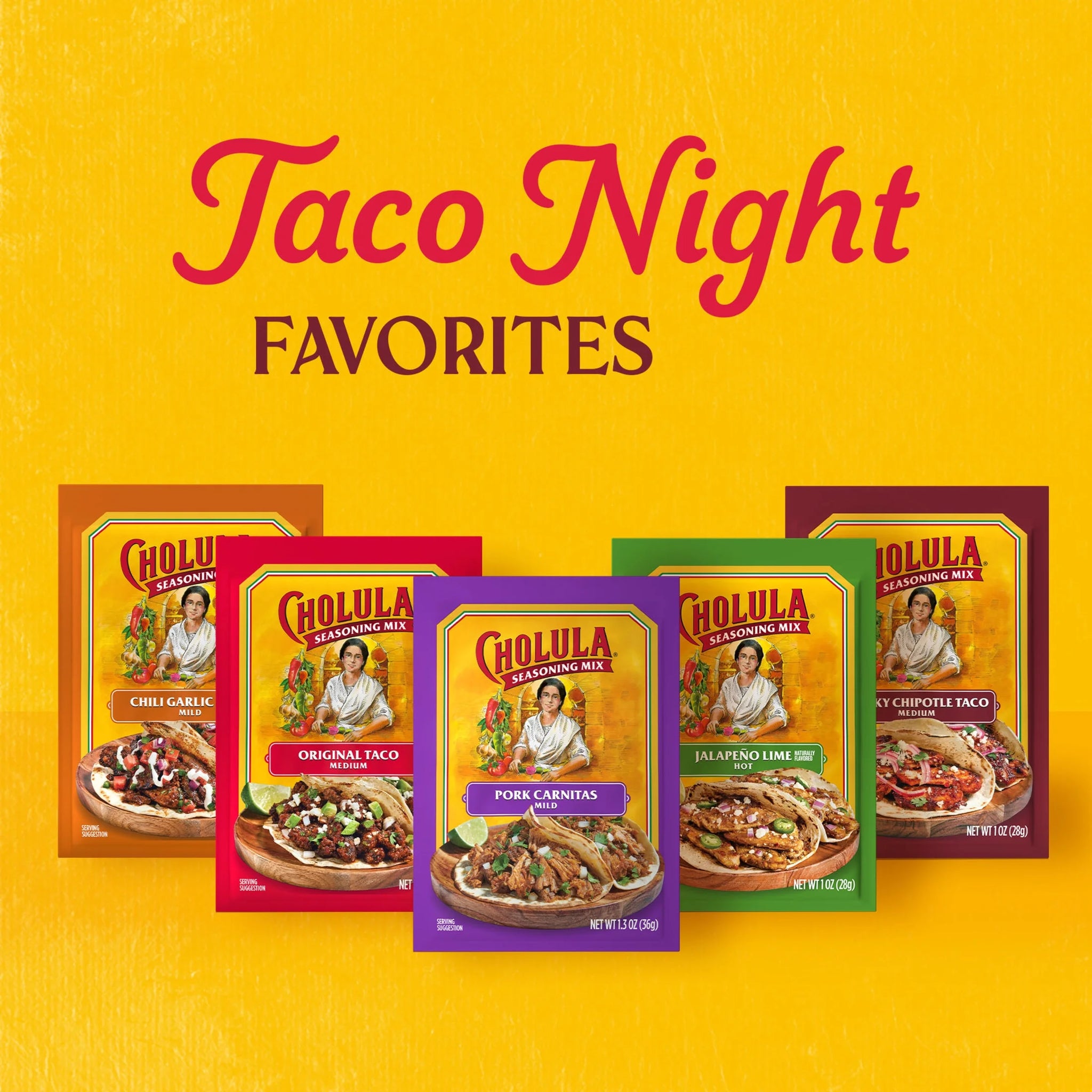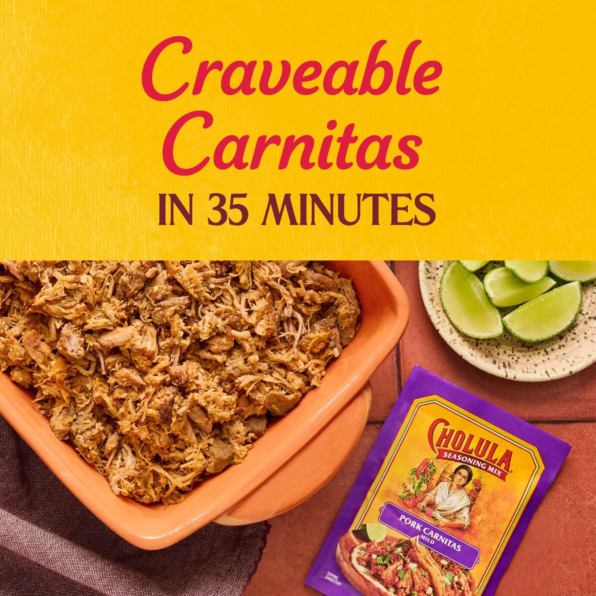 Cholula Pork Carnitas - Mild Seasoning Mix, 1.3 oz Bag. Invite flavor to your table with Cholula Pork Carnitas Mild Seasoning Mix. A savory blend of citrus flavors and signature Cholula peppers, seasoning mix makes it easy to serve up a delicious carnitas meal any day of the week. Carnitas, meaning "little meats,” is the Mexican version of pulled pork, infused with rich, Mexican-inspired flavors while slow cooking. You can recreate a similar taste and tenderness in your kitchen by preparing pork shoulder roast with Pork Carnitas Mild Seasoning Mix in a pressure cooker. The result is juicy, flavorful meat with that can be fork-shredded for tacos, burrito bowls, enchiladas and more. Garnish with toppings like avocado, a squeeze of lime, and of course – a generous shake of Cholula Hot Sauce. Fall in love with Cholula from the very first bite. Whether you're unscrewing the distinct wooden cap on our hot sauces, or cooking with our flavorful collection of salsas, seasoning mixes, cremosas, and more, a world of delicious possibilities is unlocked with the authentic Mexican flavor of Cholula. This Cholula Pork Carnitas - Mild Seasoning Mix is in a Plastic bag that is 1.3 ounces. Store this shelf-stable item at an ambient temperature.