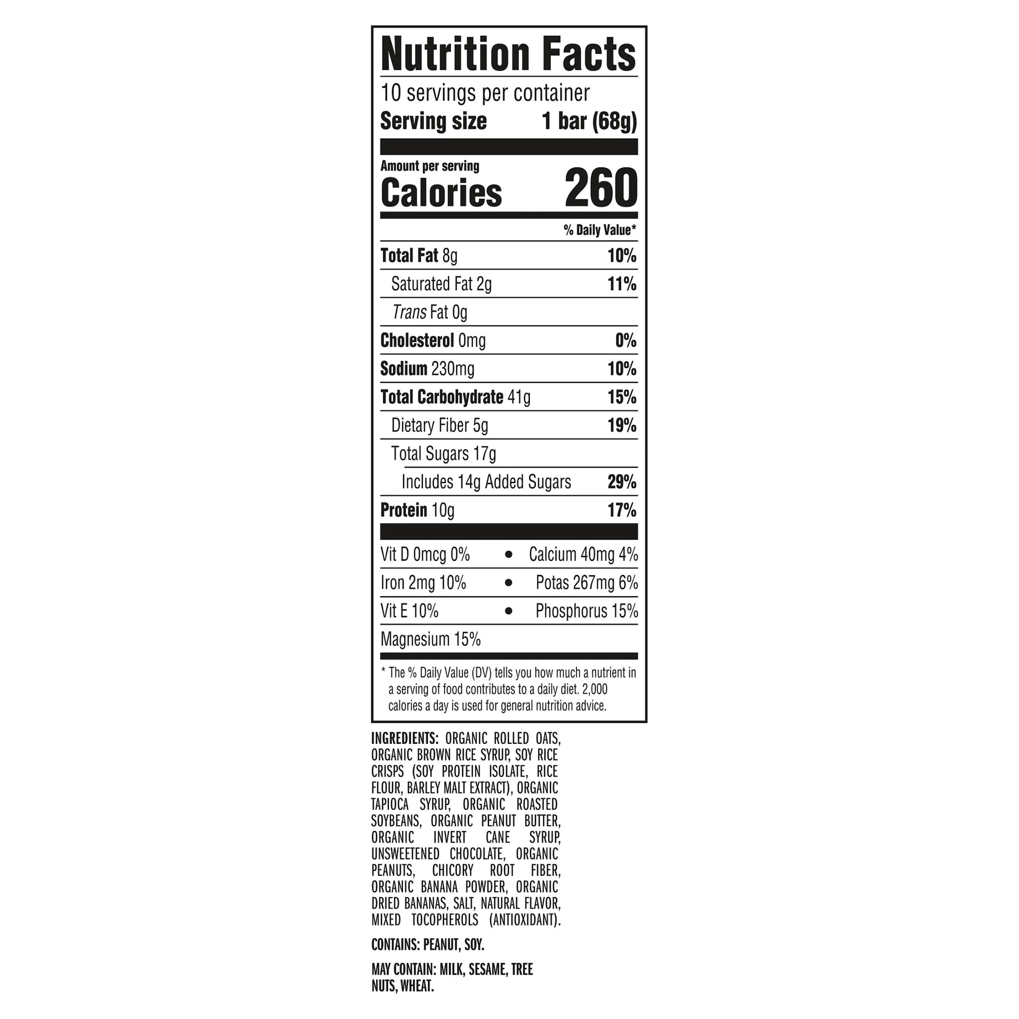 Organic Rolled Oats, Organic Brown Rice Syrup, Soy Rice Crisps (Soy Protein Isolate, Rice Flour, Barley Malt Extract), Organic Tapioca Syrup, Organic Roasted Soybeans, Organic Peanut Butter, Organic Invert Cane Syrup, Unsweetened Chocolate, Organic Peanuts, Chicory Root Fiber, Organic Banana Powder, Organic Dried Bananas, Salt, Natural Flavor, Mixed Tocopherols (Antioxidant). Contains: Peanut, Soy. May Contain: Milk, Sesame, Tree Nuts, Wheat./div>