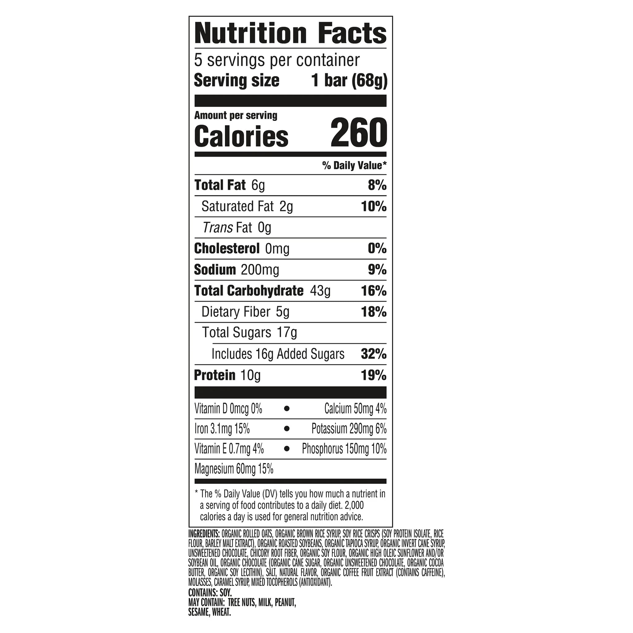 Organic Rolled Oats, Organic Brown Rice Syrup, Soy Rice Crisps (Soy Protein Isolate, Rice Flour, Barley Malt Extract), Organic Roasted Soybeans, Organic Tapioca Syrup, Organic Invert Cane Syrup, Unsweetened Chocolate, Chicory Root Fiber, Organic Soy Flour, Organic High Oleic Sunflower And/Or Soybean Oil, Organic Chocolate (Organic Cane Sugar, Organic Unsweetened Chocolate, Organic Cocoa Butter, Organic Soy Lecithin), Salt, Natural Flavor, Organic Coffee Fruit Extract (Contains Caffeine), Molasses, Caramel Syrup, Mixed Tocopherols (Antioxidant). Contains: Soy. May Contain: Tree Nuts, Milk, Peanut, Sesame, Wheat./div>