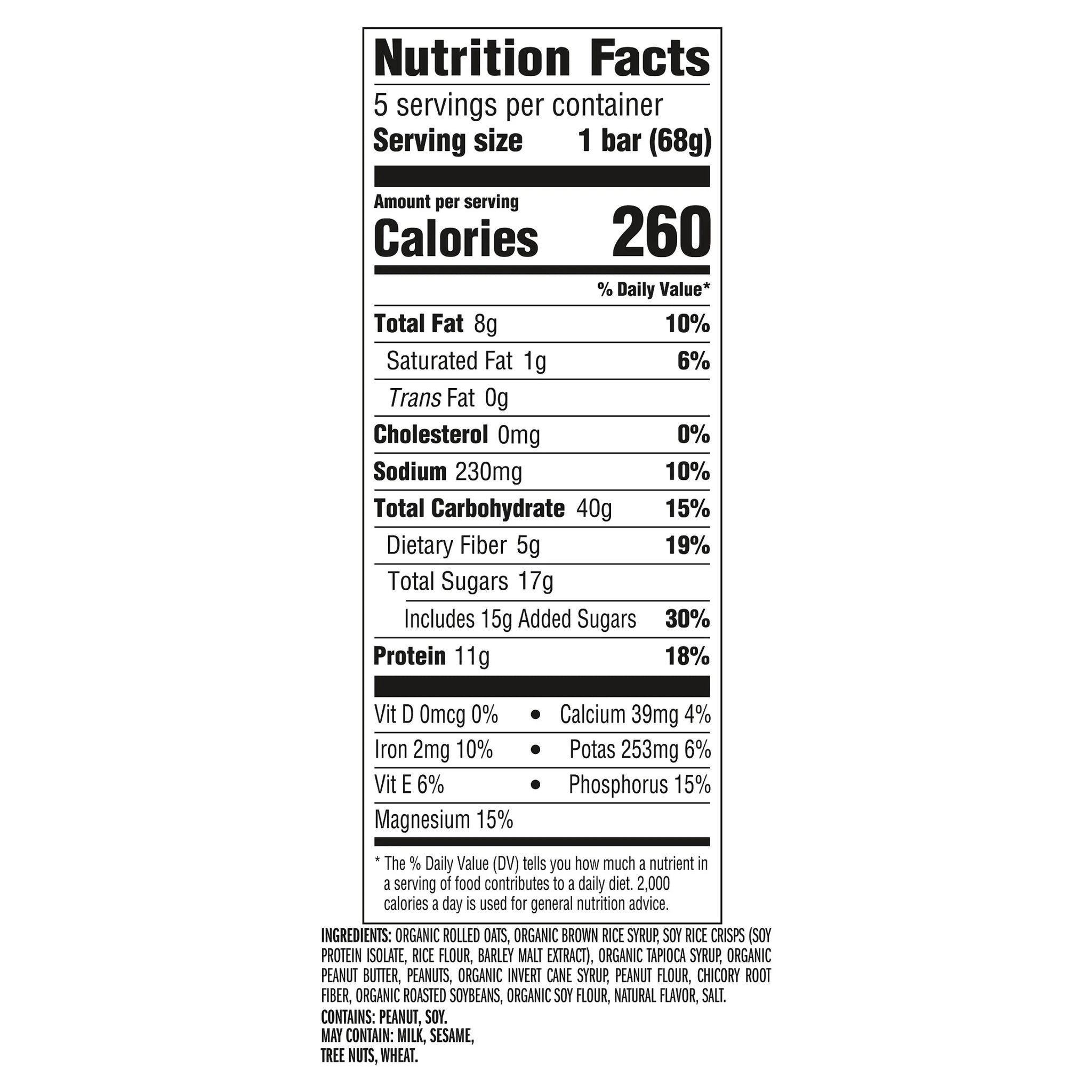 Organic Rolled Oats, Organic Brown Rice Syrup, Soy Rice Crisps (Soy Protein Isolate, Rice Flour, Barley Malt Extract), Organic Tapioca Syrup, Organic Peanut Butter, Peanuts, Organic Invert Cane Syrup, Peanut Flour, Chicory Root Fiber, Organic Roasted Soybeans, Organic Soy Flour, Natural Flavor, Salt. Contains: Peanut, Soy. May Contain: Milk, Sesame, Tree Nuts, Wheat./div>