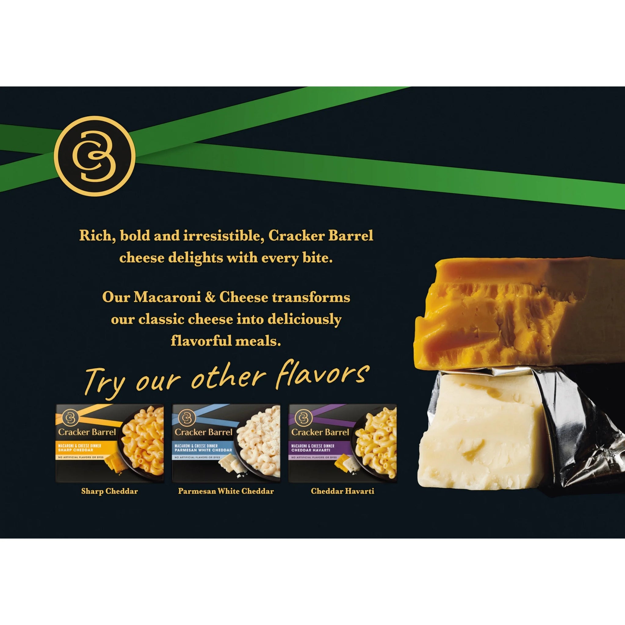 Enjoy the rich, bold and irresistible taste of our Cracker Barrel Sharp White Cheddar Macaroni & Cheese Dinner. Made with no artificial flavors or dyes, our famous mac and cheese is a savory dish you can feel good about serving your family. Looking for quick meals, sides or kids meals? Our convenient boxed macaroni and cheese contains 12g of protein per serving and brings easy meals together. Enjoy our macaroni and cheese on its own, try combining with your choice of protein or veggies, or simply serve as a side dish with your main entree. Our mac and cheese dinner is easy to prepare — just boil 2 quarts (8 cups) of water, add pasta and cook 11 to 12 minutes or until tender. Drain, do not rinse, and return to the pan. Then, squeeze the cheese sauce over the hot macaroni, stir until blended and enjoy. Each 14-ounce box makes about four servings. The difference is in the cheese, with smooth and creamy Cracker Barrel Macaroni and Cheese. Our macaroni and cheese transforms our classic cheese into deliciously flavorful meals. If you enjoy our Cracker Barrel Sharp White Cheddar Macaroni & Cheese Dinner, be sure to try our other flavors: Sharp Cheddar, Parmesan White Cheddar and Cheddar Havarti.