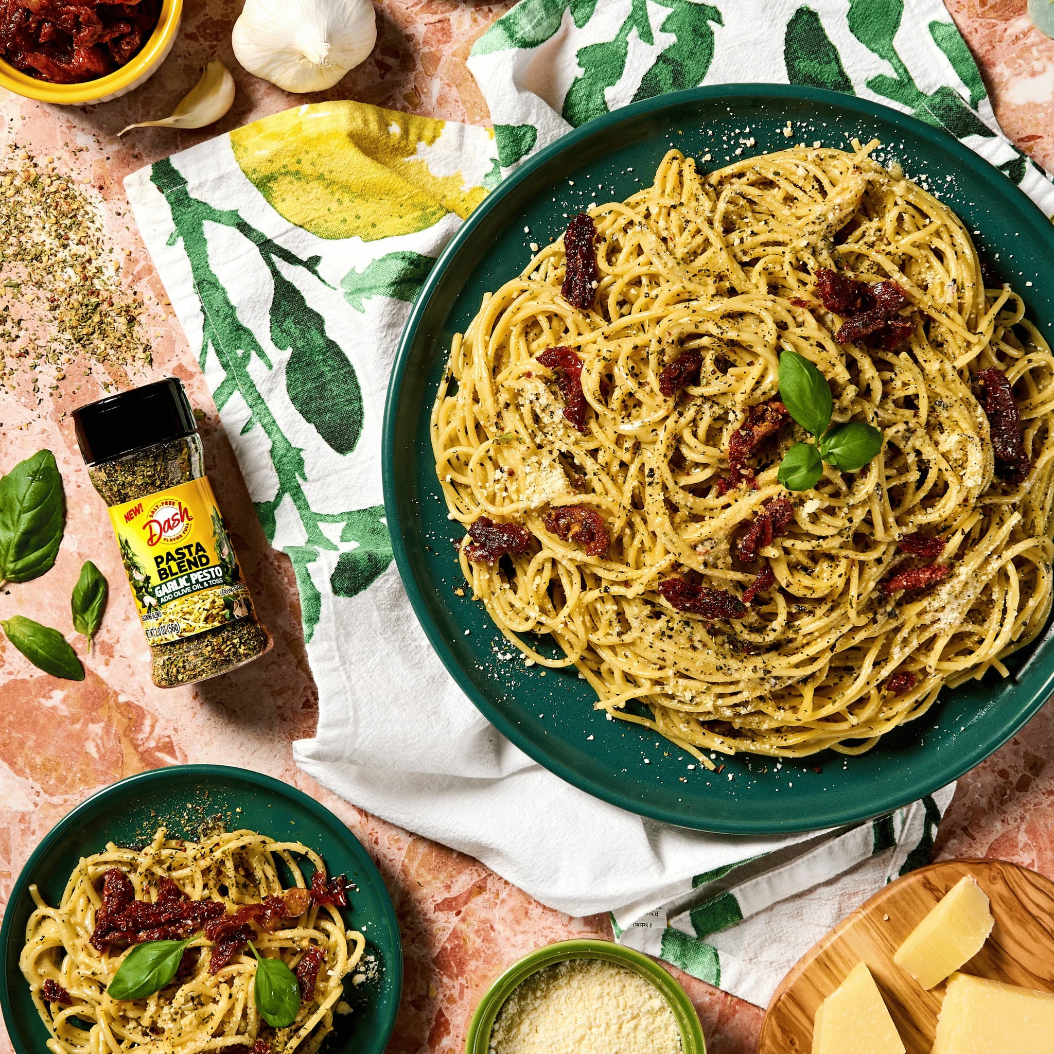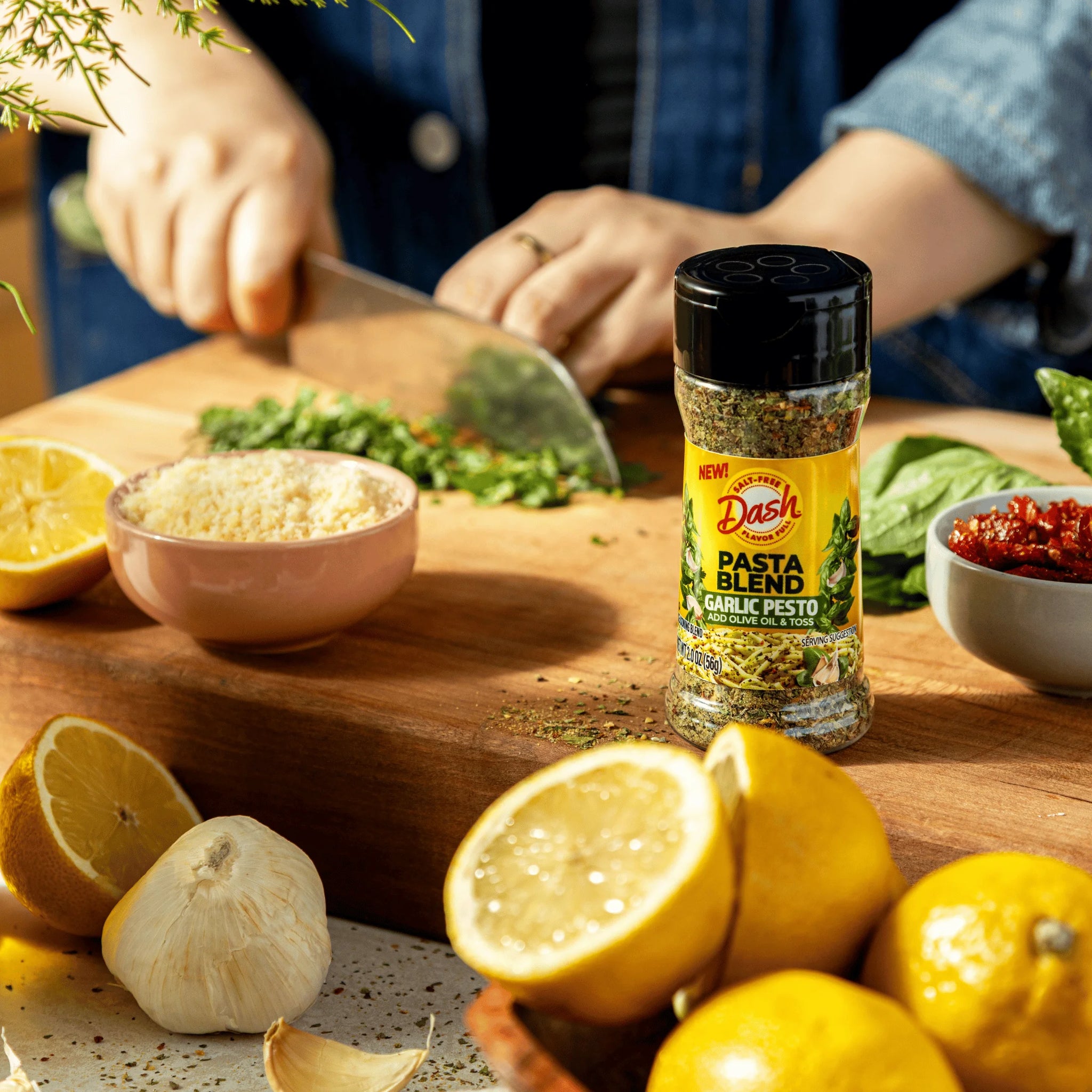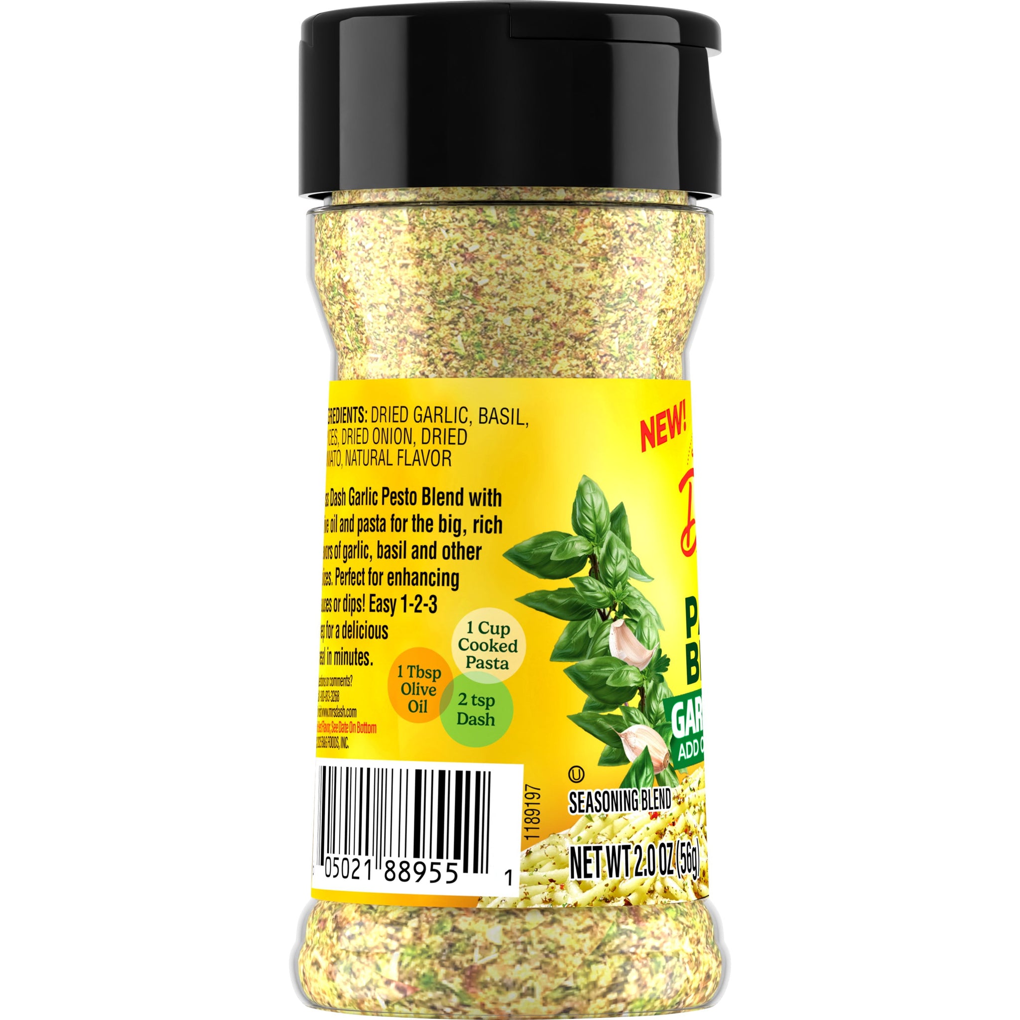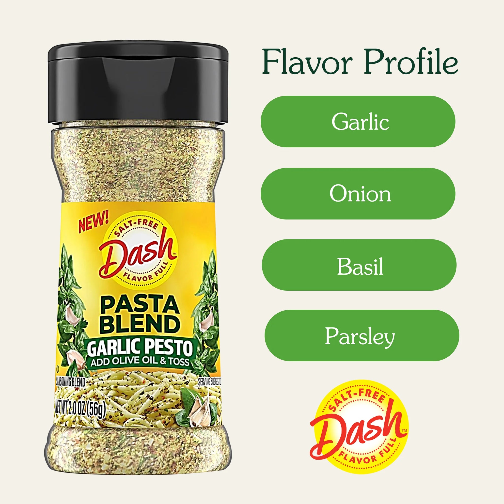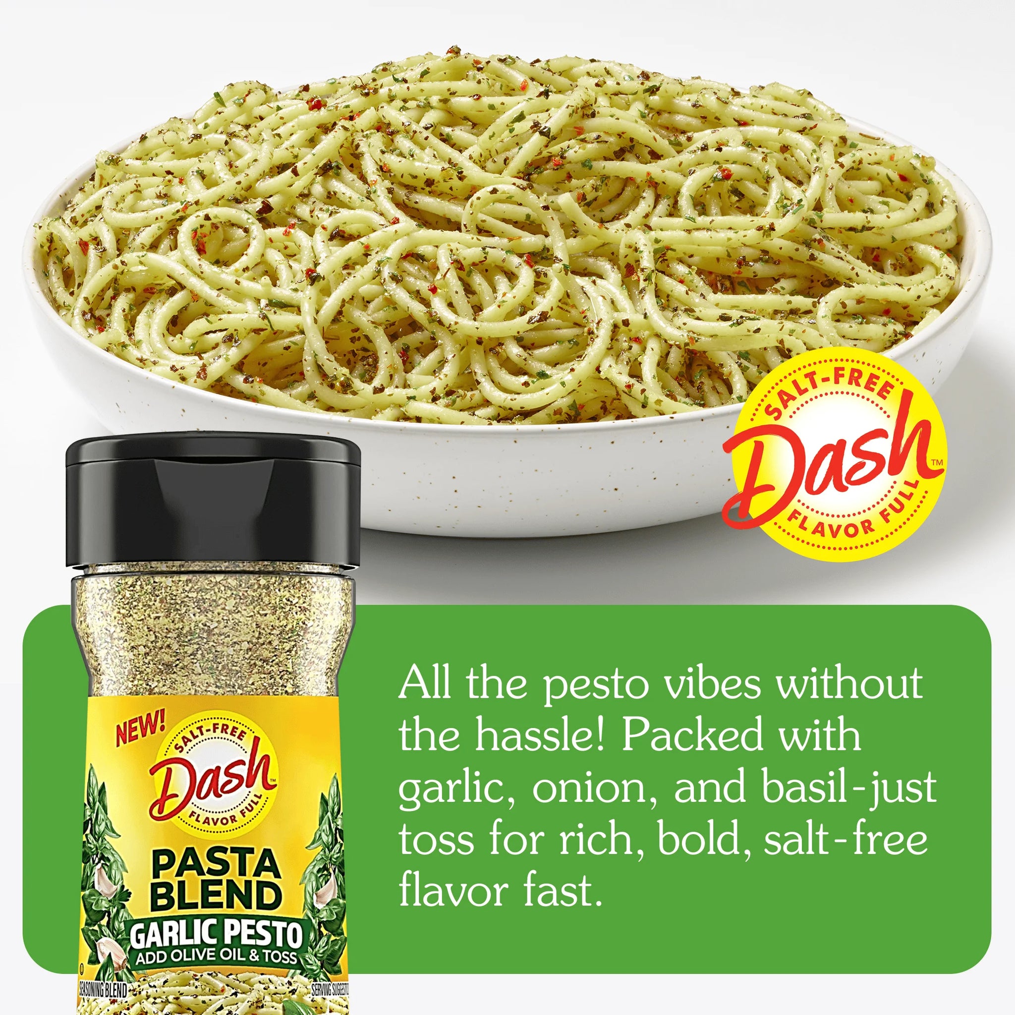 Looking for an easy way to add flavor to your meals without the added salt? Create Italian-inspired recipes with Dash Pasta Blend Garlic Pesto Salt Free Seasoning. A salt free mix of garlic, onion, basil and premium herbs that makes meal prep as easy as 1-2-3. Level up your pasta game in minutes with just three pantry staples — cook your favorite pasta, drizzle with olive oil and sprinkle Dash Garlic Pesto Pasta Blend for savory gourmet flavors. Add a protein pop with grilled chicken, shrimp or crispy chickpeas for a chef-inspired twist. Before serving, try to toss in some greens like spinach or basil for a burst of freshness. For even more flavor, cheese it up your way and grate on some parmesan or creamy burrata for an indulgent meal. Bring restaurant-quality flavor to your home with this versatile, salt free seasoning blend. Dash seasonings streamline cooking with bold, salt free flavor to help support you explore healthier cooking in a delicious way. Sprinkle this garlic seasoning blend on all your favorites for oh-so-satisfying salt-free meals in minutes!