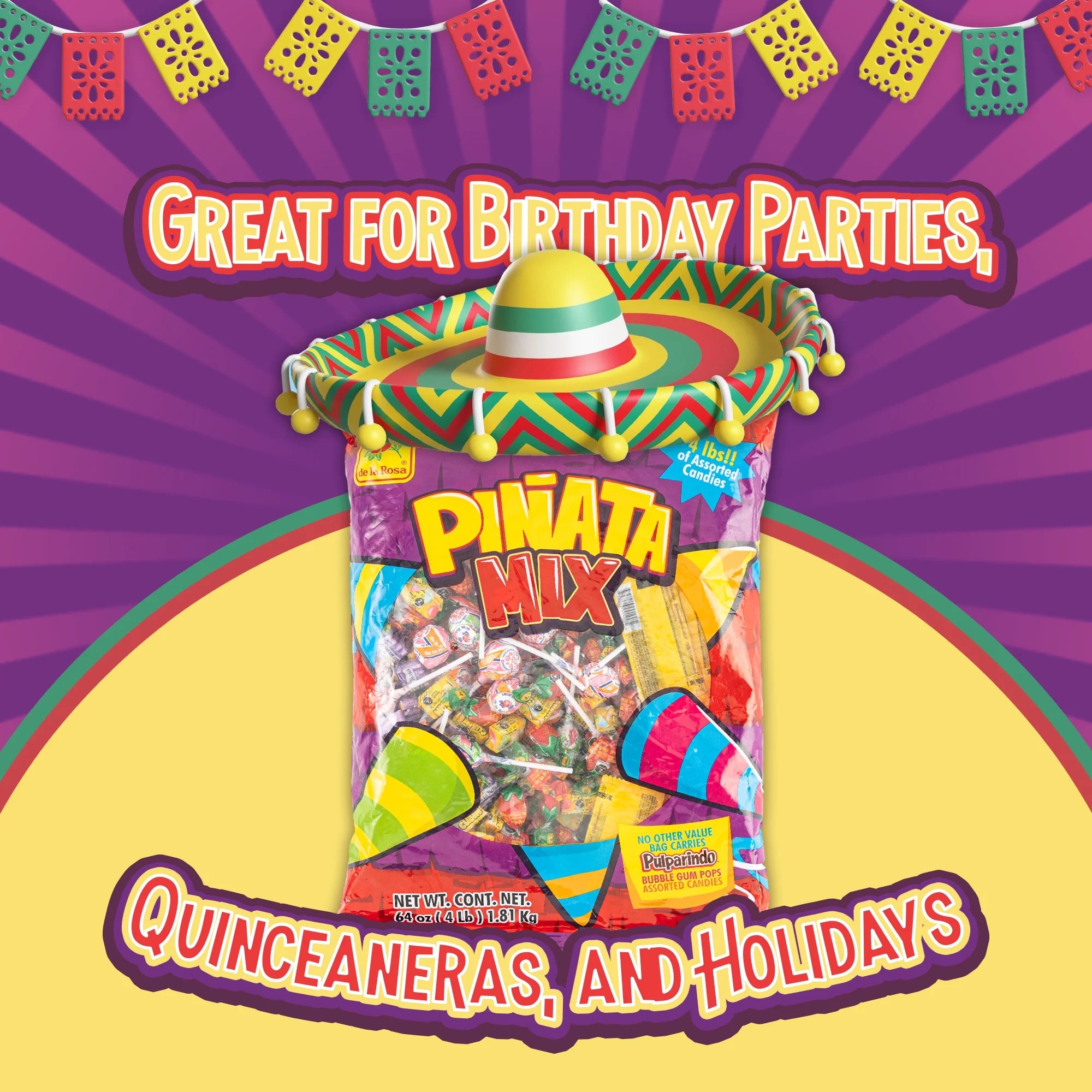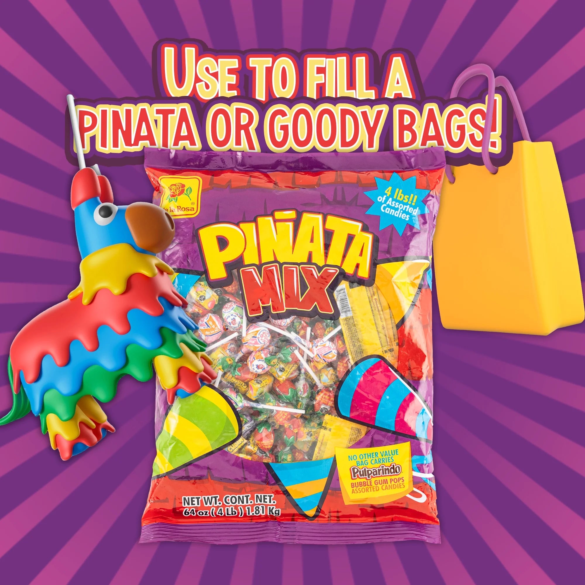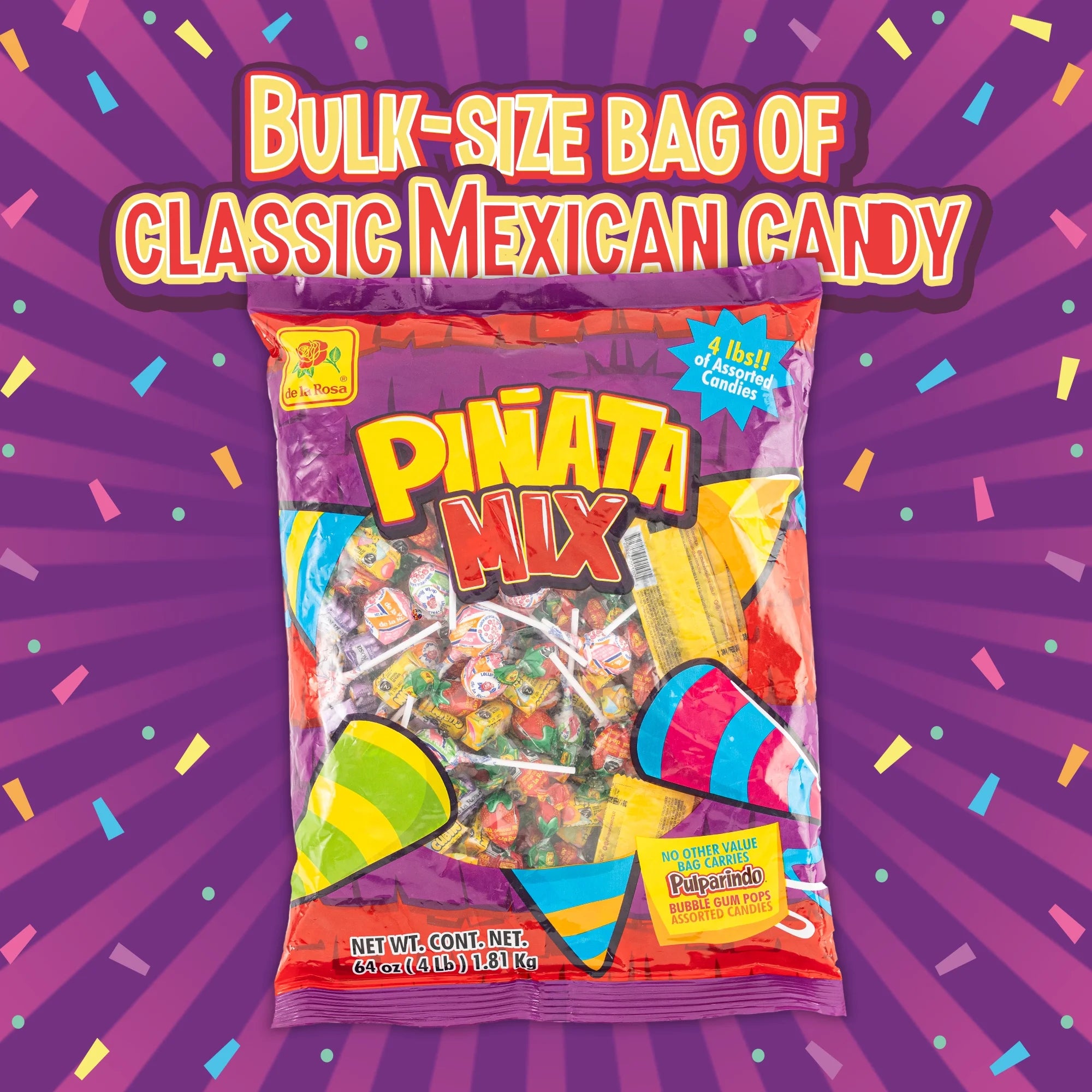 Candy, Pinata Mix, Bag 64 OZ No other value bag carries pulparindo bars, bubble gum pops, assorted candies. Includes: Mini Jumbo Lollipop; Pulparindo Bar; 4 pk Chewing Gum; Pineapple Candy; Strawberry Candy; Megagum Chewing Gum. 4 lbs of assorted candies! Product of Mexico. Keep in a cool and dry place. Mini Jumbo Lollipop/Chewing Gum/Pineapple Candy: Do not eat for sensitive people to the ingredients. 64 oz (4 lb) 1.81 kg Mexico