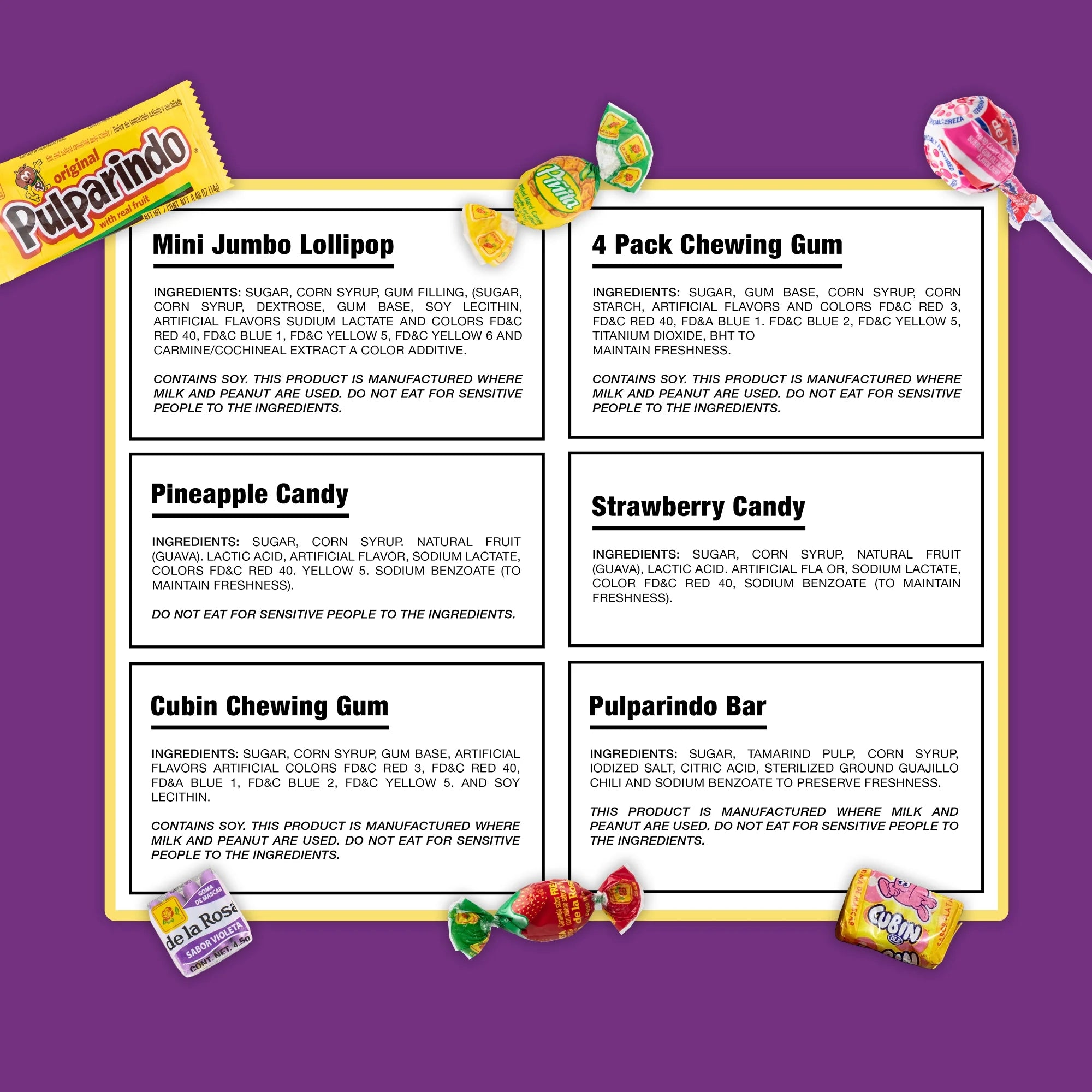 - Features a delicious assortment including Mini Jumbo Lollipops, Pulparindo Bars, 4-pack Chewing Gum, Pineapple Candy, Strawberry Candy, and Megagum Chewing Gum.